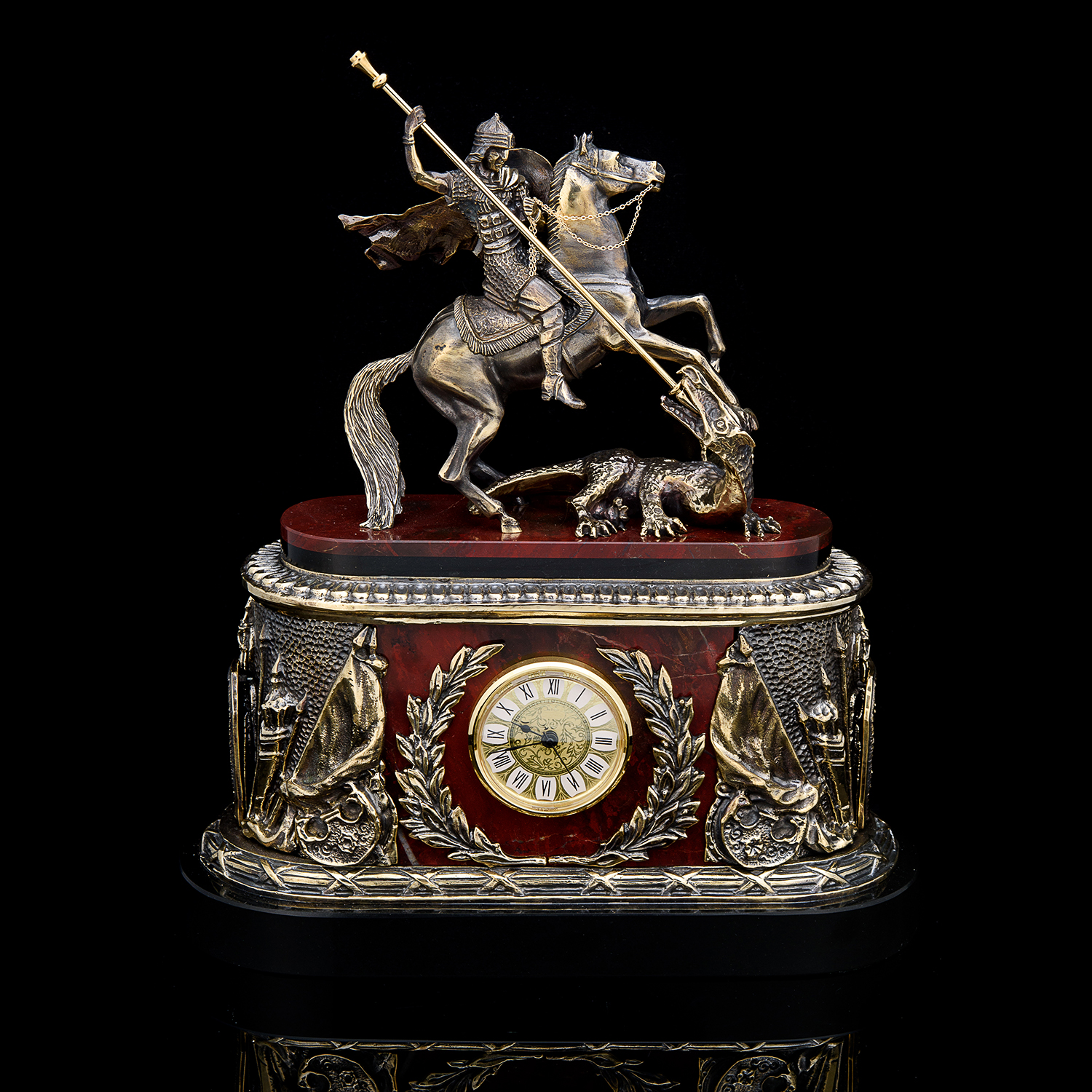 Георгий Победоносец (Святой Георгий, Георгий Каппадокийский, Георгий Лиддский) является великомучеником, почитаемым святым в христианском мире. Согласно византийскому житию, изложенному преподобным Симеоном Метафрастом, святой Георгий родился в 3 веке в Каппадокии. Поступив на военную службу, умный, мужественный и сильный Георгий стал одним из тысяченачальников и любимцем императора Диоклетиана. Во время гонений на христиан, он, будучи в Никомидии, раздал имущество бедным и объявил себя христианином. Его арестовали и жестоко пытали. Георгий перенес мучения и не отрекся от Христа. После безрезультатных уговоров отречься и принести языческое жертвоприношение, его приговорили к смерти. Ночью ему во сне явился Спаситель с золотым венцом на голове и сказал, что его ожидает Рай. Георгий позвал слугу, записавшего сказанное и велел после смерти отвезти свое тело в Палестину. Диоклетиан снова предложил истерзанному пытками отречься от Христа. Георгий не предал веру. Одно из посмертных чудес святого Георгия - убийство копьем змея (дракона), опустошавшего землю языческого царя в Берите. Когда выпал жребий отдать на растерзание чудовищу царскую дочь, явился Георгий на коне и пронзил змея копьем, избавив царевну от смерти. Многие жители после этого обратились в христианство. Иносказательно: царевна - церковь, змей - язычество, победа над «древним змием» - победа над дьяволом. Согласно преданию, святой Георгий захоронен в городе Лод, в Израиле. Часть мощей содержится в храме Сент-Шапель в Париже. Десница (правая рука до локтя) хранится в серебряной раке на святой горе Афон, в монастыре Ксенофонта (Греция).