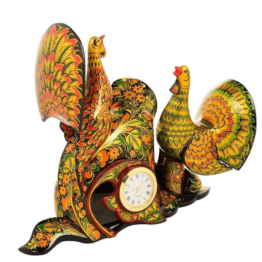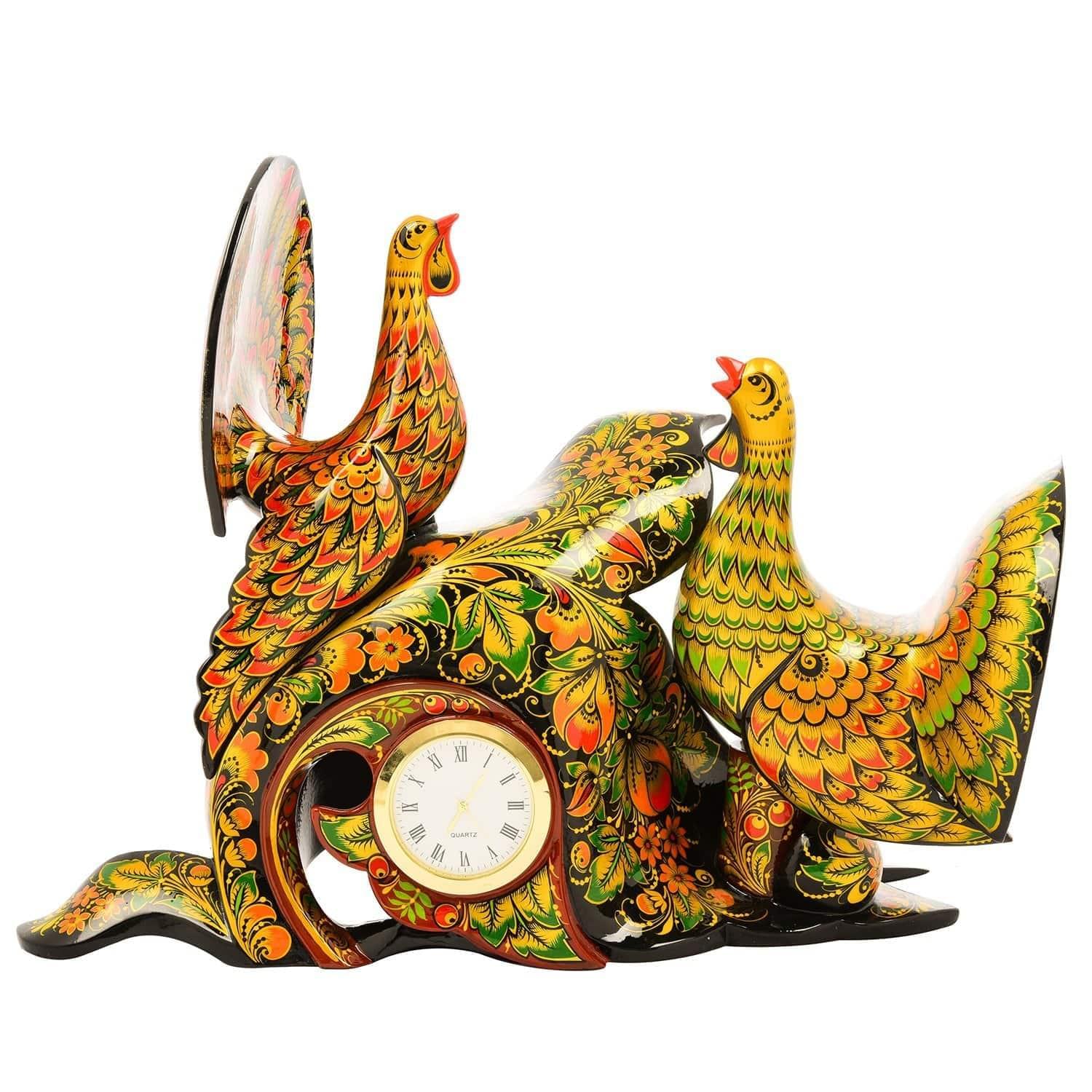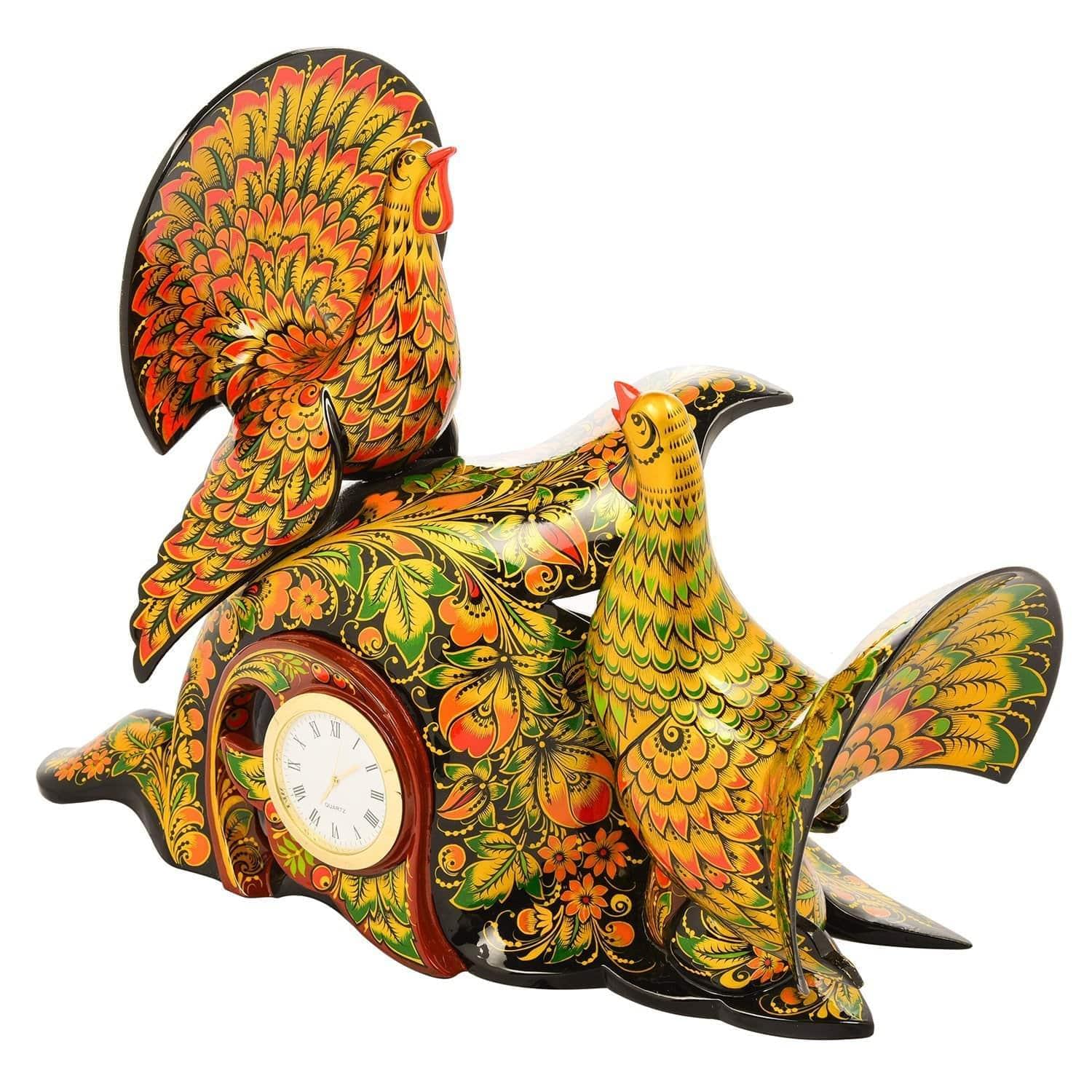 Деревянный корпус часов с двумя скульптурами птиц искусно выточен токарем по дереву из массива легкой и твердой древесины, липы, а затем оформлен высококвалифицированным художником-рисовальщиком по черному фону ярким и детальным растительно-цветочным орнаментом в хохломской технике свободно-кистевой росписи - без предварительной прорисовки рисунка.
