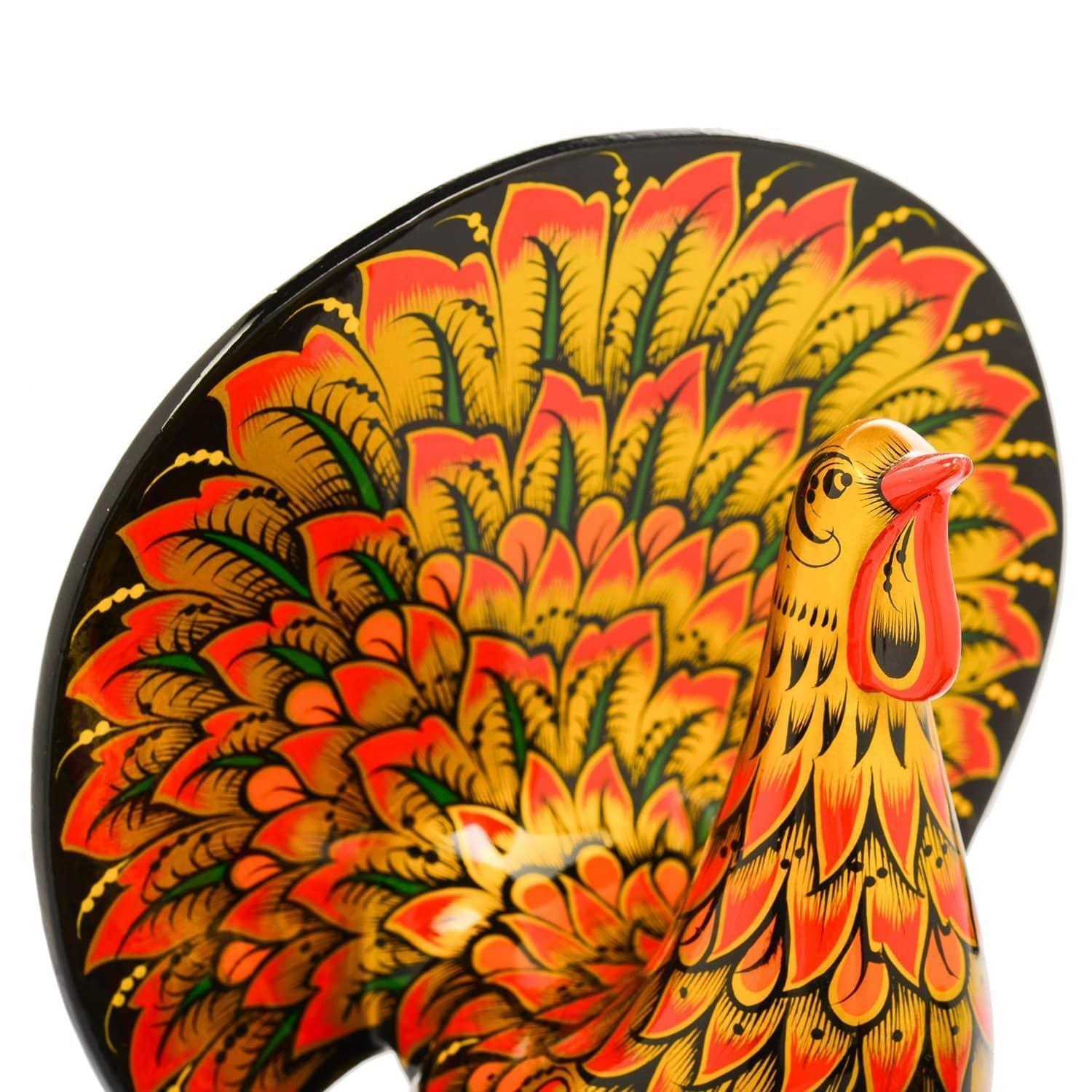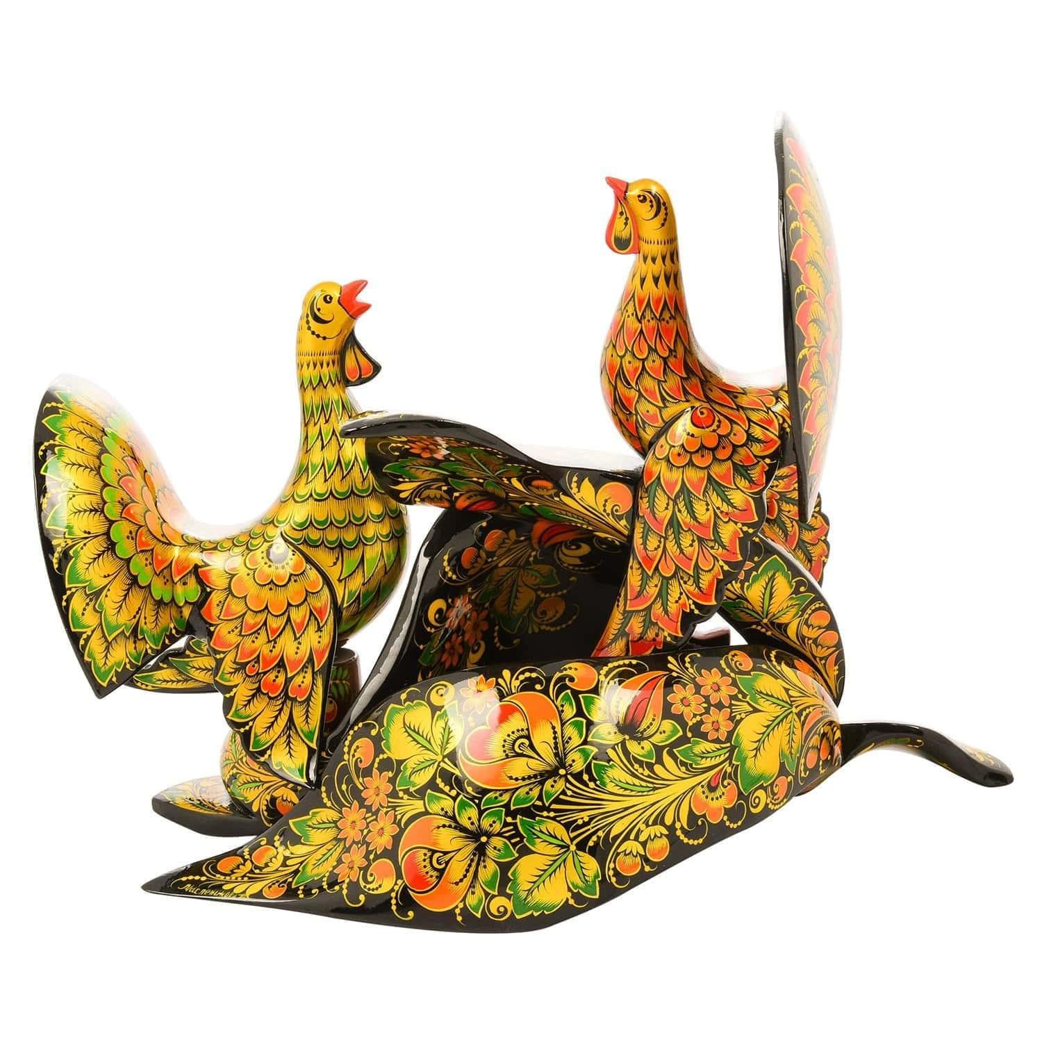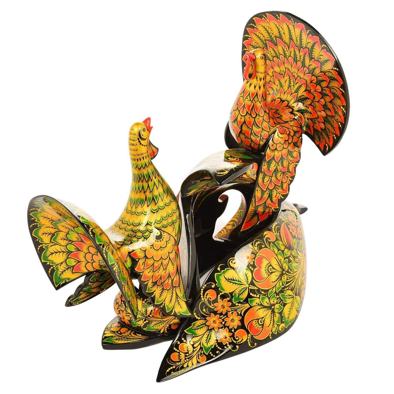 Деревянный корпус часов с двумя скульптурами птиц искусно выточен токарем по дереву из массива легкой и твердой древесины, липы, а затем оформлен высококвалифицированным художником-рисовальщиком по черному фону ярким и детальным растительно-цветочным орнаментом в хохломской технике свободно-кистевой росписи - без предварительной прорисовки рисунка.
