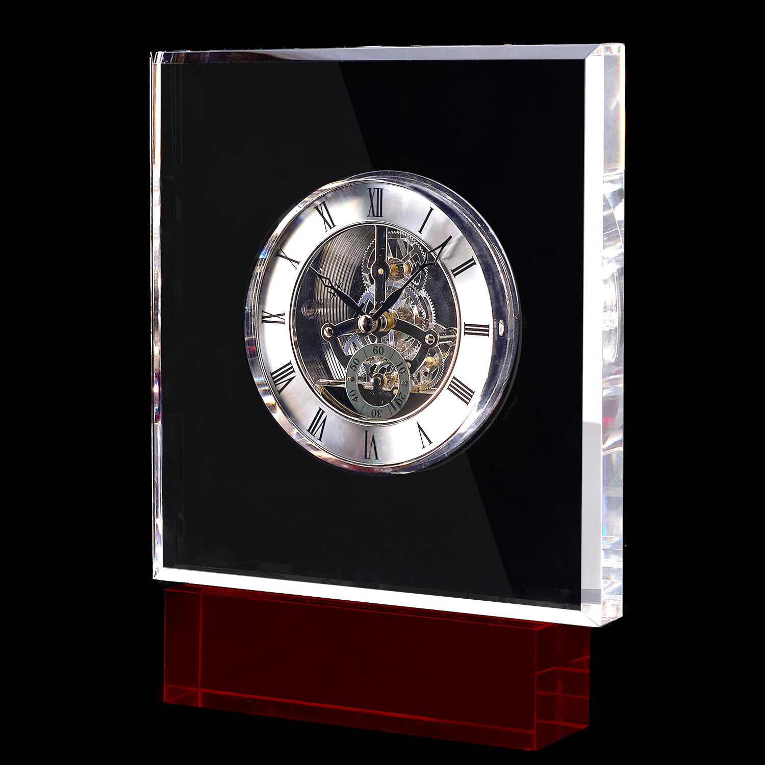 Часы покоятся на дерзком основании из насыщенного красного хрусталя, цвета страсти, власти и энергии. Этот акцент превращает функциональный предмет в главное украшение кабинета, подчеркивая безупречный вкус и яркую индивидуальность владельца. Союз прозрачности, цвета и движения.