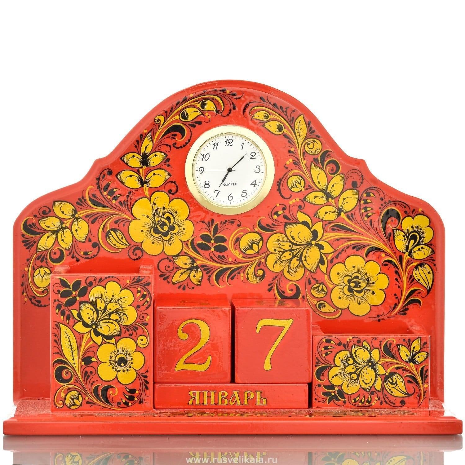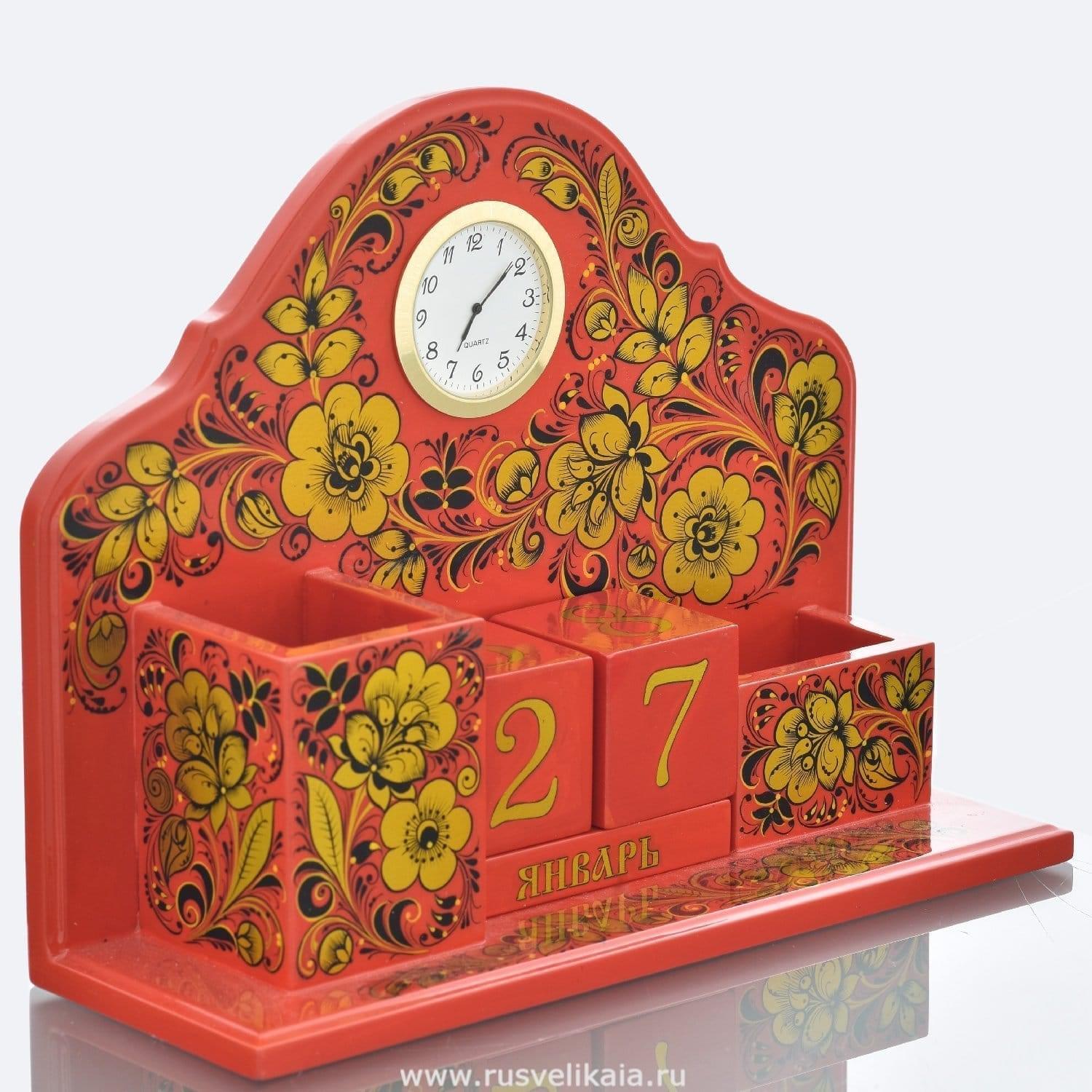 В русском доме "Русь Великая" всегда в наличие сказочные авторские подарки в русском стиле для коллег и партнеров по бизнесу. Среди них есть замечательная новинка ассортимента работы хохломских мастеров - оригинальный письменный набор с часами и календарем-конструктором "Лидер". Деревянный корпус аксессуара украшен растительным орнаментом, к нему прилагаются съемные элементы с обозначенными на них месяцами и цифрами.