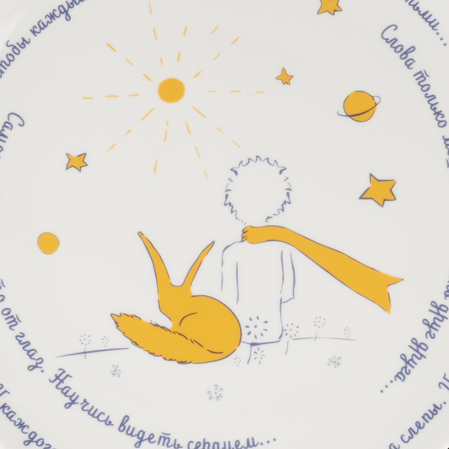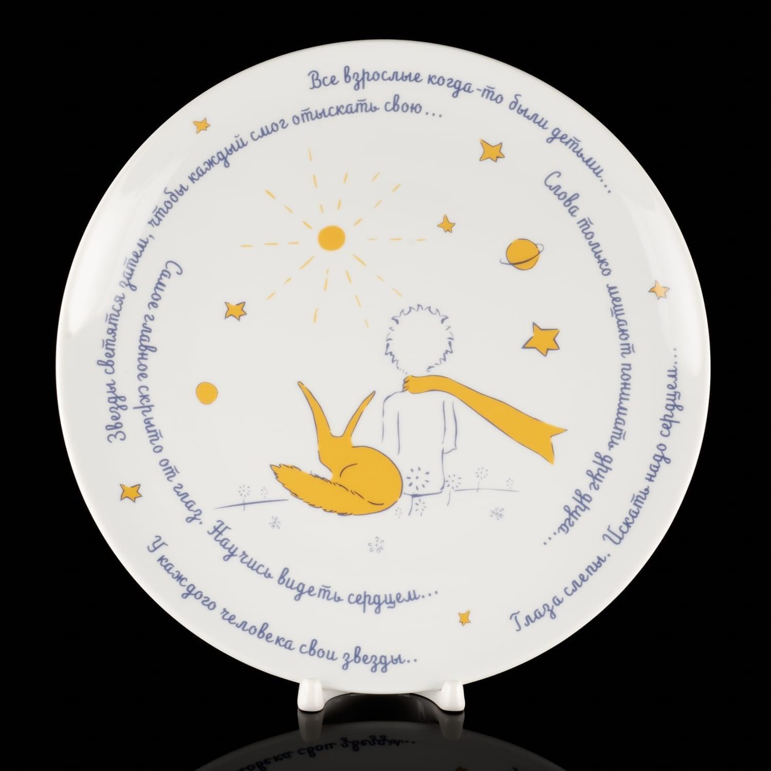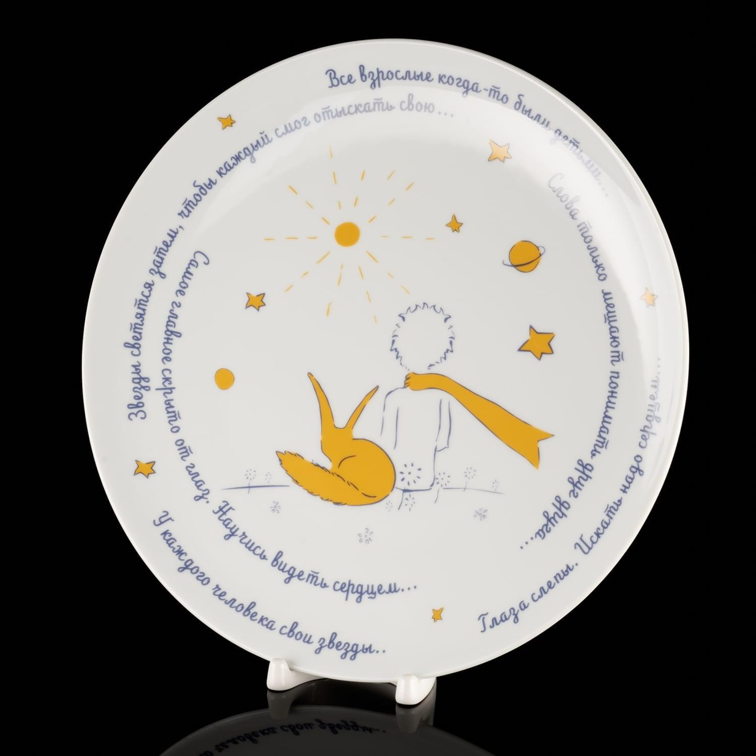 Идея тарелки навеяна мудростью «человечной» притчи французского писателя Антуана де Сент-Экзюпери, просто и пронзительно рассказывающей о дружбе, любви, долге, верности, красоте и нетерпимости к злу. «Все мы родом из детства», - напоминает автор. А еще призывать жить, «искать сердцем», так как «глаза слепы». Его сказка для взрослых получилась легкой и доброй, несмотря на нотки грусти и недетской глубины. Персонажи имеют реальных прототипов. Принца Антуан «списал» с маленького себя, Лиса - с близкой подруги, Розу - с капризной и чувствительной как садовая роза супруги. Иллюстрации подготовил сам Экзюпери: мальчика с желтой шевелюрой; милых барашка и слоненка; лиса с острыми, похожими на заячьи ушами. Из популярных цитат: «У каждого человека свои звезды...». «Слова только мешают понимать друг друга...». «Вот мой секрет, он очень прост: зорко одно лишь сердце. Самого главного глазами не увидишь». «Слова только мешают понимать друг друга». «Самое главное скрыто от глаз. Научись видеть сердем...».