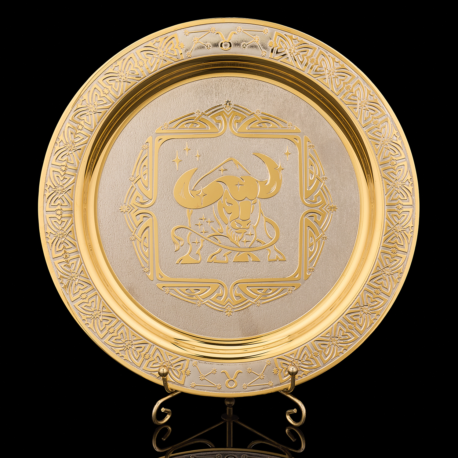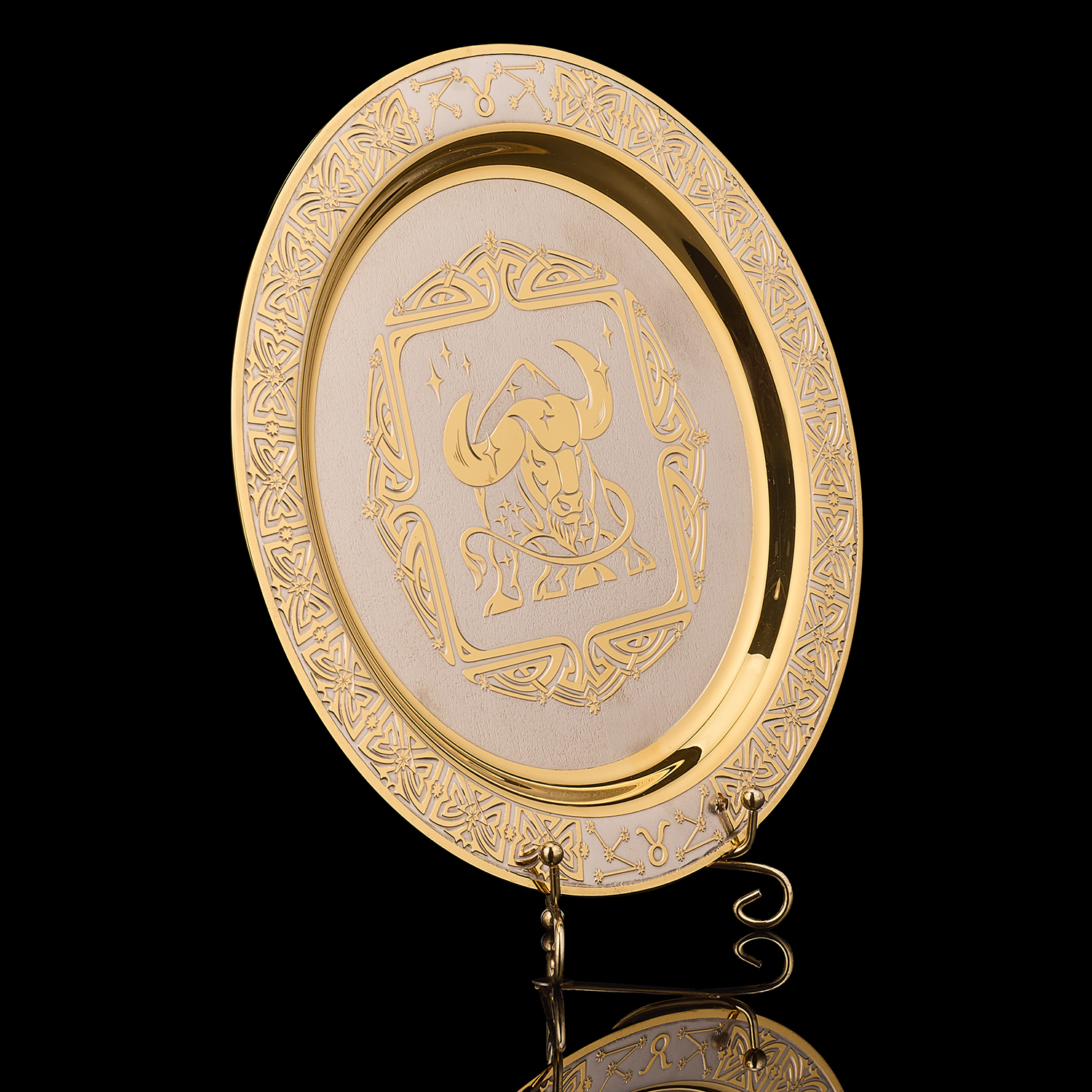 Тарелка декоративная с позолотой "Знак зодиака Телец". Златоуст.