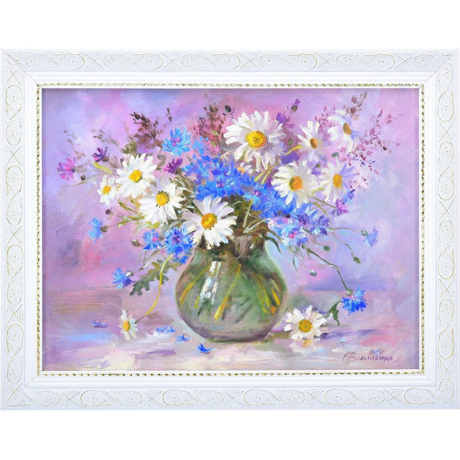 Предлагаемая картина-натюрморт представлена в Галерее подарков как образец масляной живописи. Обрамлена в раму из белоснежного багета, цвет которого красиво контрастирует с сиреневым фоном на холсте. Авторская работа, картина "Ромашки и васильки" - это универсальный вариант подарка-сувенира на Свадьбу, День рождения. общий или личный праздник.