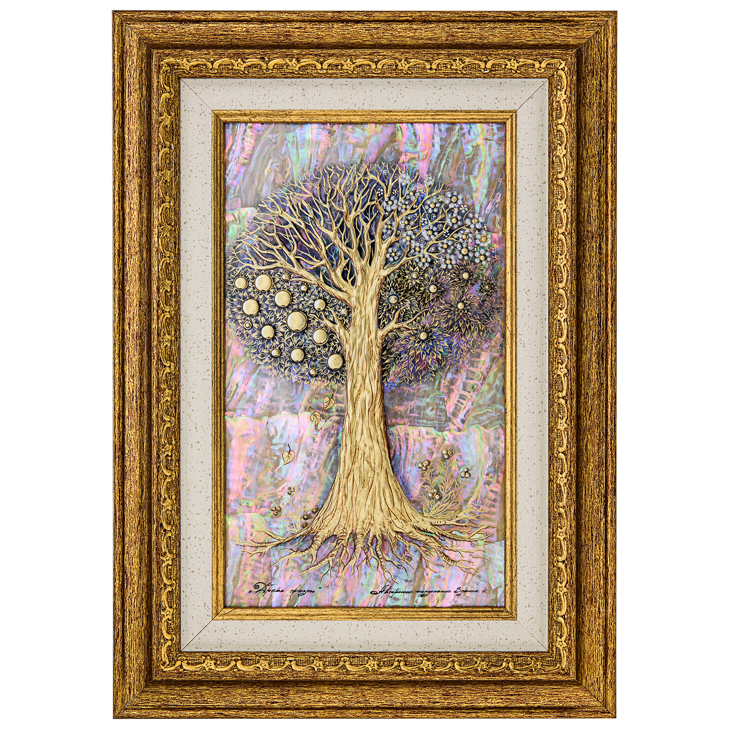 Материалы: перламутр, грунт, акрил, позолота, темпера, деревянный багет.