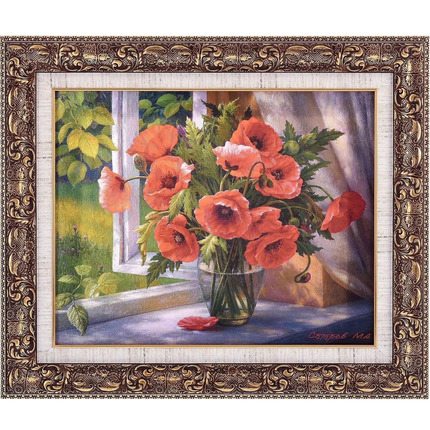 Крупного формата картина написана на холсте и обрамлена в позолоченную раму из классического багета с легким винтажным эффектом. Авторская картина репродукция "Маки" - это классический вариант подарка на Новоселье, Свадьбу, Юбилей, общий или личный праздник.