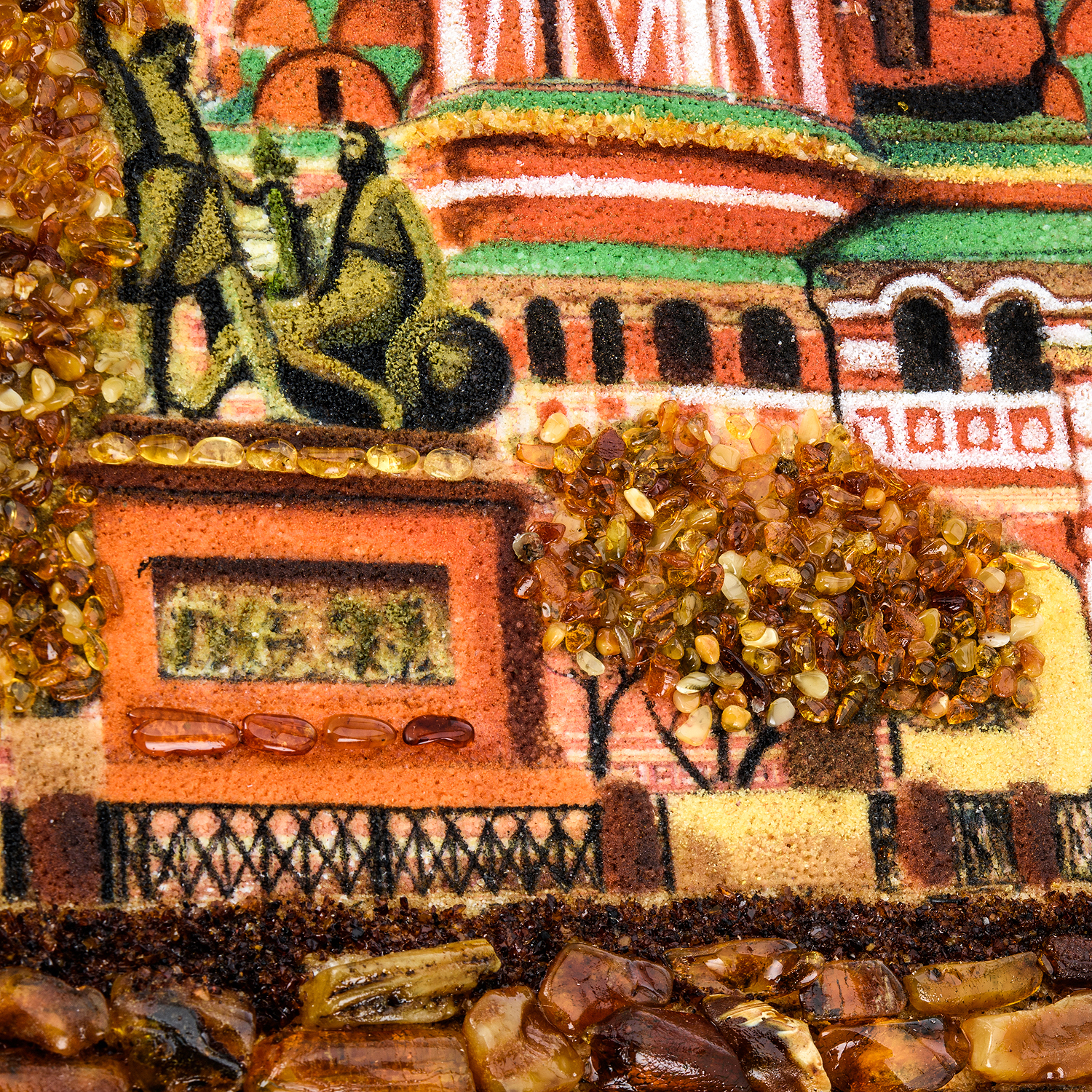 Картина «Янтарный храм Василия Блаженного» Это уникальное произведение искусства, созданное из разноцветной янтарной крошки и инкрустированное натуральным балтийским янтарём, изображает знаменитый собор на Красной площади. Многослойная техника и игра оттенков янтаря передают глубину и сияние архитектурных форм: переливы золотистых, медовых и терракотовых тонов оживляют купола, стены и декоративные элементы храма. Ручная работа подчеркивает детализацию мозаики, создавая эффект живого свечения и объёма. Картина размером 30×40 см сочетает в себе традиции русской культуры с роскошью природного материала, превращаясь в символ исторического наследия и мастерства художников.