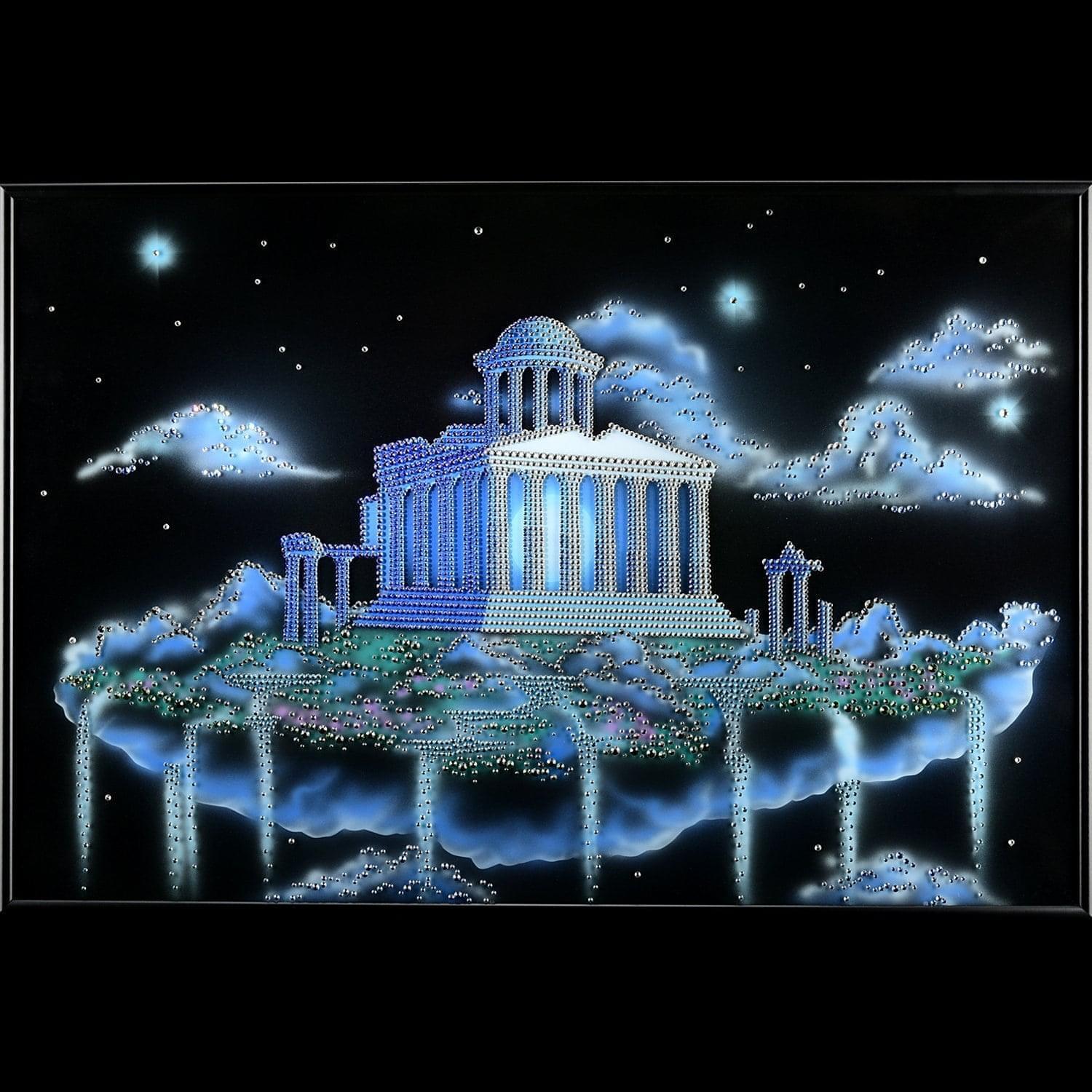В уголке Вселенной есть уютная земля обетованная - затерянный в невесомости мир с большим домом, цитаделью. Ее верхушка утопает в веренице космических облаков, а фундамент зиждется на просторном облаке. Космический пейзаж с атмосферой вселенской идиллии воссоздан художником на иссиня-черном фоне этой более чем полуметровой картины, которая инкрустирована кристаллами Сваровски.