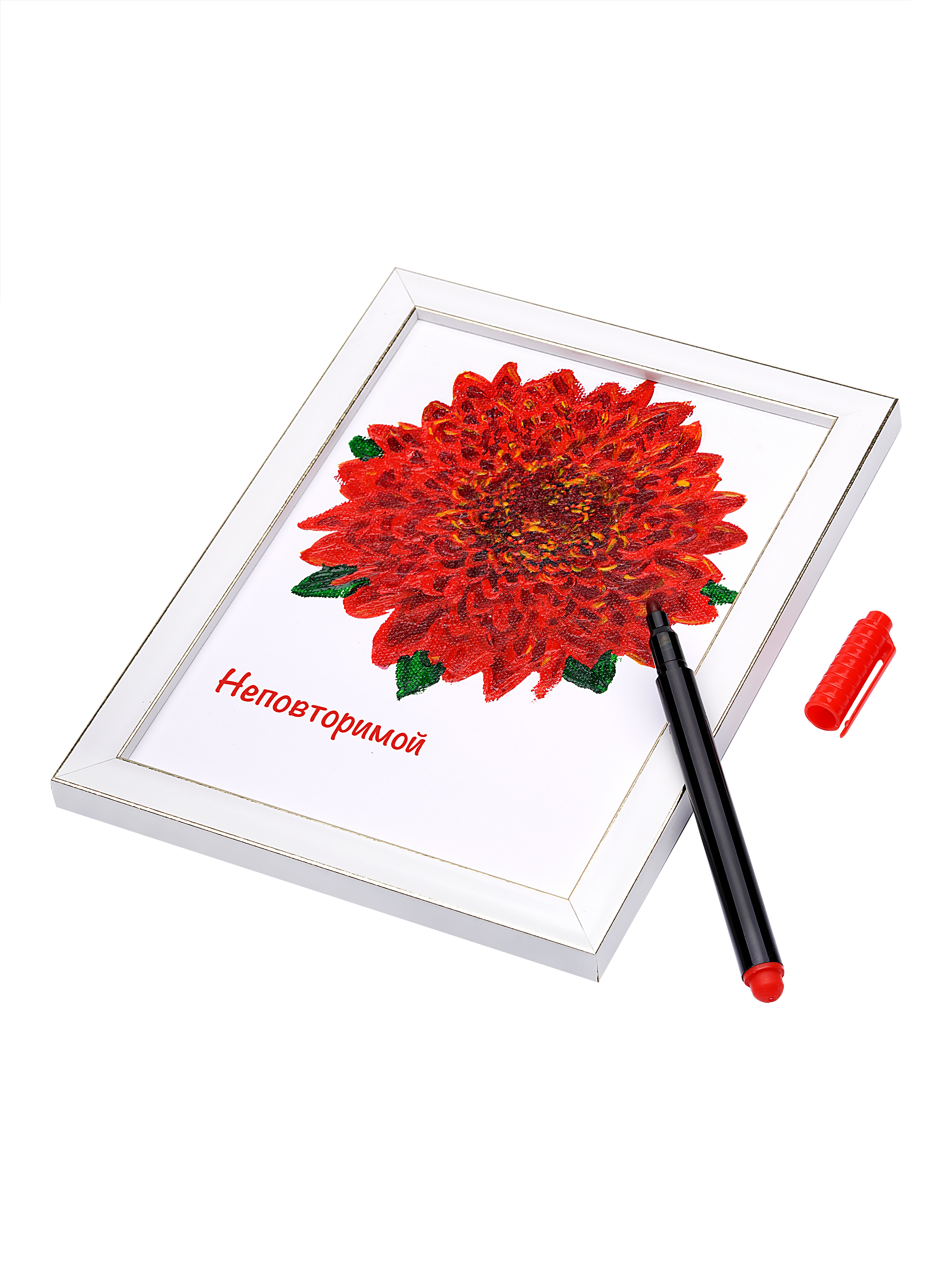 Рисунок выполнен художником на холсте, поздравительный текст можно добавить, воспользовавшись маркером или фломастером. Открытка снабжена рамкой, которая позволяет установить ее на стол или повесить на стену. В качестве упаковки прилагается конверт из непрозрачного матового пластика.