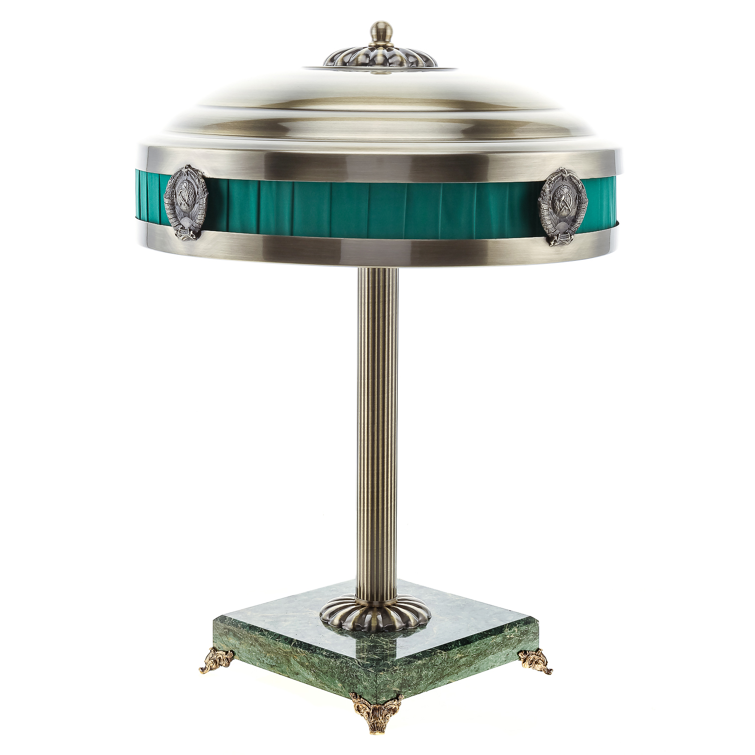 Лампа в стиле сталинский ампир выразительная примета времени, когда миром правили вожди. Актуальна она и сегодня! Круглый абажур с гербом СССР и основание в виде квадрата из змеевика соединены стойкой-цилиндром, тонированным золотом.