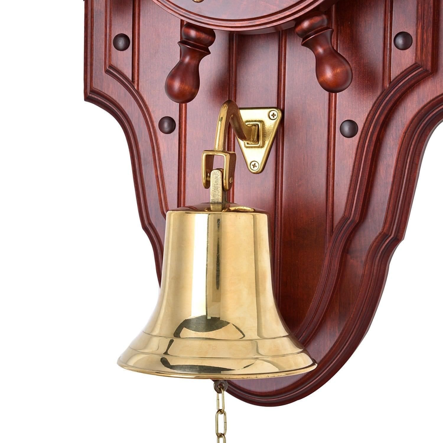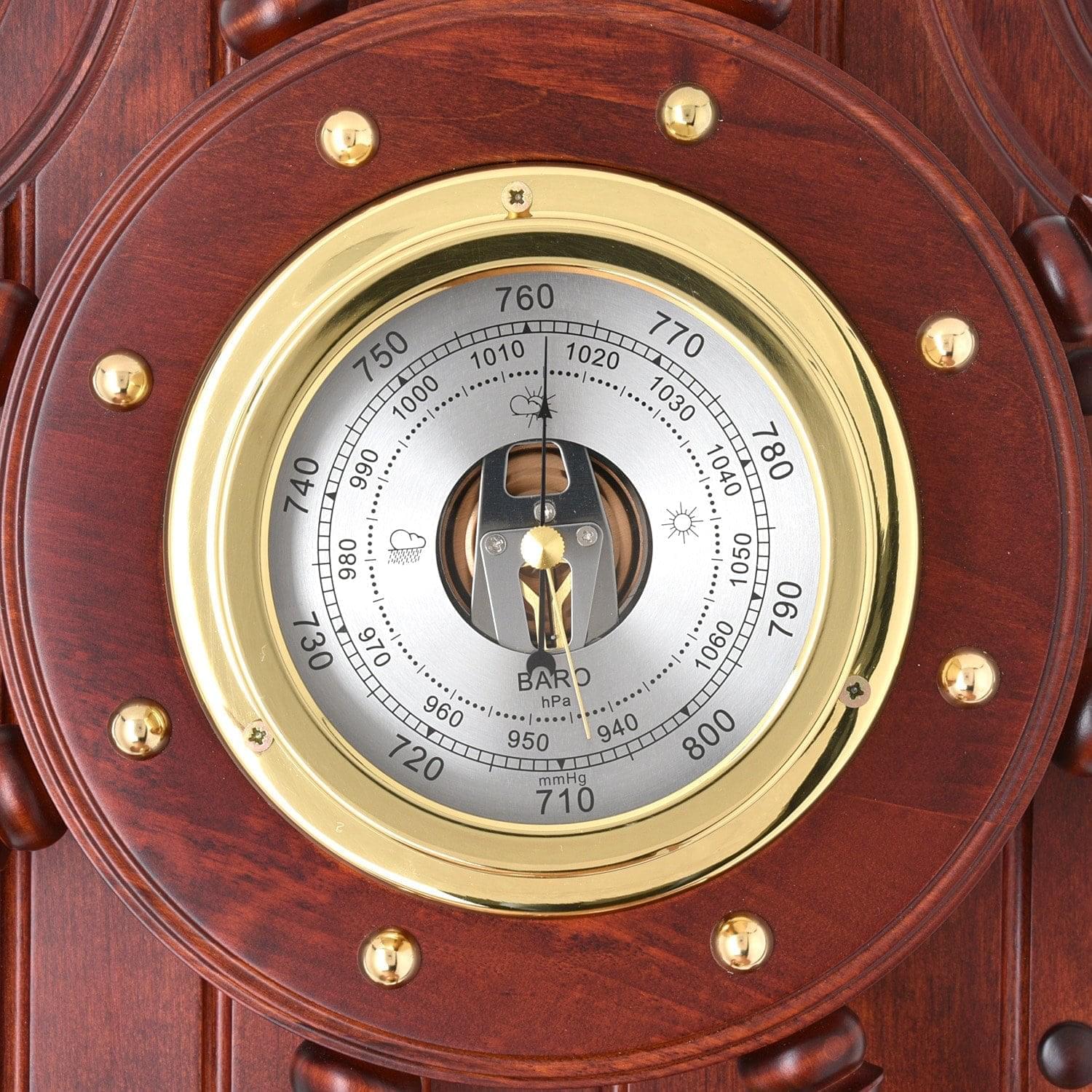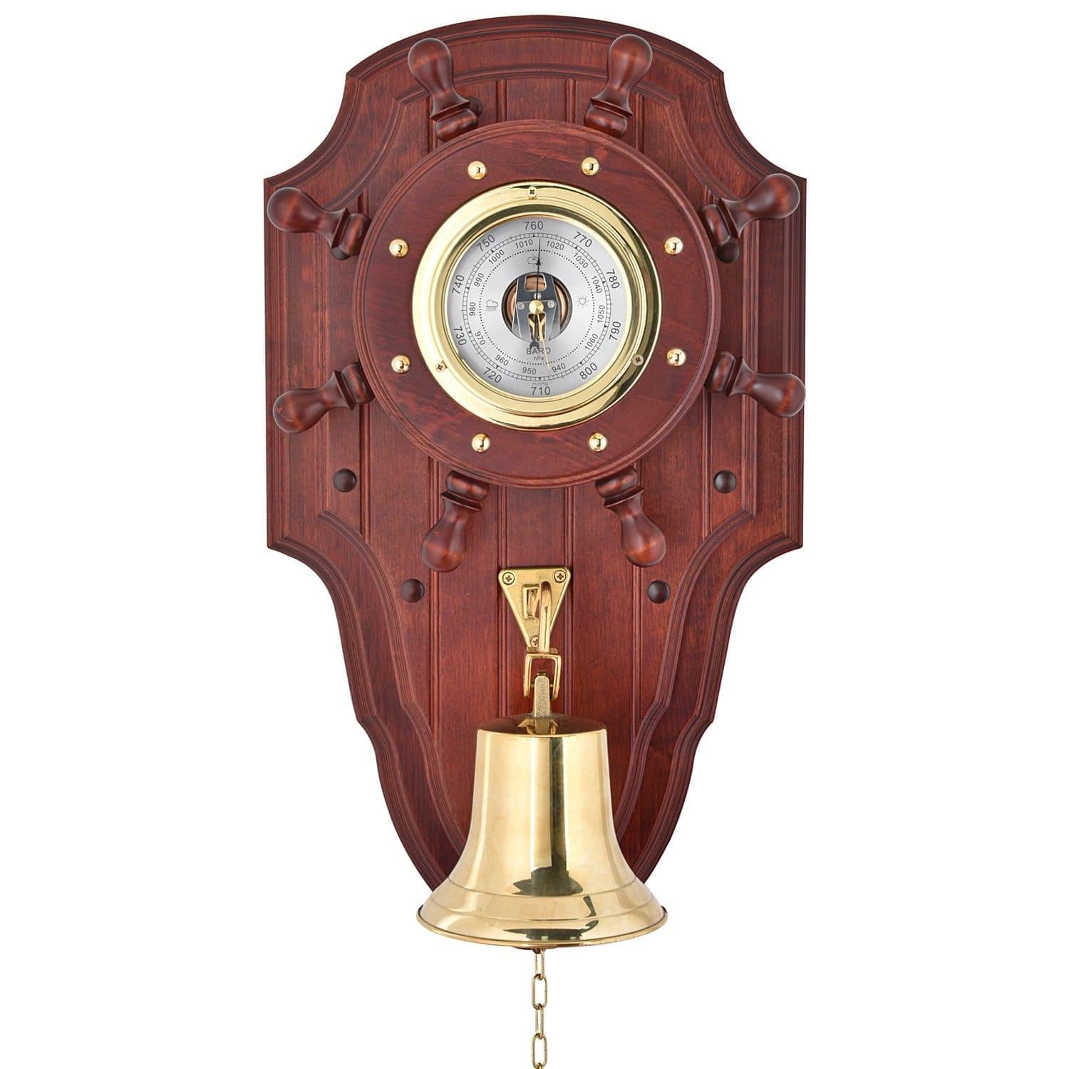 Барометр представлен в рамках настенной композиции с судовым колоколом рындой как образец предметного дизайна с коллекционной ценностью. Более полуметра в высоту! Прибор для измерения атмосферного давления, барометр, вмонтирован в корпус из древесины ценной породы и представлен на поверхности круглым циферблатом в позолоченной оправе. Поверхность корпуса оформлена в техниках резьбы по дереву; вокруг циферблата закреплены декоративные болты. Судовой колокол рында, предвестник шторма и талисман для мореплавателя, отлит из латуни и тонирован эффектной позолотой. Он подаст голос за счет цепочки, прикрепленной к языку, и поможет принять решение в пиковые моменты жизни. Барометр позволит всегда быть в курсе атмосферных изменений. Он украсит интерьер яхты и дома, привнесет в него элегантный стилистический акцент.