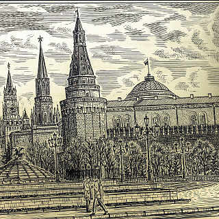 Офорт черно-белый «Кремль. Васильевский спуск» 15х19 см