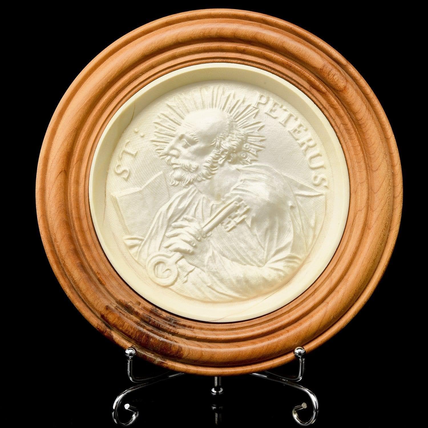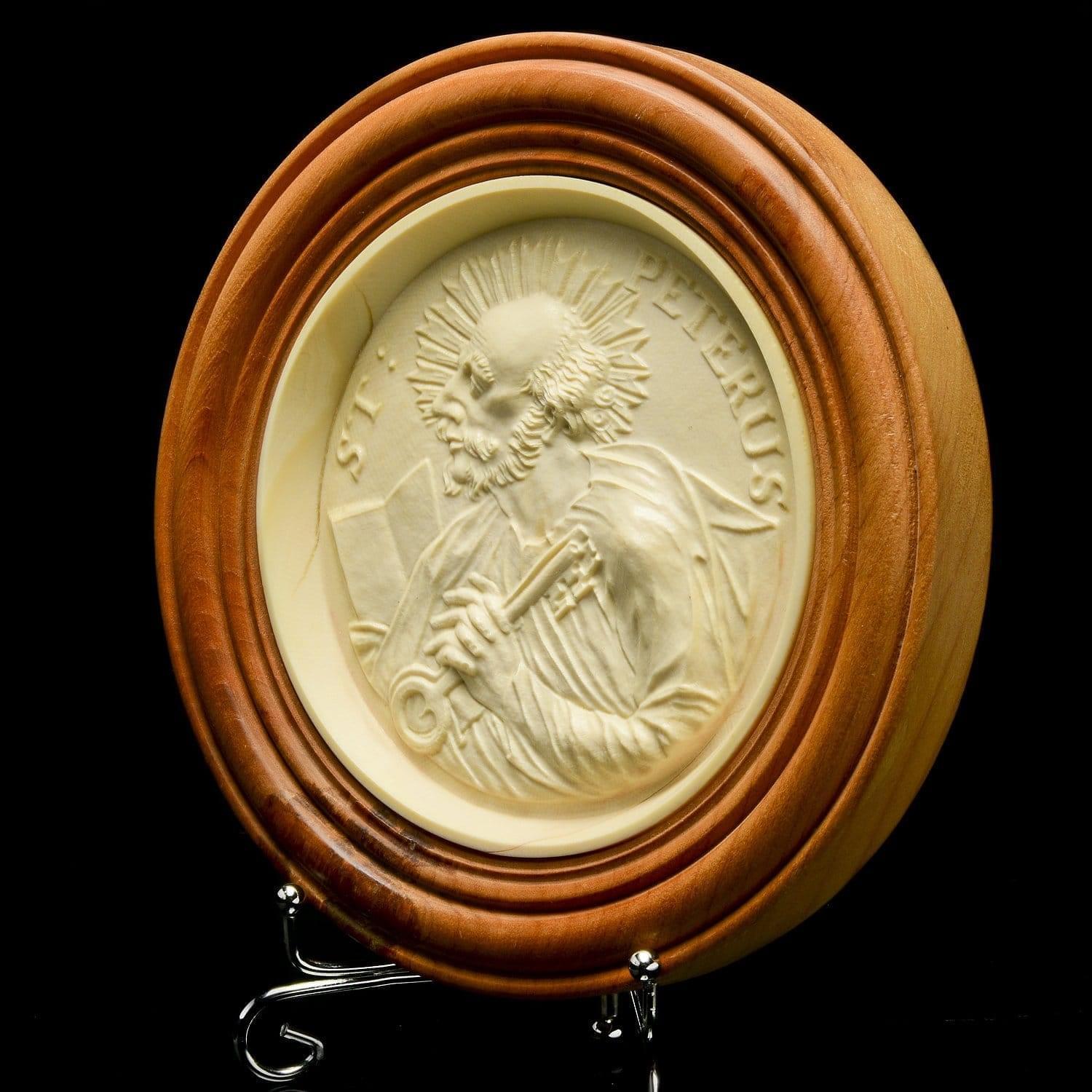 Это эксклюзивный образец старинного русского народного промысла, резьбы по кости и vip-подарок - медальон с образом Святого Петра, одного из 12 учеников (апостолов) Иисуса Христа. Образ воссоздан с рельефа 1721 года при участии скульптора Валерии Мокеевой. Перед Вами - уникальный интерьерный аксессуар, который изготовлен кустарным способом из бивня мамонта, умершего около 10 000 лет назад. Медальон заключен в круглую раму, выточенную из древесины вишни.