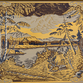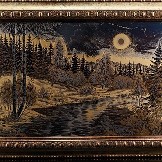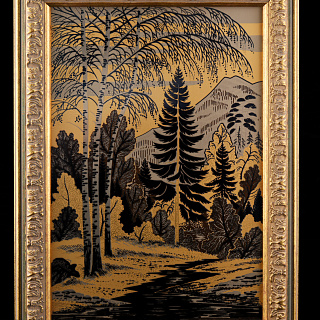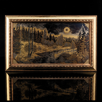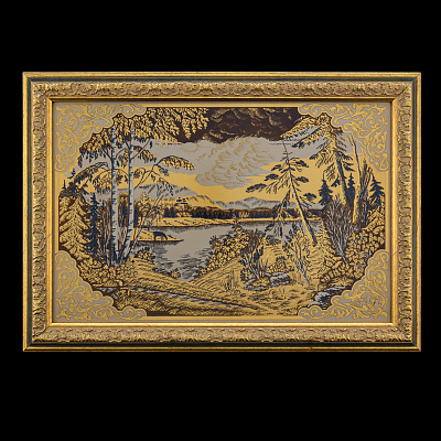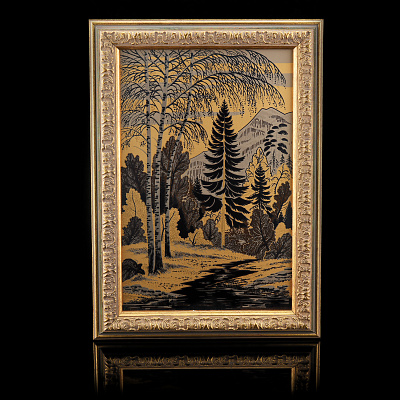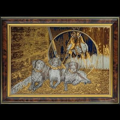 Панно-гравюра «Охотники на привале». Златоуст 36х26 см