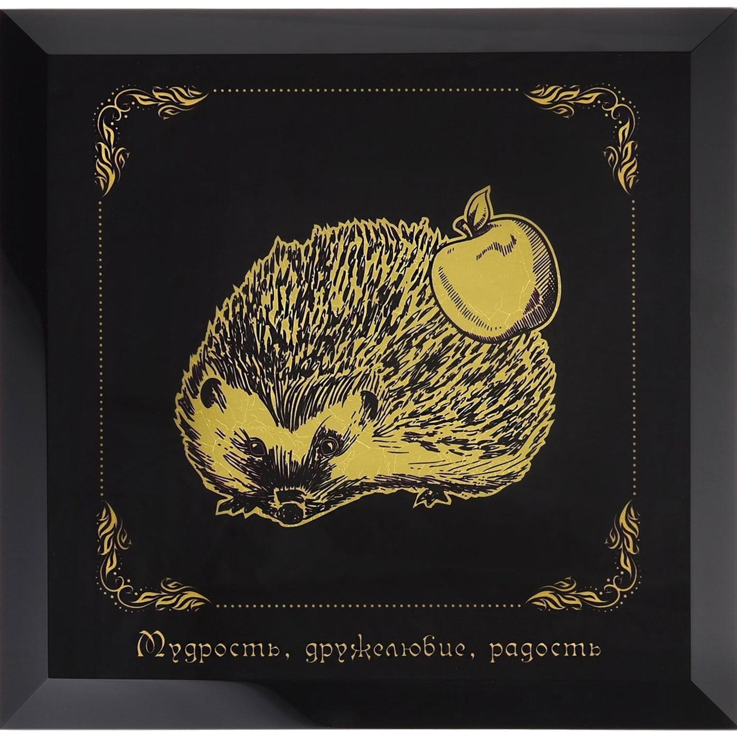 Элегантное панно в форме черного квадрата, геометрического символа стандарта, порядка и идеала, с задумчивым образом Ежа и подпись-кредо представляет яркий интерьерный аксессуар. Черный оттенок твердого стекла и эффектное сияние позолоты - классическое цветовое сочетание, призванное создать мистическую атмосферу в интерьере. Ежик олицетворяет дружелюбие и оптимизм. Изображение выполнено сусальным золотом в виде тончайших листов золота, традиционно используемых для декора и создания художественных композиций. Технологически процесс сравним с рождением иконы.