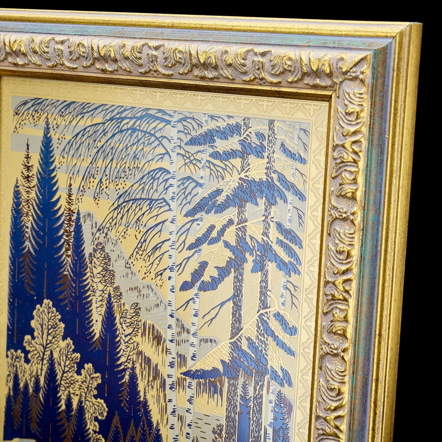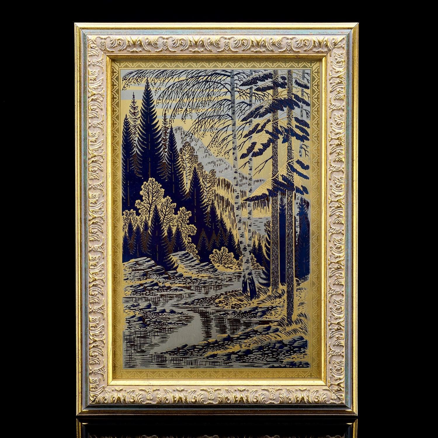 Традиционная гравюра на металле – неотъемлемая часть Златоустовского промысла. В прошлом златоустовские мастера занимались изготовлением и декорированием холодного оружия. Сегодня уральские мастера наряду с оружием производят великолепную посуду и предметы интерьера. Яркий пример проявления таланта специалистов из Златоуста – великолепная гравюра «Безымянный ручей», выполненная в лучших традициях златоустовской гравюры на металле с использованием травления, золочения, никелирования, синения. Скрупулезная работа позволила художникам создать живую, динамичную картину. Картина станет отличным подарком, дополнит любой интерьер и подчеркнет уточненный вкус владельца.
