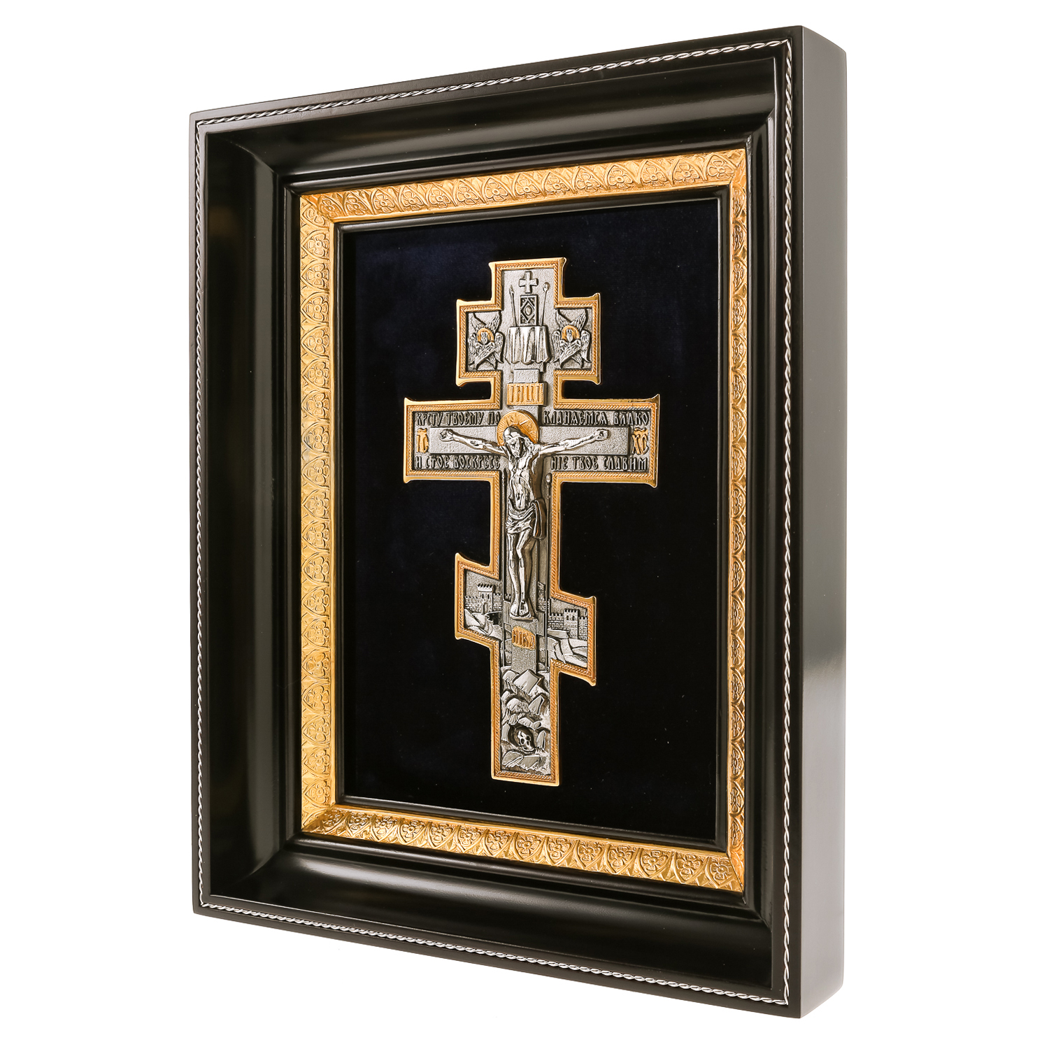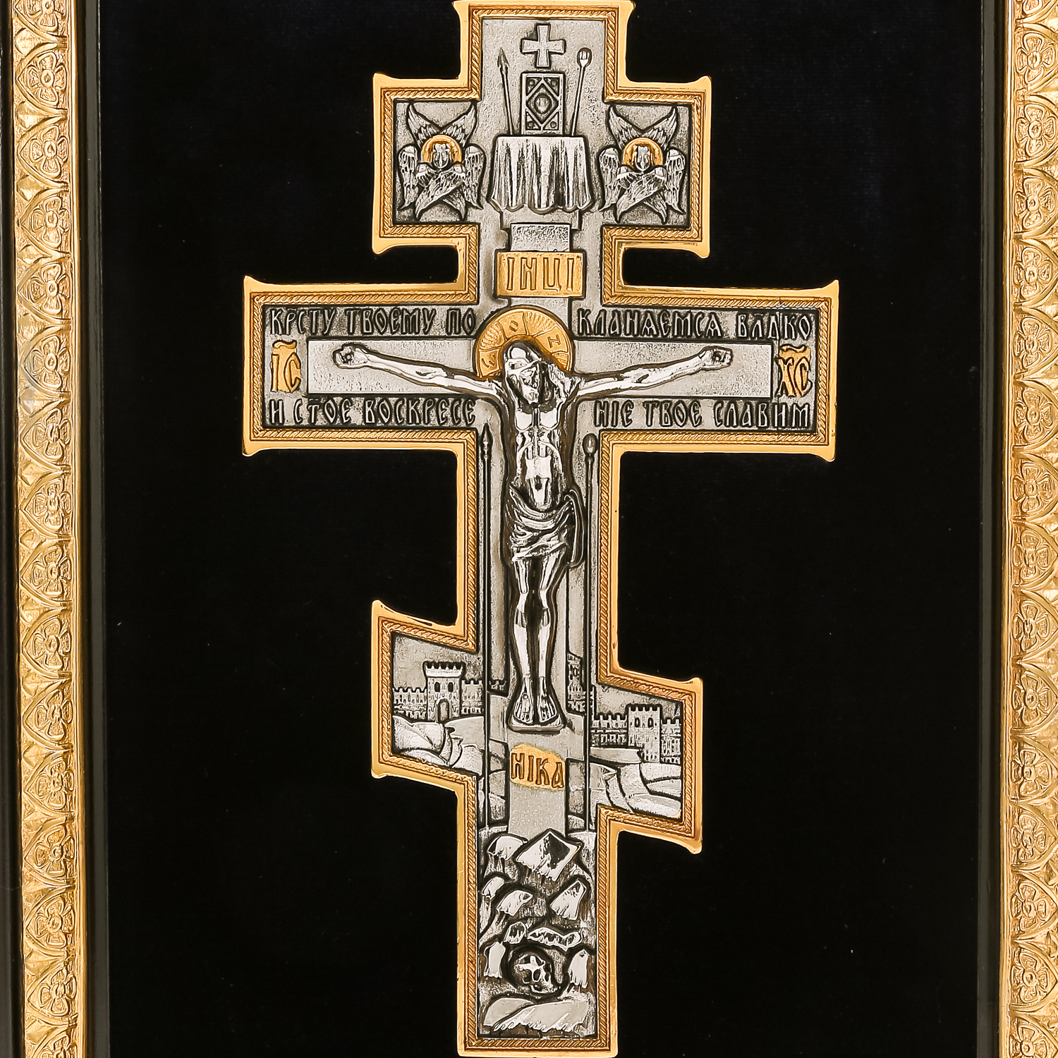 Панно является произведением ручной работы. Крест выполнен из меди, обработанной в технике гальванопластики, с гальваническим покрытием золотом и серебром. Рама резная, изготовлена из массива лиственных пород древесины и покрыта атмосферостойким лаком.