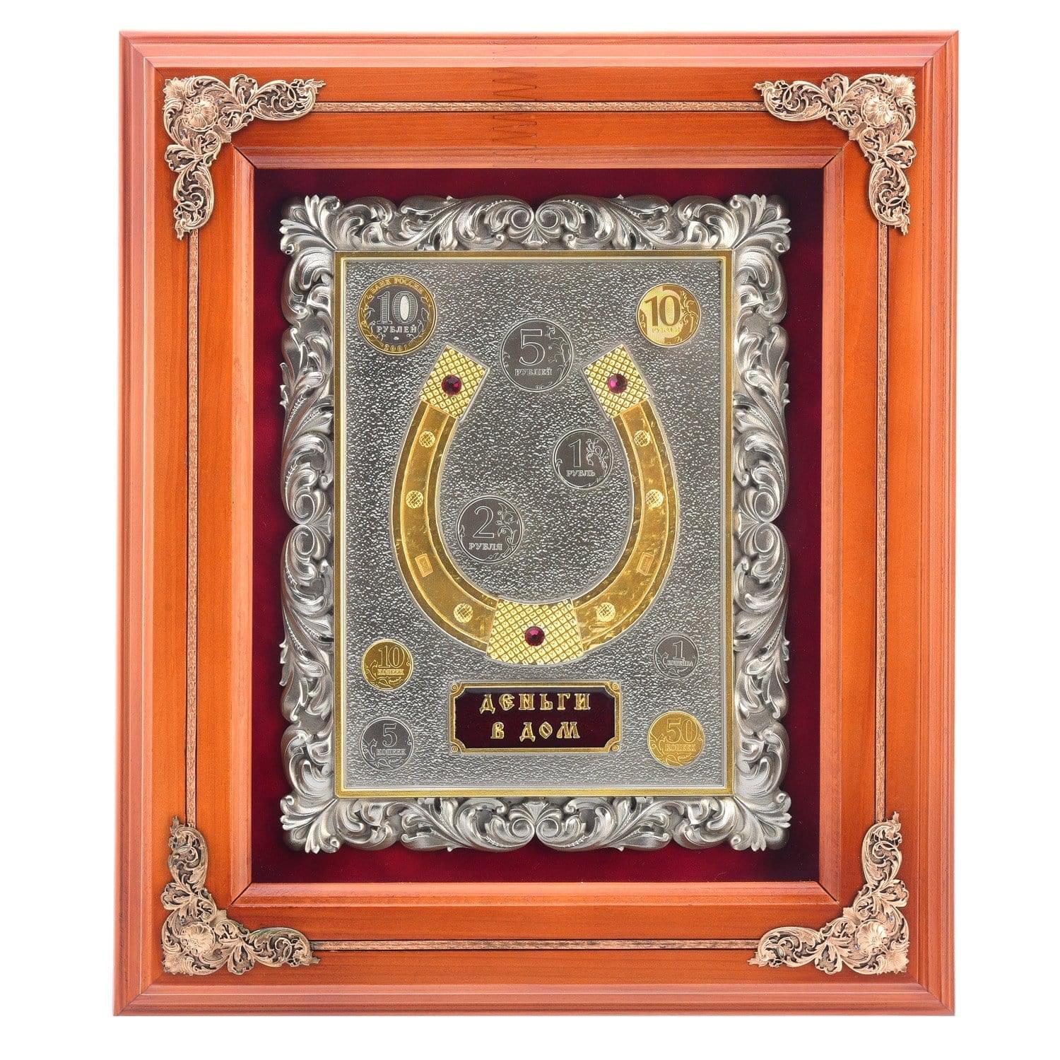 Роскошное настенное панно ключница с элегантным авторским дизайном пополнило богатую коллекцию интерьерных украшений «Руси Великой». Основная декоративная композиция панно выполнена методом гальванопластики по оригинальному авторскому эскизу. В центр композиции мастер поместил подкову, подбитую ярко-алыми декоративными камнями, и россыпь монет. В самом низу композиции художник поместил надпись на приятном вишневом фоне «Деньги в дом». Обрамляет композицию красивая рамка в виде объемного растительного узора. Оформлено панно в роскошную раму приятного орехового цвета из натурального дерева. По углам рама декорирована элегантными вставками в виде узорных аппликаций.