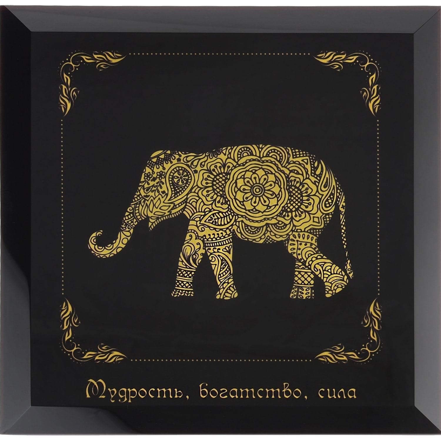 Элегантное панно в форме черного квадрата - геометрического символа стандарта, порядка и идеала, - с задумчивым образом восточного Слона и подпись-кредо представляет собой символичный интерьерный аксессуар и запоминающийся вариант мужского подарка. Черный оттенок твердого стекла и эффектное сияние позолоты - классическое цветовое сочетании, которое призвано создать мистическую атмосферу в интерьере.