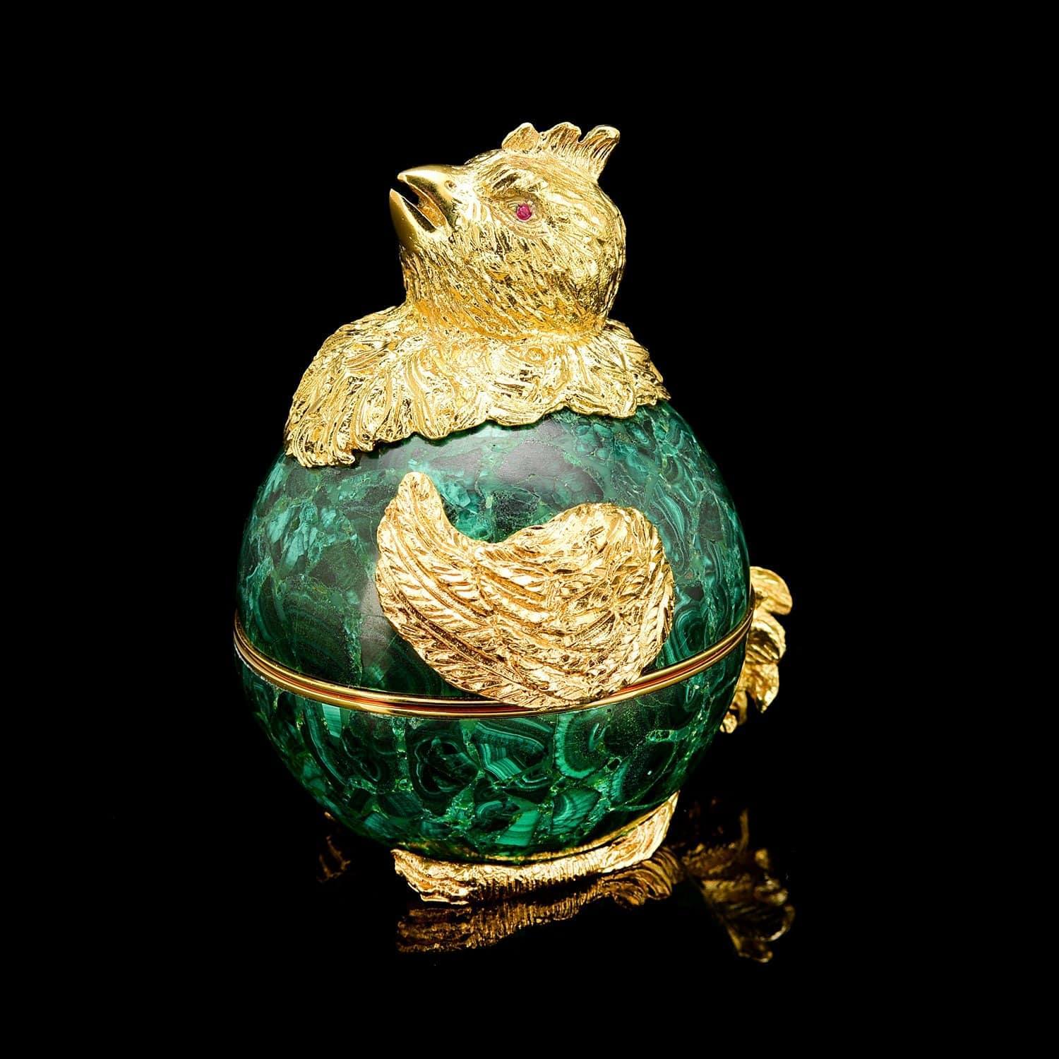 Шкатулка авторского дизайна в виде цыпленка - символа Солнца и духовного возрождения - привносит элегантный и затейливый акцент в убранство классического интерьера. Являясь воплощением авторской фантазии и классики, ее гармонии и изящества, эта маленькая вещь несет в себе эстетику минувших эпох. Яркая позолота в сочетании с насыщенным оттенком натурального камня производит неизгладимое впечатление, как музейный образец минувшей эпохи.