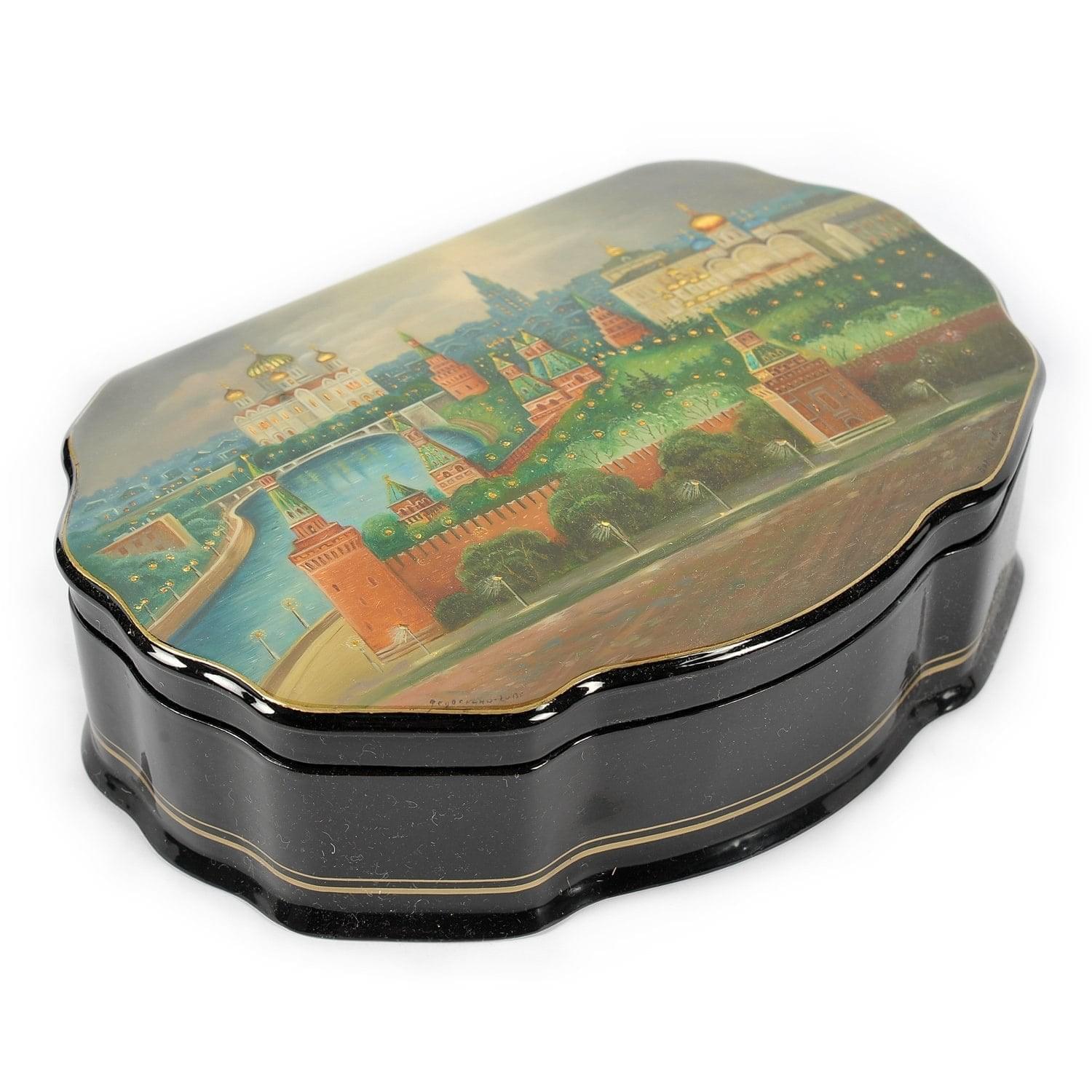 Кремлевский ансамбль - главная резиденция президента России - изображен на фоне пасмурного неба на корпусе этого интерьерного аксессуара ручной работы, на откидной крышке фигурной шкатулки. Вашему вниманию - авторская работа, шкатулка", на создание которой ушло около 5 месяцев.