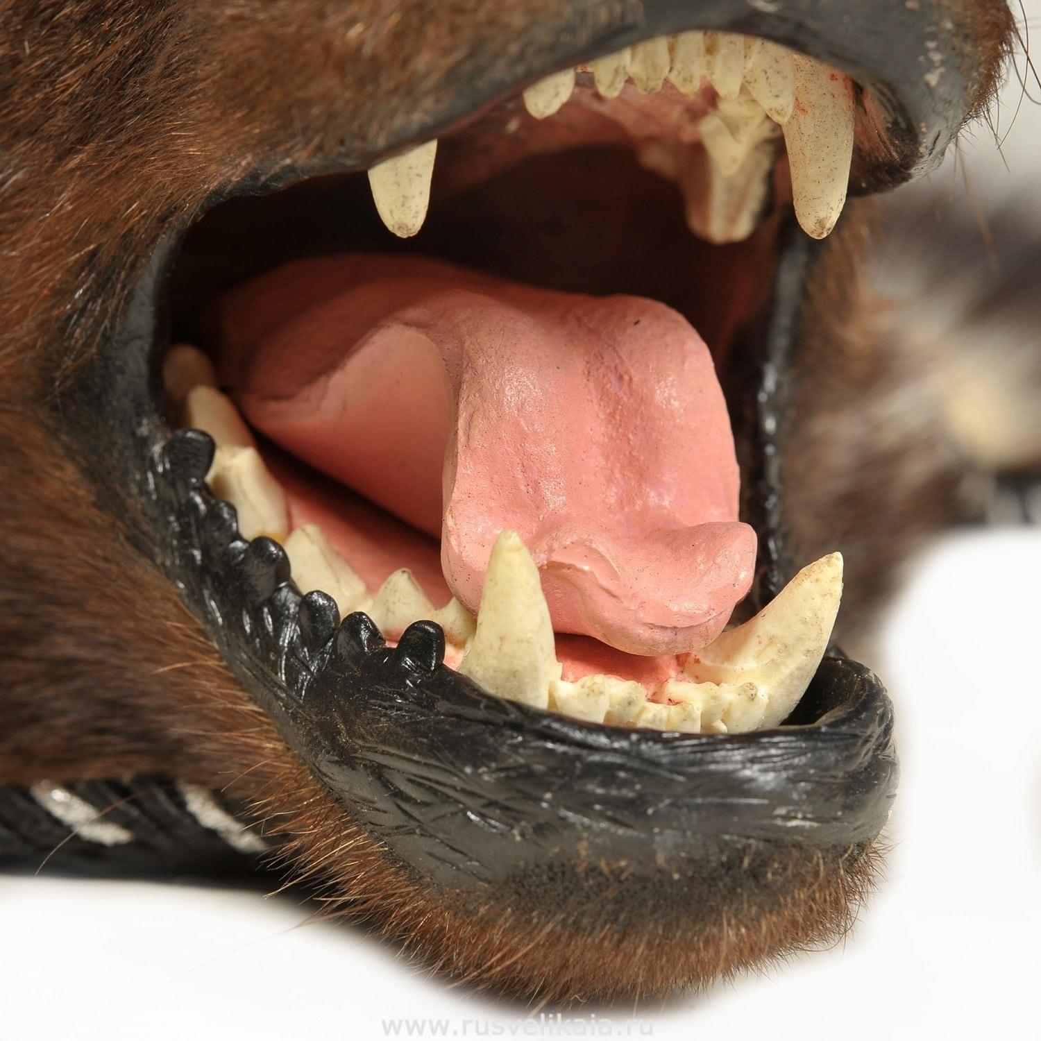 Голова росомахи с широко распахнутой пастью демонстрирует грозный оскал и прекрасно сохранившуюся на долгие века верхнюю челюсть.