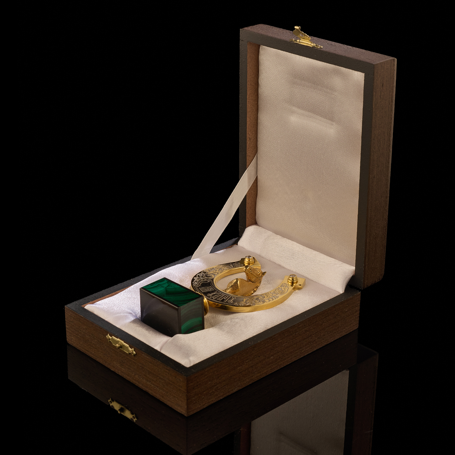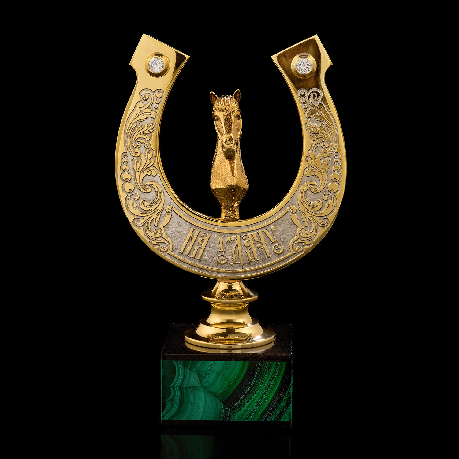 Материалы: латунь, никель, золото 999,9*, малахит, фианиты.