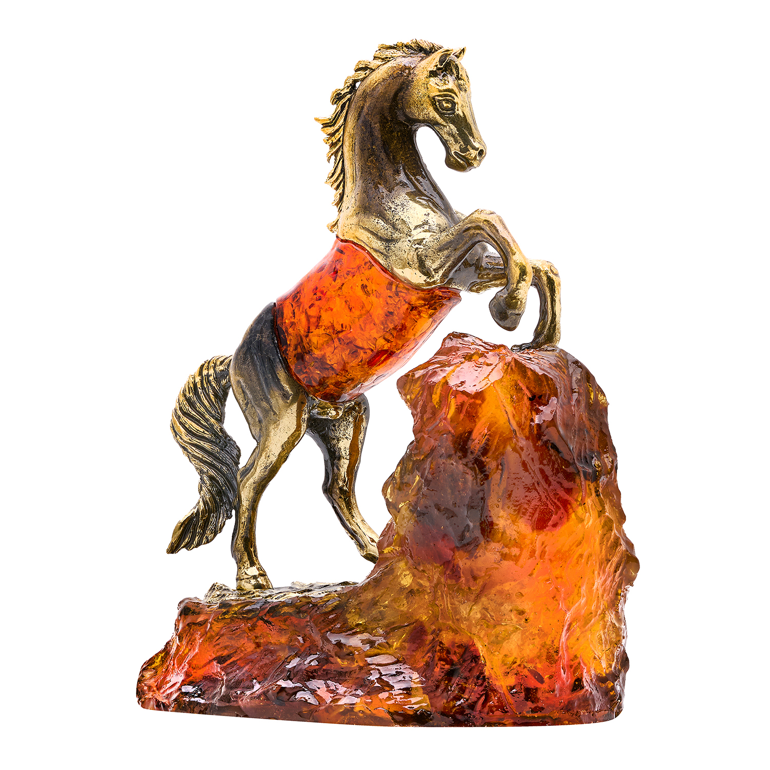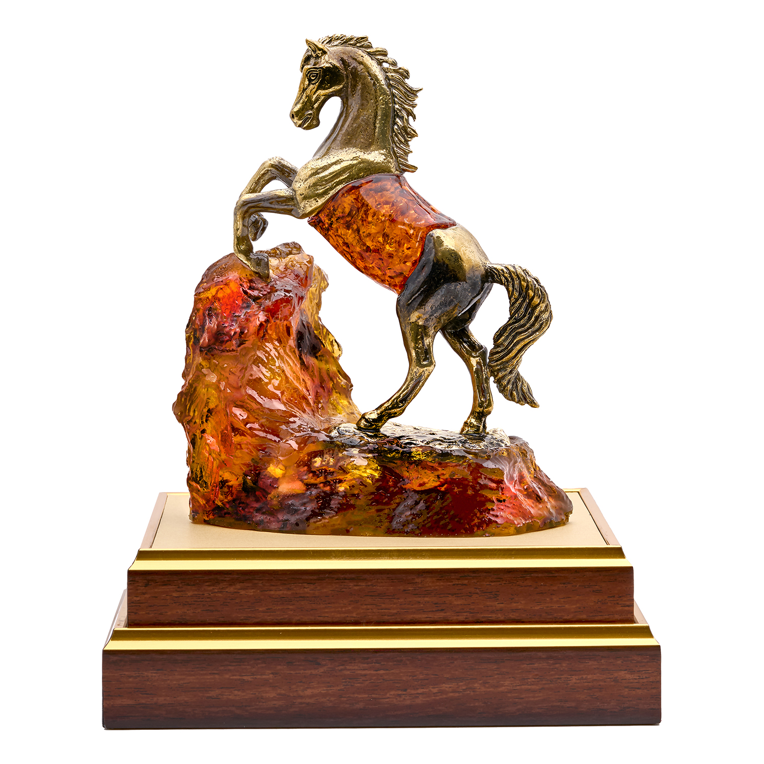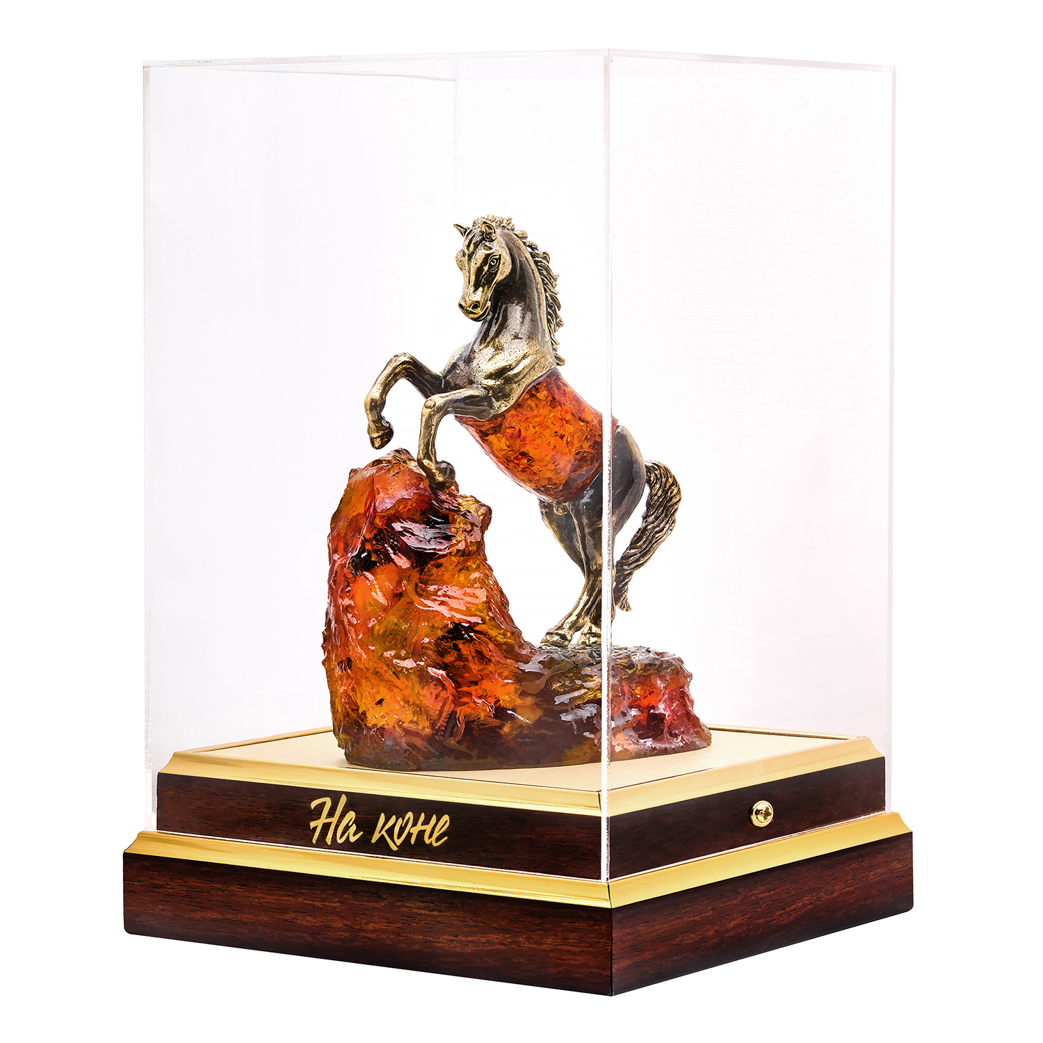 Икона непоколебимого превосходства: вздыбленный бронзовый конь, вечно застывший в царственной стойке на глыбе коньячного янтаря, — олицетворение статуса, где высота взята, а позиция удержана. «Быть на коне — не финиш, а точка отсчёта для новых вызовов!». Под кристальным колпаком из оргстекла блики создают форму: солнечные лучи пронзают янтарную скалу, а свет играет на бронзовых крупах, подчёркивая незыблемость мастерства. Композиция упакована в фирменный красный пакет — эмблема для тех, кто превратил успех в постоянное состояние души.