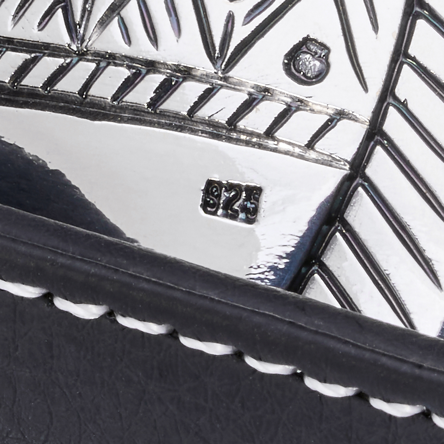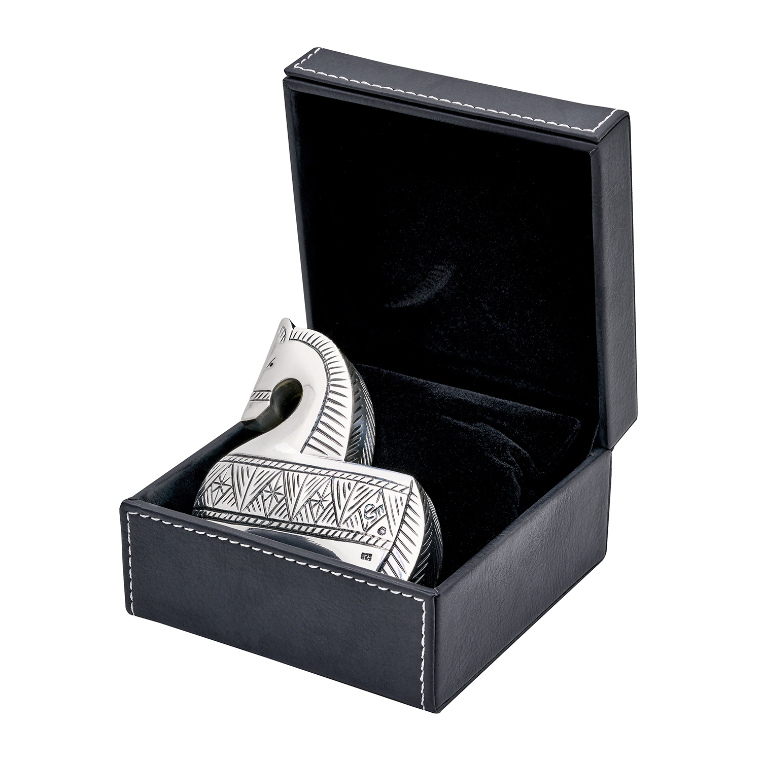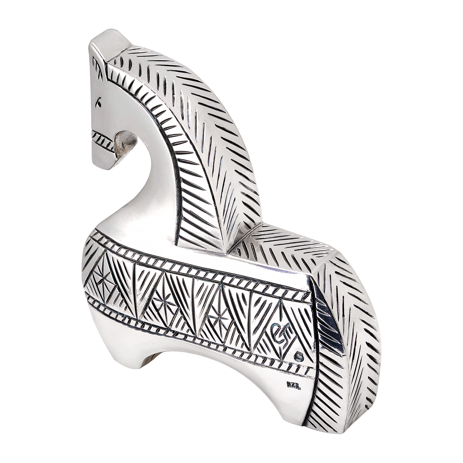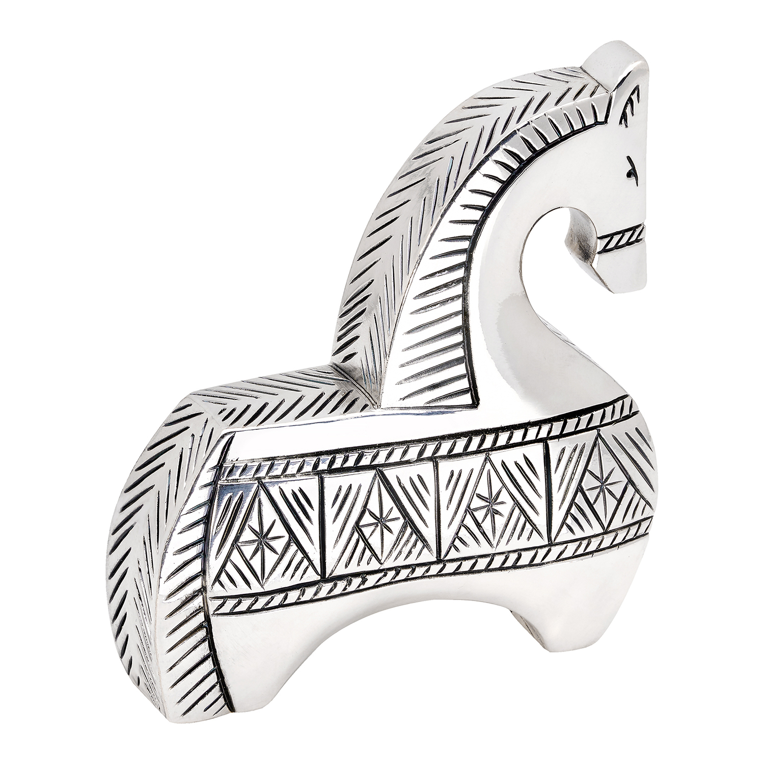 Ода традициям предков: конь, будто вырезанный резцом древнего мастера, покрыт строгим геометрическим орнаментом — сакральные линии Севера, сплетённые в лаконичный узор. Каждая черта дышит добротной лаконичностью русской игрушки, а серебряное покрытие придаёт древней форме благородство вечности. «Сила — в простоте, выверенной веками!». Фигурка уложена в кожаную коробку и комплектуется фирменным пакетом