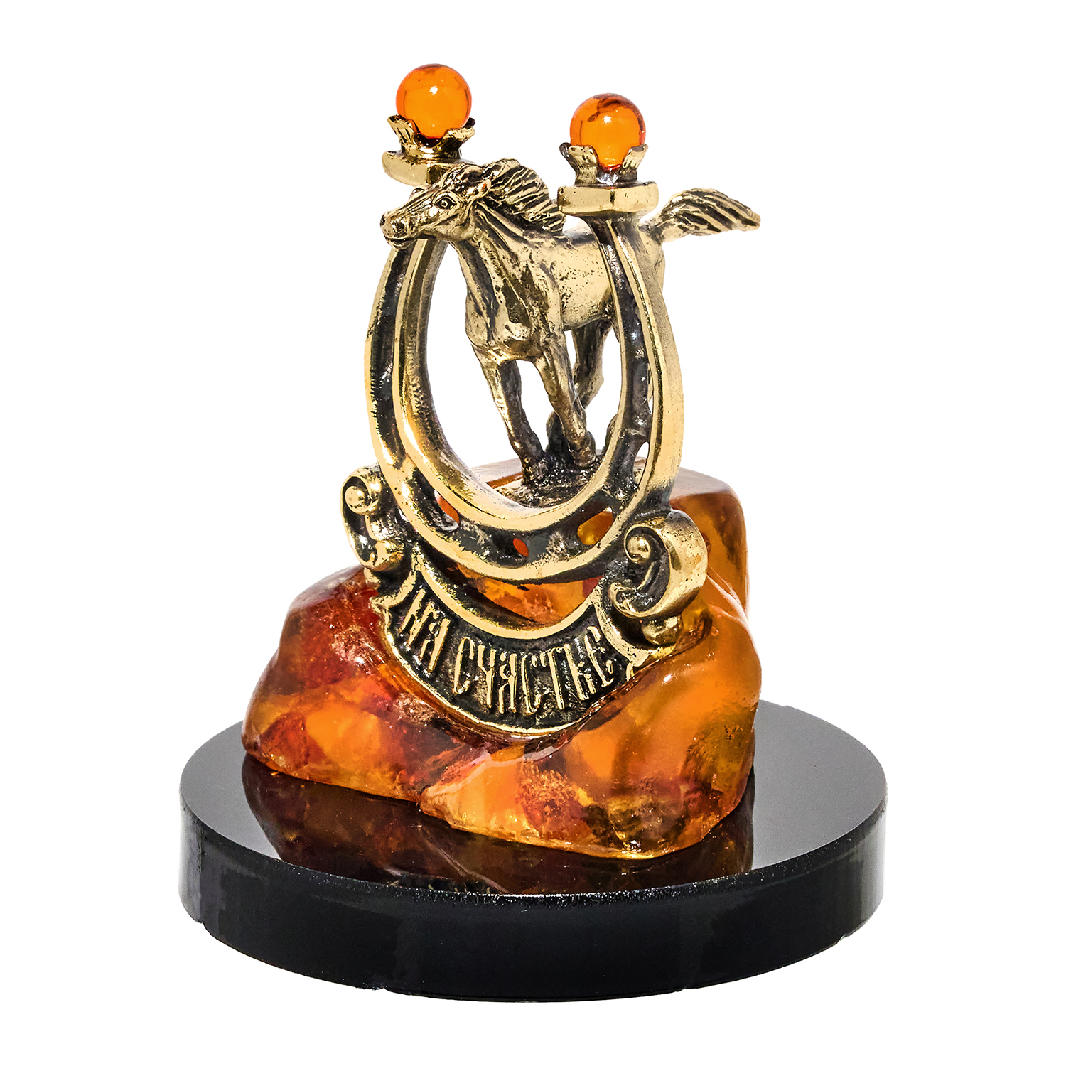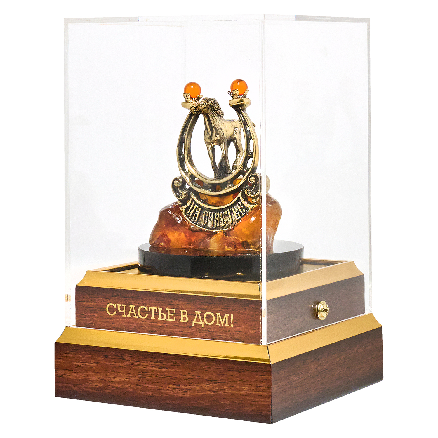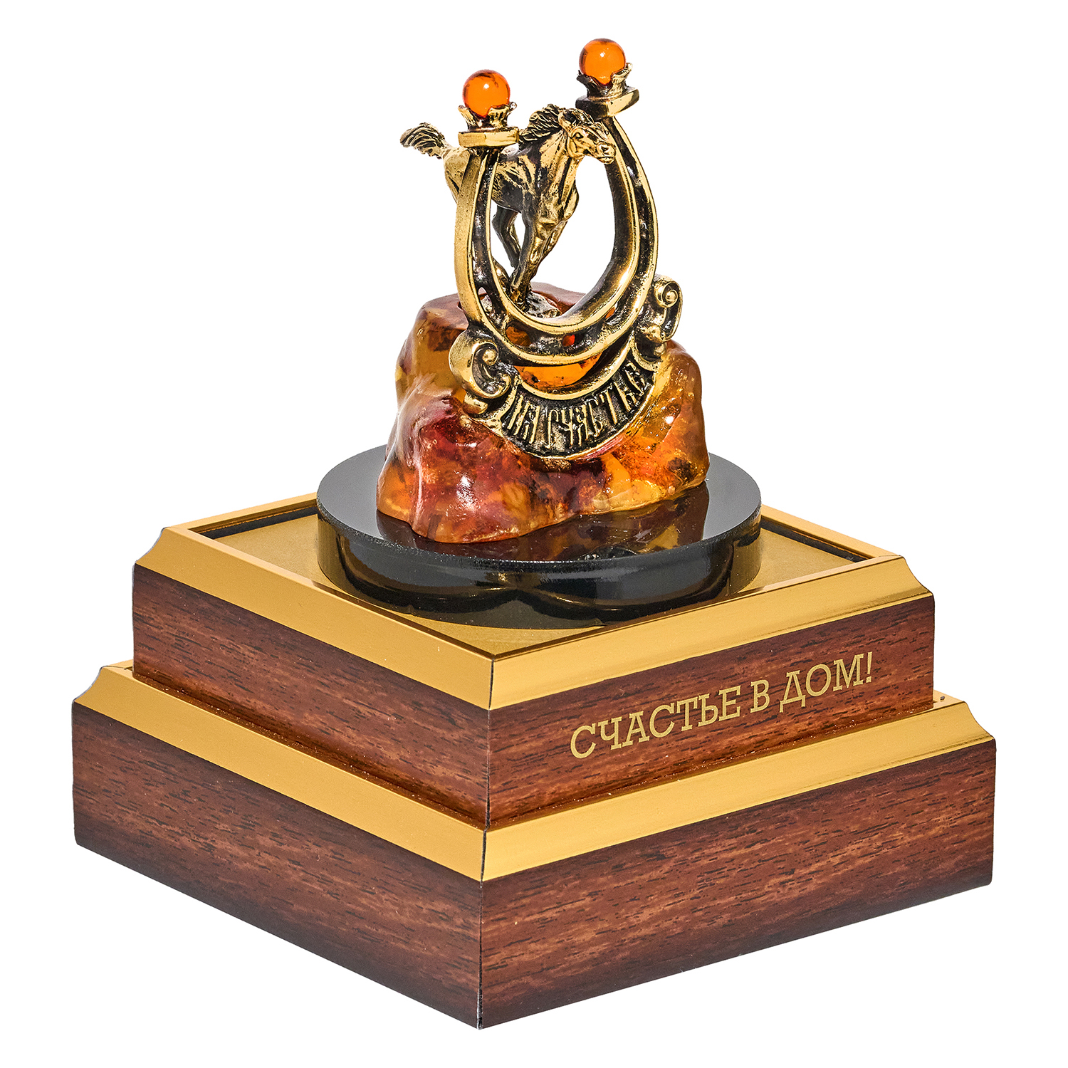 Трогательный оберег из бронзы и янтаря: подкова с выгравированными словами "На счастье" обнимает бронзового скакуна в стремительном беге — словно фортуна, пойманная в момент влетания в ваши двери. Вся композиция покоится на тёплом постаменте из цельного коньячного янтаря, превращаясь в солнечный фундамент для благополучия. «Настоящее счастье — это когда удача стучится копытом в вашу дверь!». Под кристальным колпаком из оргстекла играет свет: блики скользят по металлу подковы и живому золоту камня, усиливая магию оберега. Упакована в фирменный красный пакет — готовый ритуал, чтобы счастье знало ваш адрес.