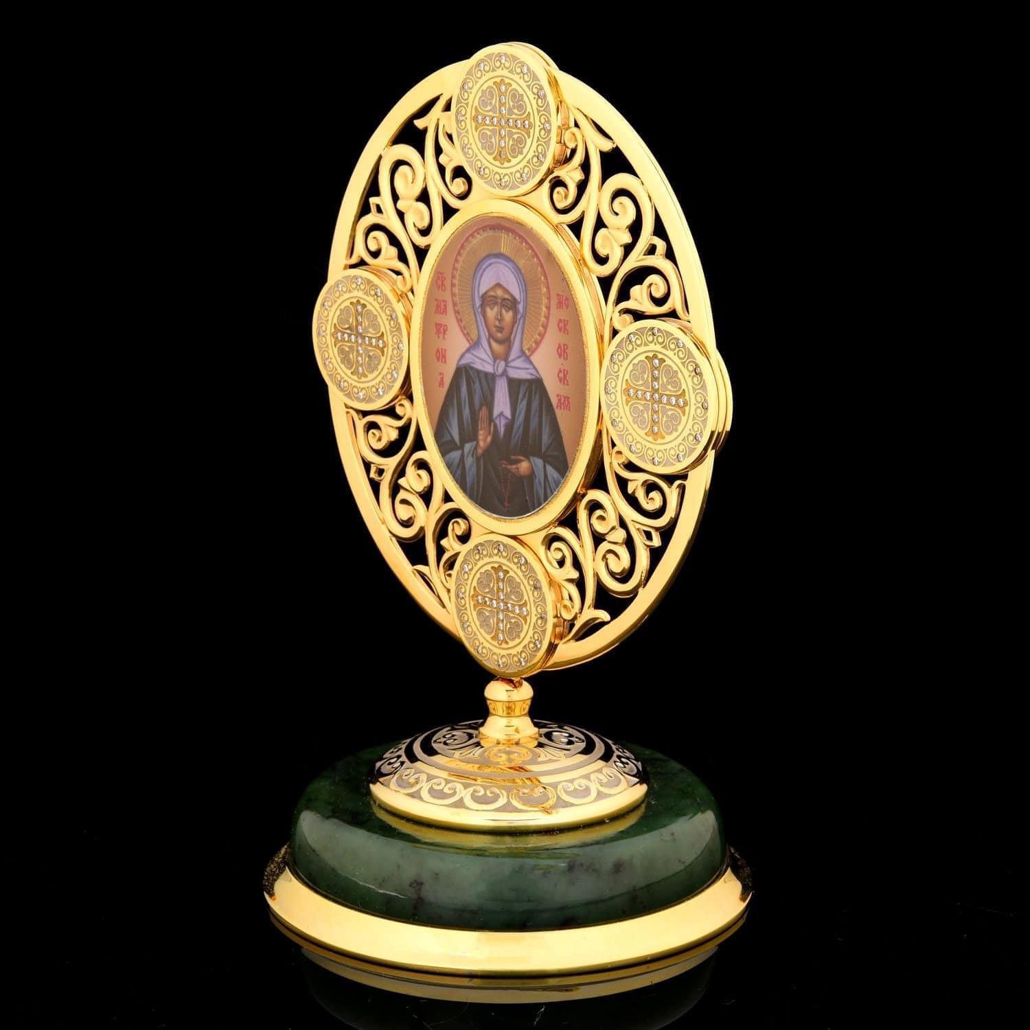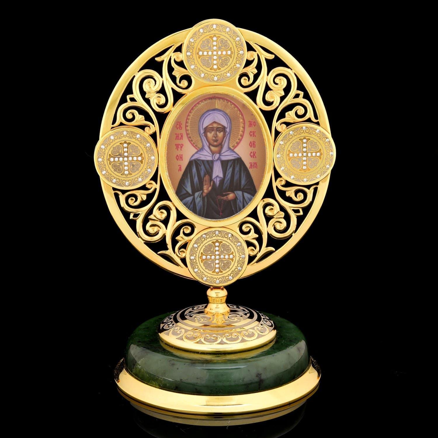 На плакетке изображена Матрона Московская, одна из самых почитаемых святых Русской православной церкви. Слепую девочку хотели оставить в приюте князя Голицына, но матери приснился сон: белая слепая птица села на ее грудь. Мама решила, что сон вещий, и оставила ребенка.