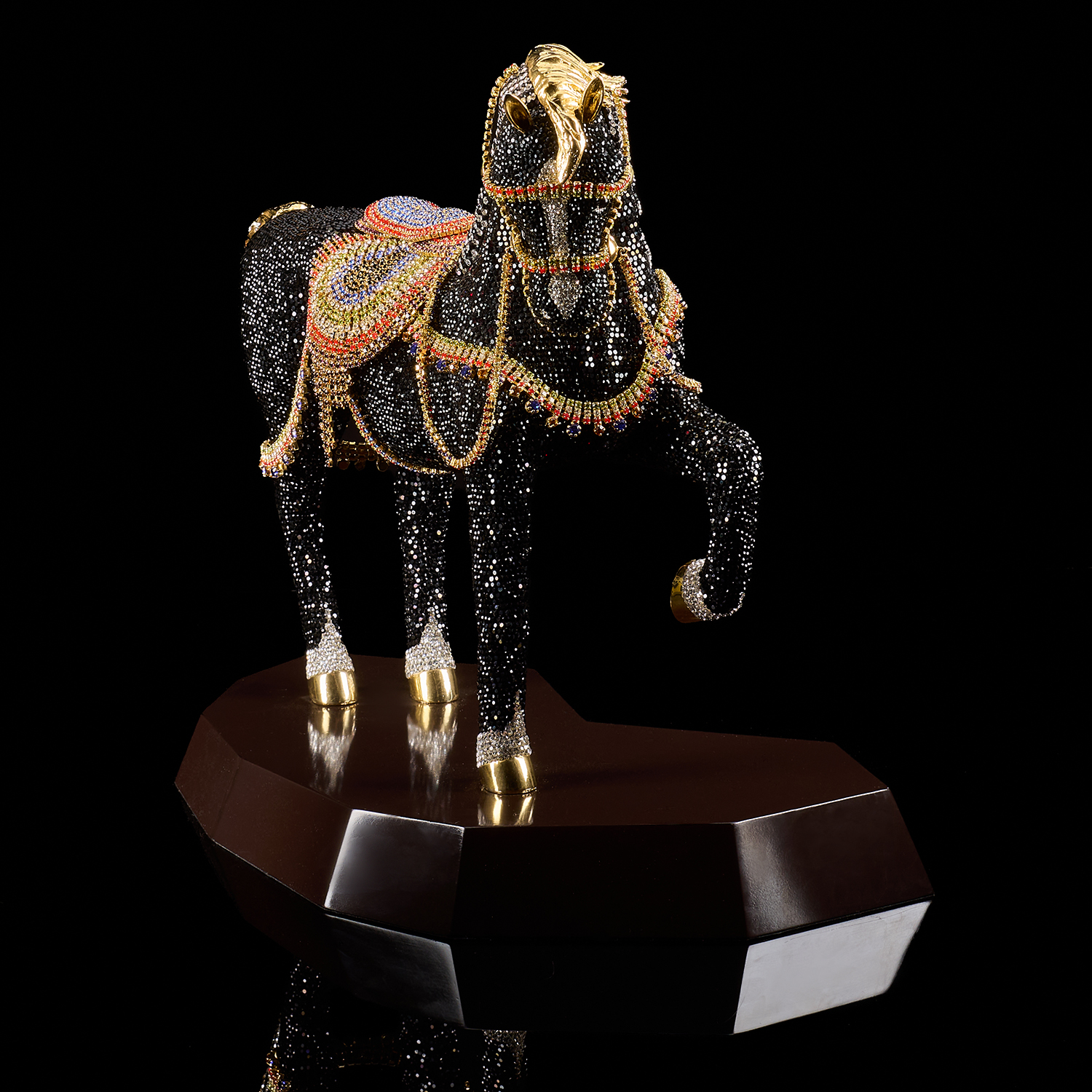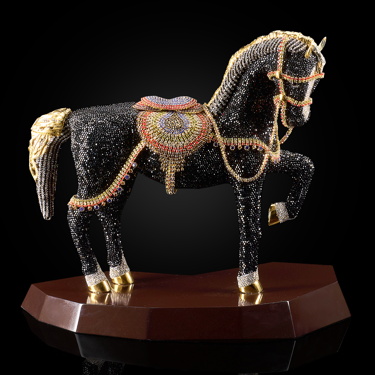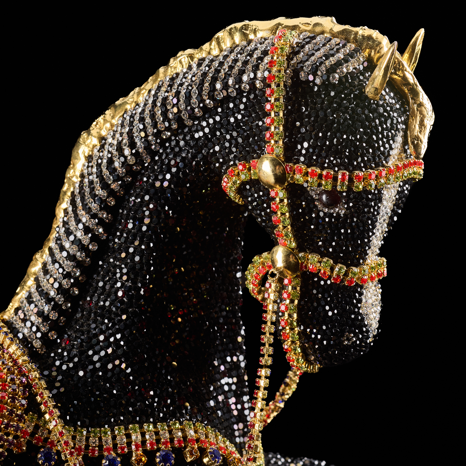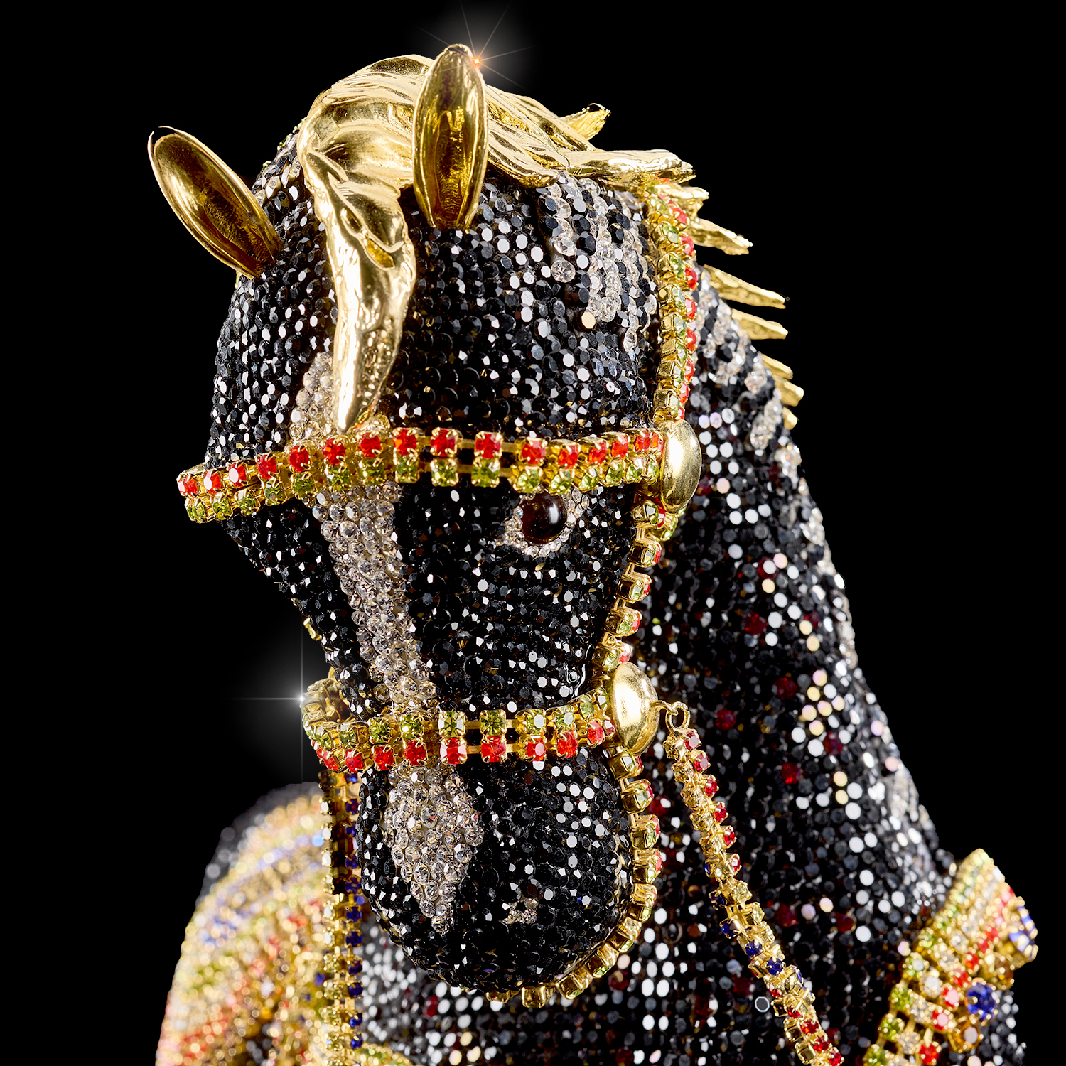 Этот конь — сама мощь, одетая в бархатную тьму. Его тело, покрытое чёрными хрустальными стразами, излучает глубокое, сдержанное сияние, словно звёздное небо. Но истинное великолепие — в его торжественном убранстве. Седло и поводья, выложенные мозаикой из разноцветных стразов Asfour, горят как драгоценные камни на фоне ночи, подчёркивая королевский статус и готовность к триумфальному выходу.