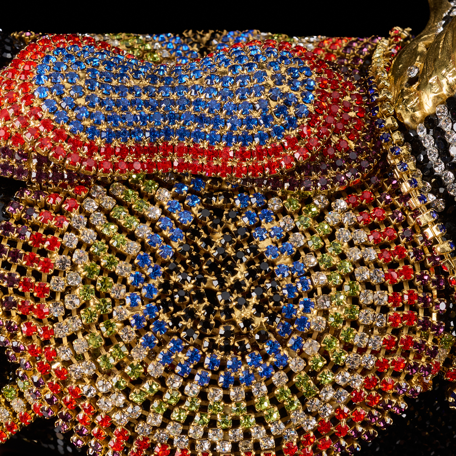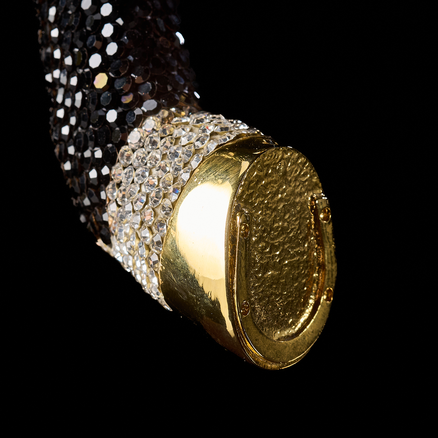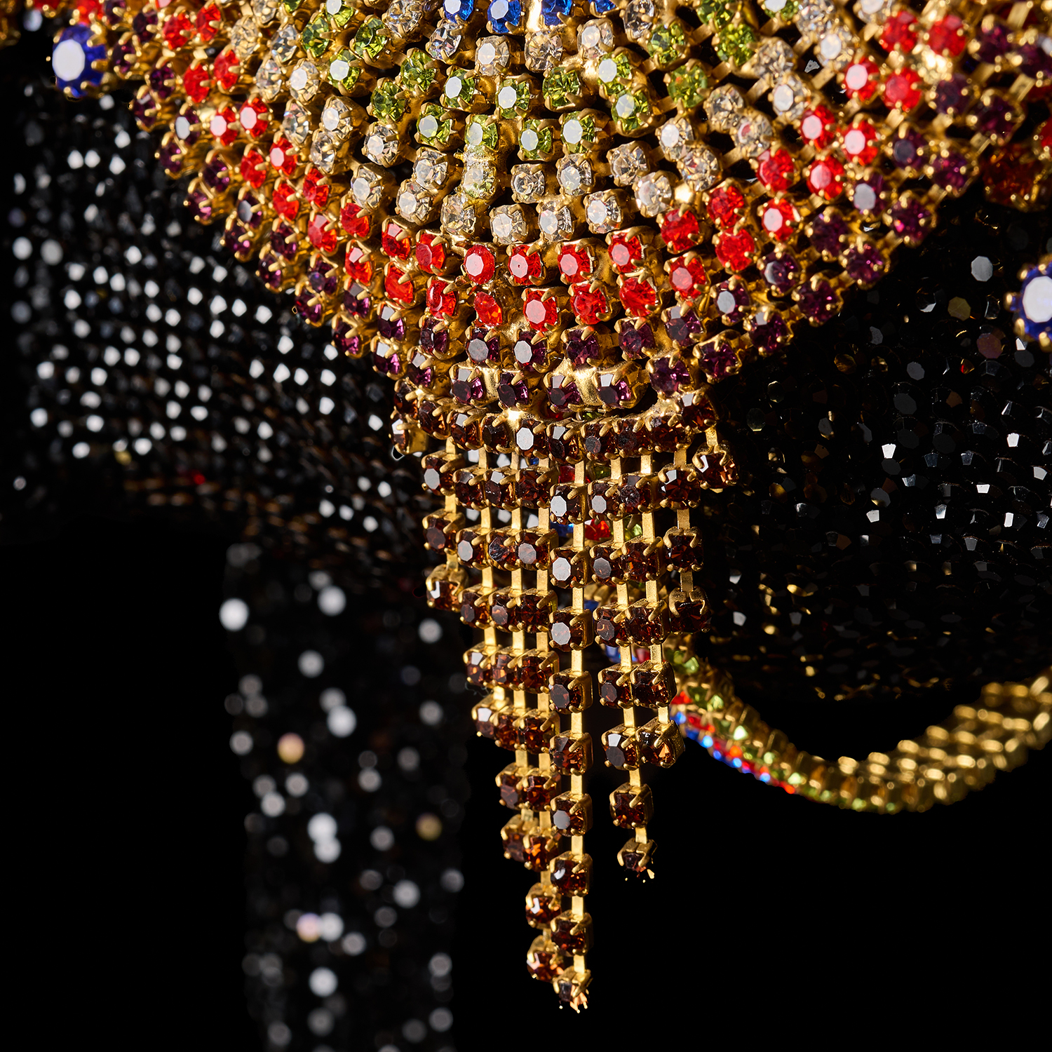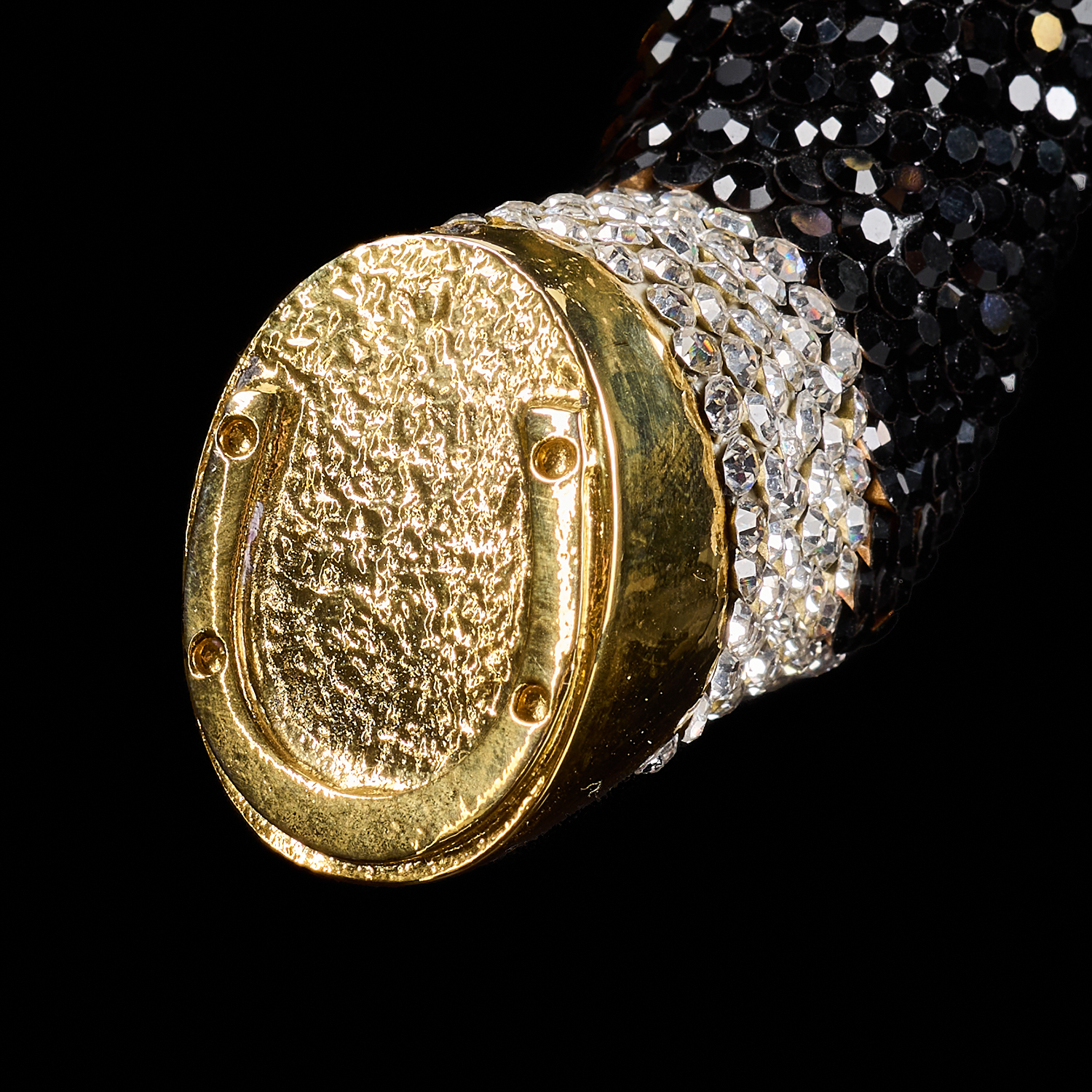 Этот конь — сама мощь, одетая в бархатную тьму. Его тело, покрытое чёрными хрустальными стразами, излучает глубокое, сдержанное сияние, словно звёздное небо. Но истинное великолепие — в его торжественном убранстве. Седло и поводья, выложенные мозаикой из разноцветных стразов Asfour, горят как драгоценные камни на фоне ночи, подчёркивая королевский статус и готовность к триумфальному выходу.