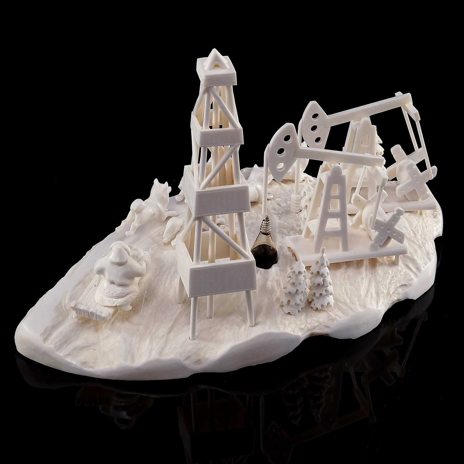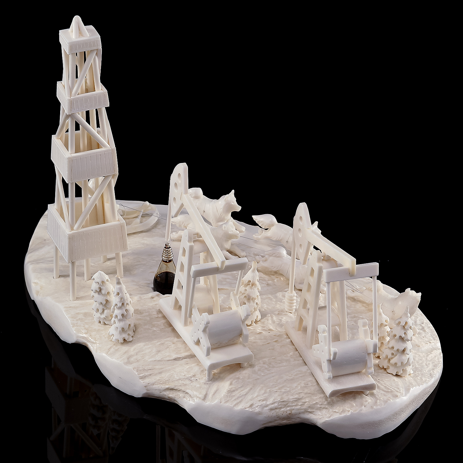 Изделие представляет собой композицию, изображающую нефтепромысел. Среди заснеженной тундры стоит нефтяная вышка, нефтяные качалки. На переднем плане упряжка ездовых собак.