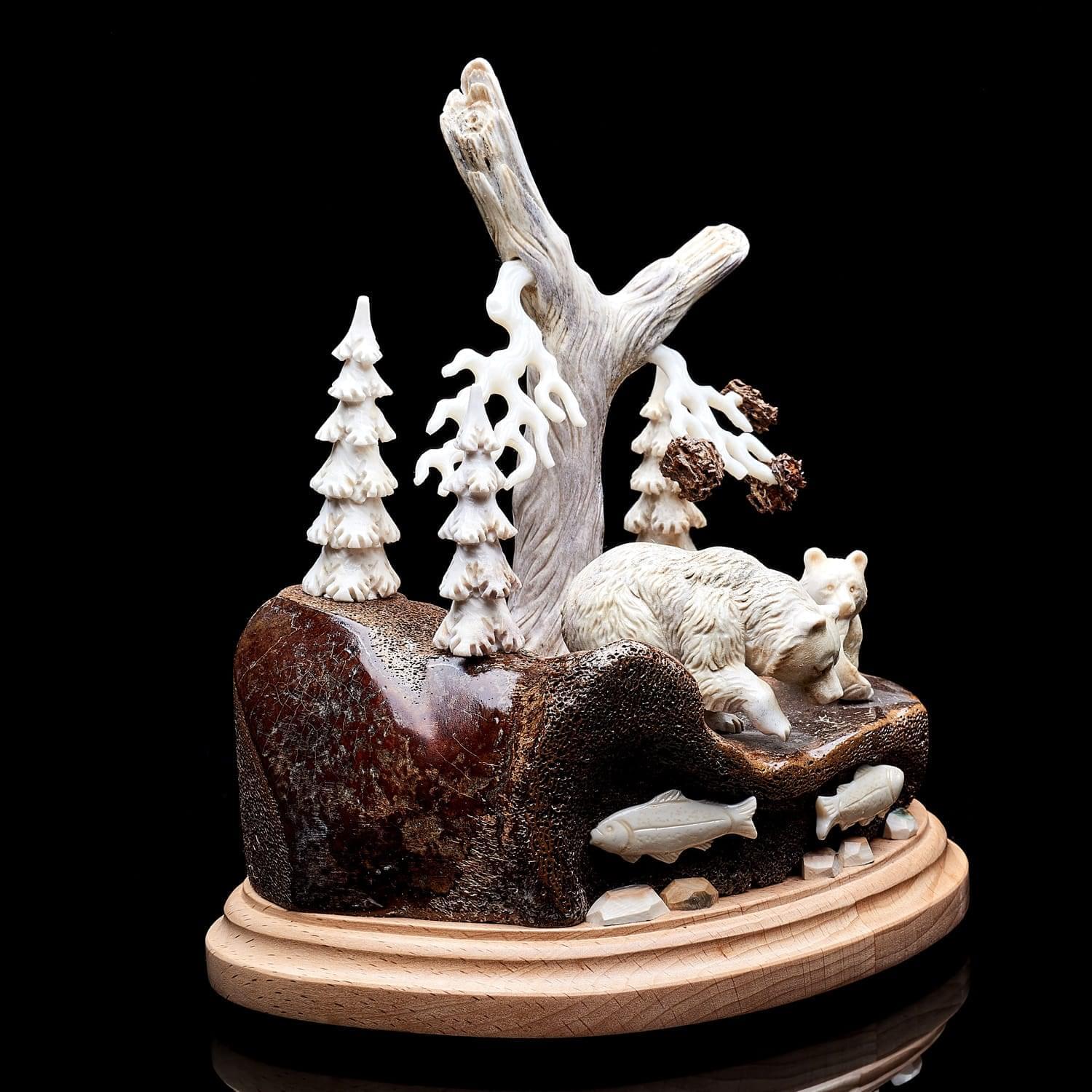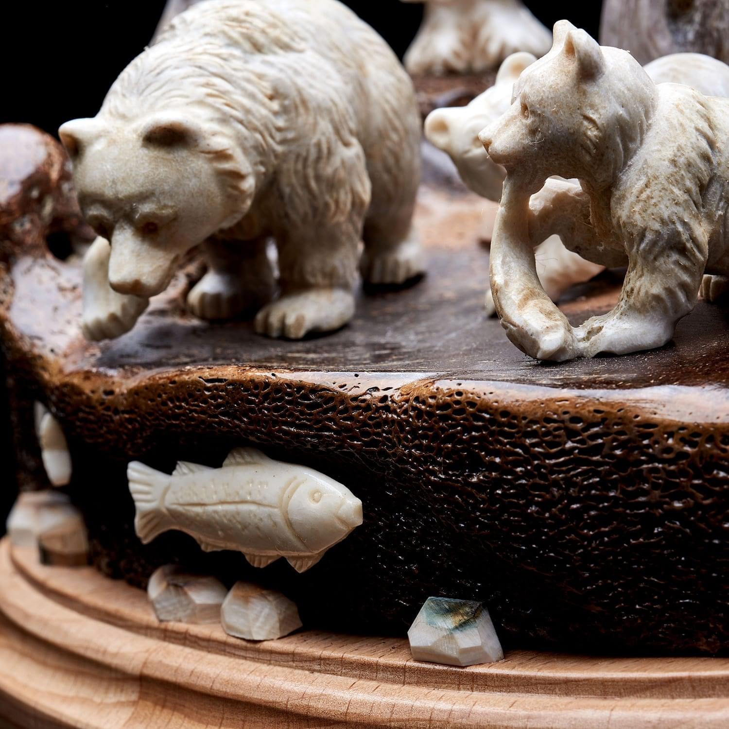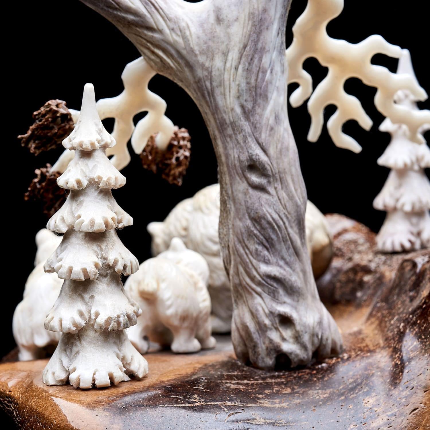 Китайцы, ценители народной медицины, использовали как лекарство против тяжелых осложнений порошок из рога лося. Он продлевает жизнь, увеличивает силы, укрепляет волю и устойчивость к болезням. Помогает при гнойных нарывах в костях, восстанавливает мужскую силу и налаживает работу почек, желудка, печени. Способствует очищению крови, избавлению от токсинов и шлаков, повышает иммунитет. Порошок из рогов способен вывести больного из комы. На основе порошка из рогов лося изготавливают также пищевые добавки. Из рогов делают сувенирные изделия, которые по приданию древности положительно влияют на будущее дома их обладателя. Висящие на стене амулеты излучают добрую энергию. Твердый материал применяется в производстве шкатулок, столиков. Большие рога стоят особенно дорого - из них и создна данная композиция. Материалы: рог лося, цевка мамонта, дерево.