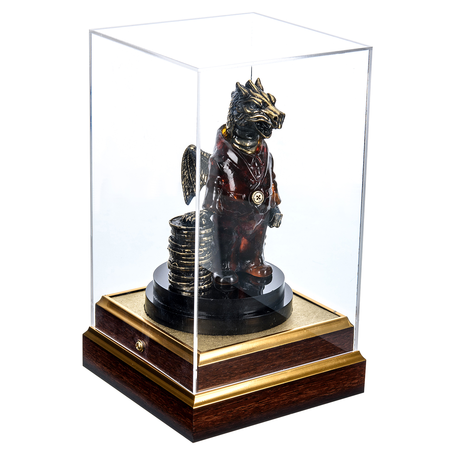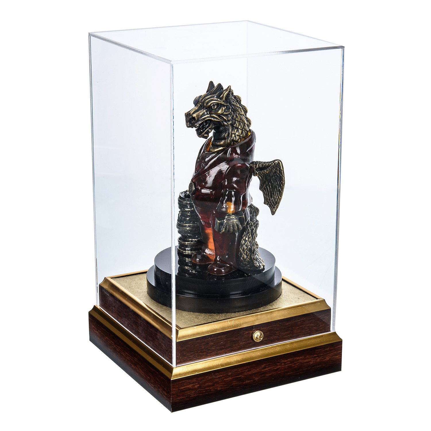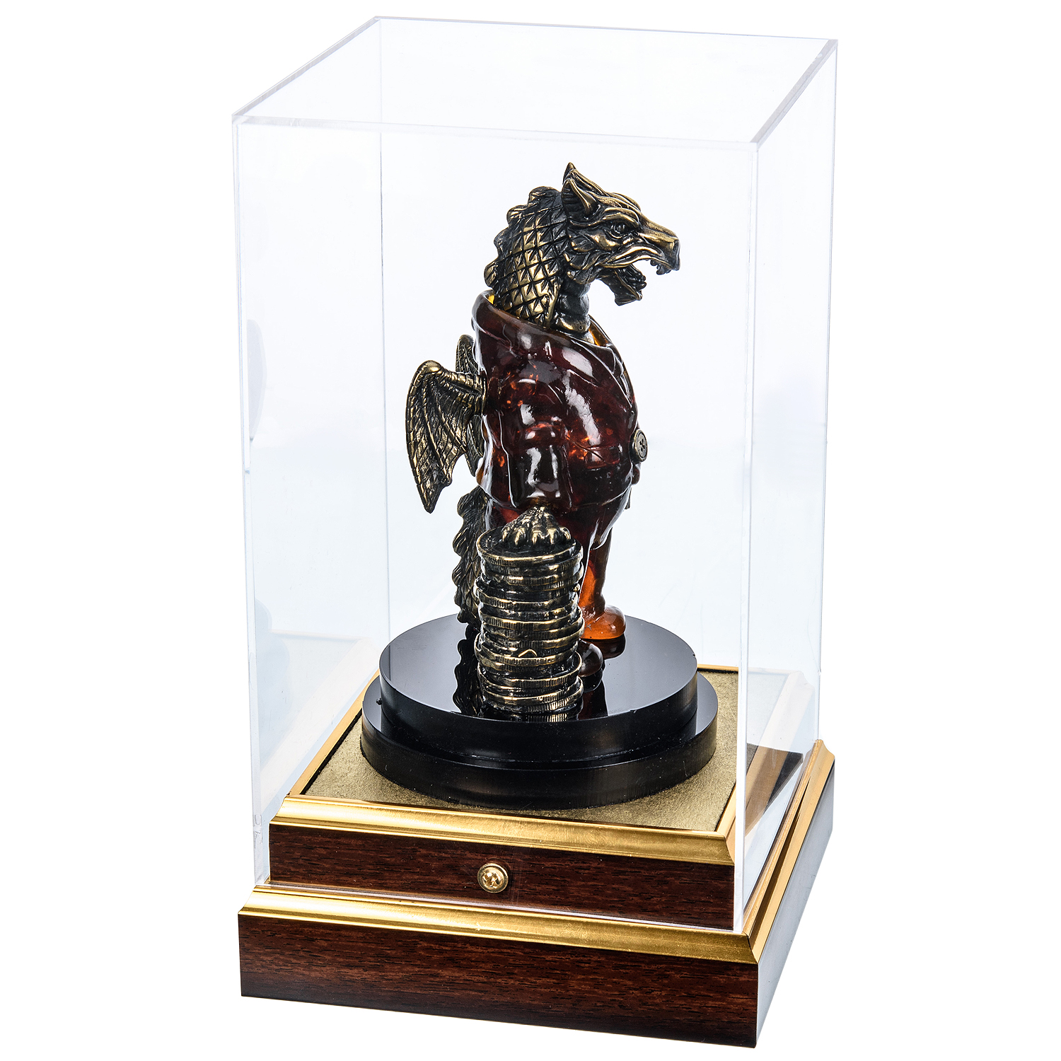 Основой коллекции являются миниатюрные скульптуры: от элегантных животных и мифологических персонажей до абстрактных форм. Особое внимание уделяется сувенирным деревьям, где пластинки янтаря имитируют листву, создавая эффект «вечного» природного шедевра. Бронзовые элементы добавляют изделиям монументальности и долговечности.