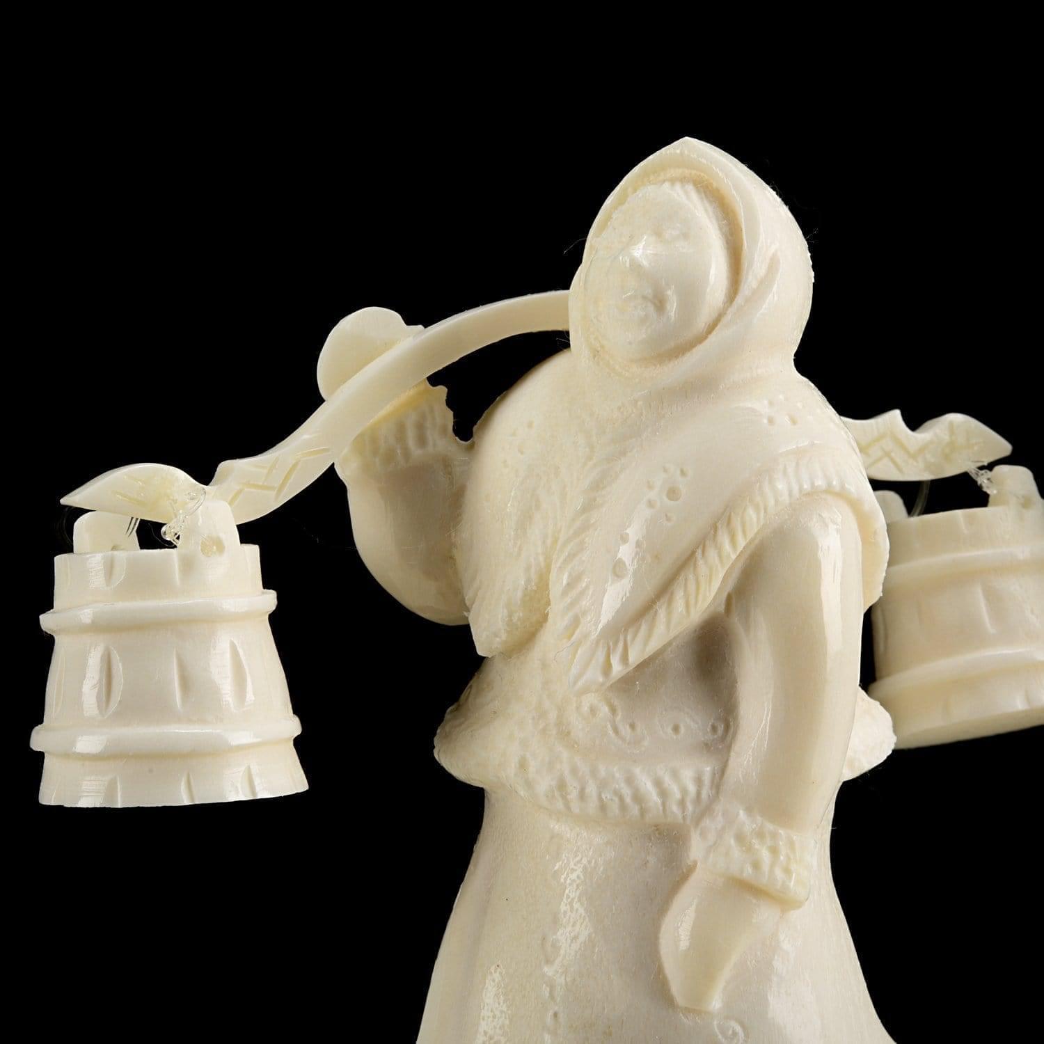 Динамичная сценка из русского народного быта представлена в этой скульптурной композиции из кости. Женщина в шубе с коромыслом через плечо идет по воду, мужчина смотрит ей вслед, а собачка скачет впереди... Это еще один уникальный образец косторезного промысла от резчика по кости Севера России, который представляет собой штучный интерьерный аксессуар и элитный подарок.