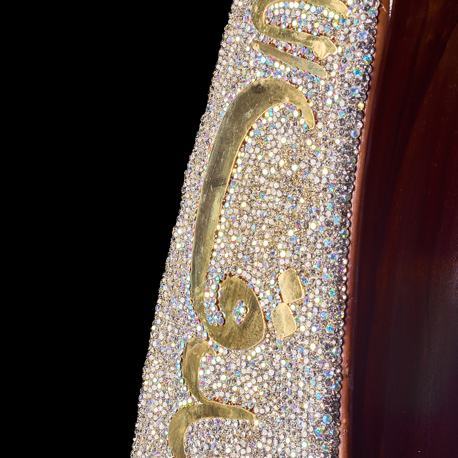 Этот предмет — воплощение одного из самых глубоких и загадочных образов Корана. Полумесяц, облицованный ослепительной мозаикой из хрустальных стразов, покоится как небесный знак. В его объятиях — деревянный шар, на котором латунная каллиграфия выводит священные аяты суры «Перо» (Аль-Калям), начинающейся с торжественной клятвы: «Нун. Клянусь пером и тем, что они пишут…».