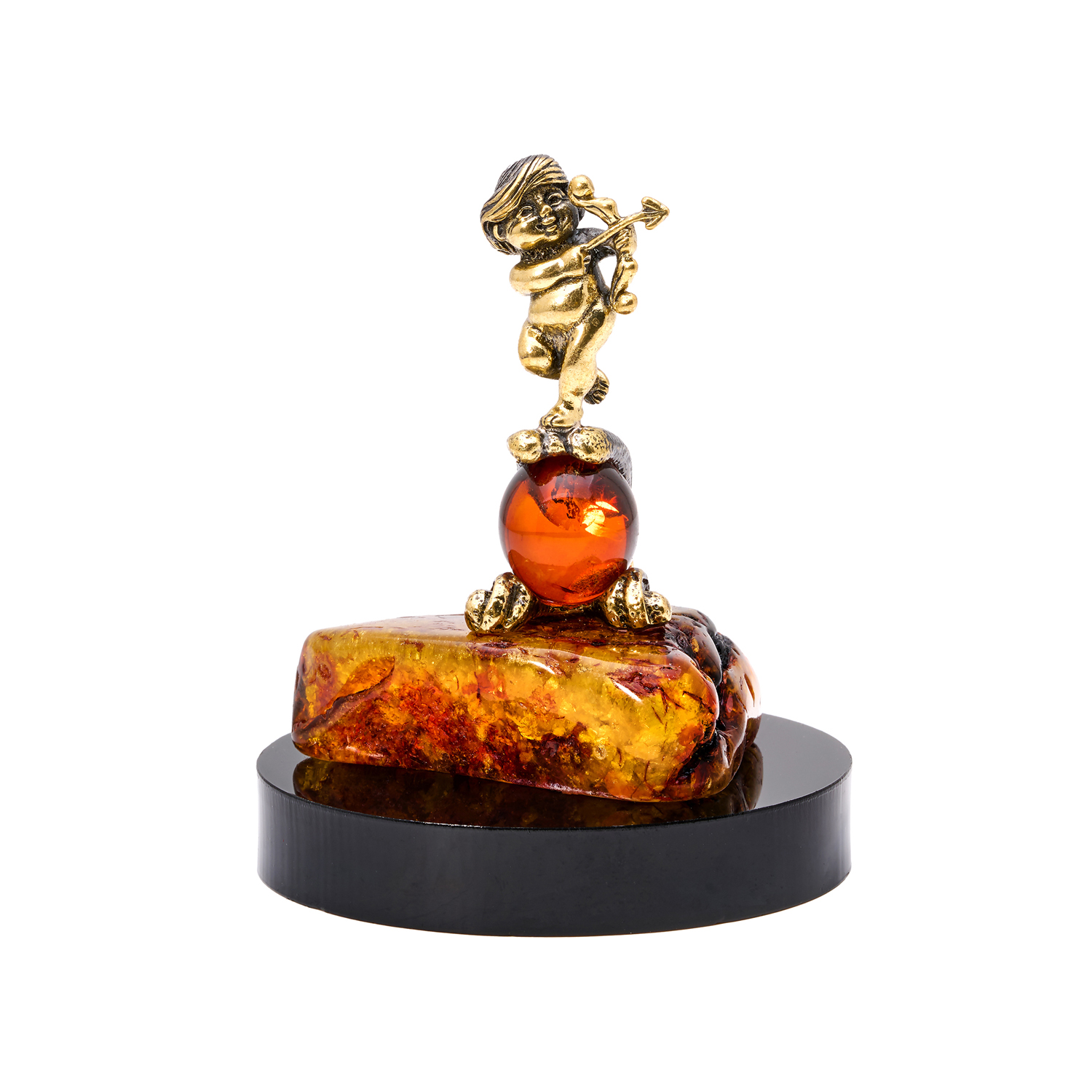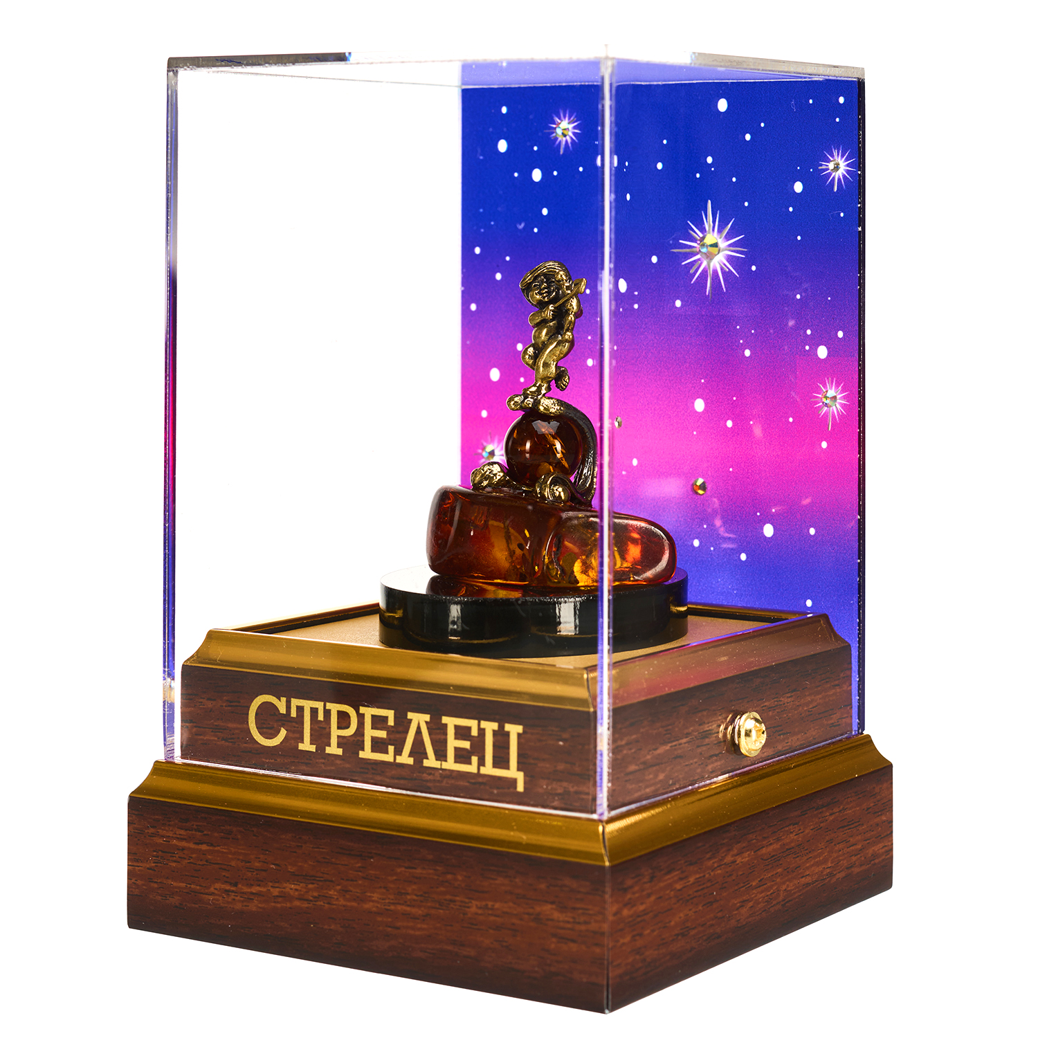 Статуэтка «Стрелец» — олицетворение детского любопытства и безграничных устремлений знака. Пухлый младенец с луком, уверенно направляющий стрелу в небо, замер на гребне бронзовой волны, поднявшейся от теплого основания из натурального янтаря; в изгибе волны светится янтарная сфера — символ его внутреннего огня. Эта наивная, но полная решимости поза воплощает неутомимую жажду приключений, оптимизм и веру в великие цели, свойственные душе Стрельца. Статуэтка представлена под прозрачным колпаком с мерцающим звездным небом из искрящихся кристаллов и дополнена фирменным подарочным пакетом, создавая трогательный и вдохновляющий подарок для вечных искателей.