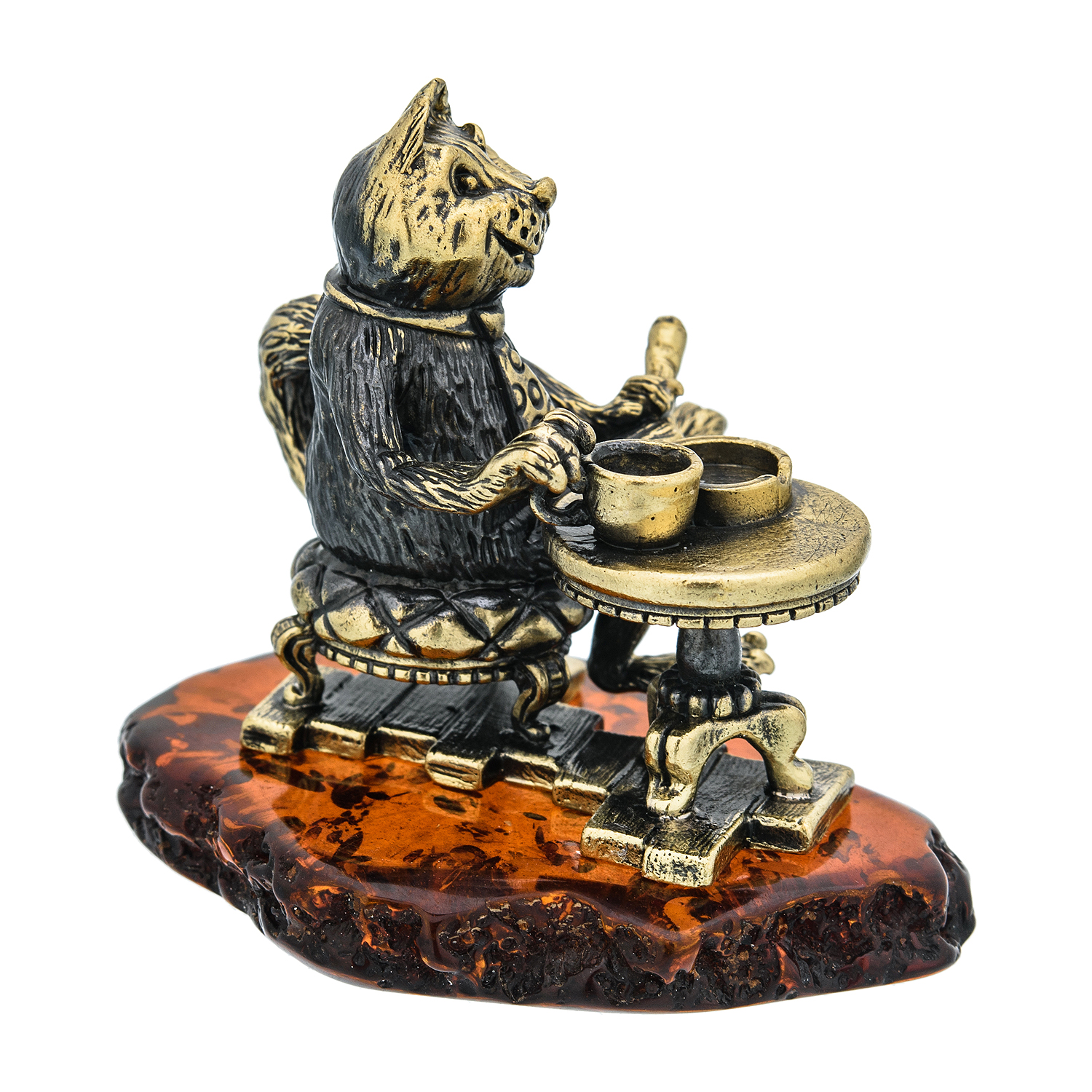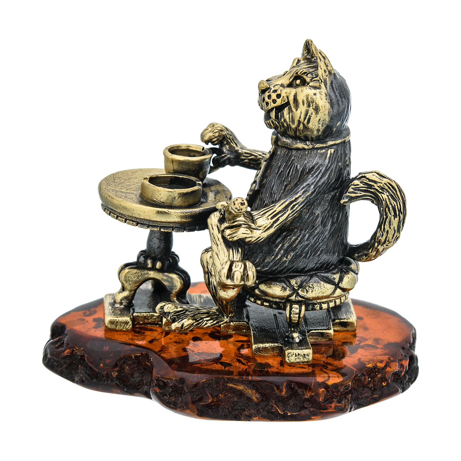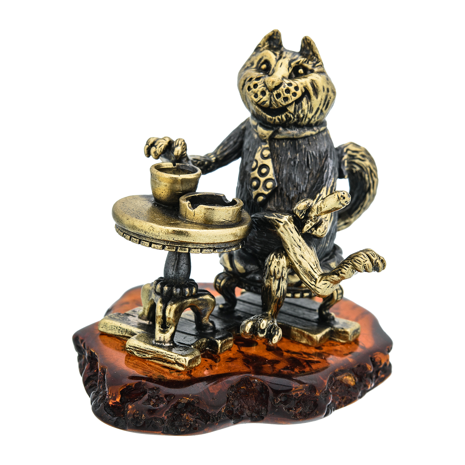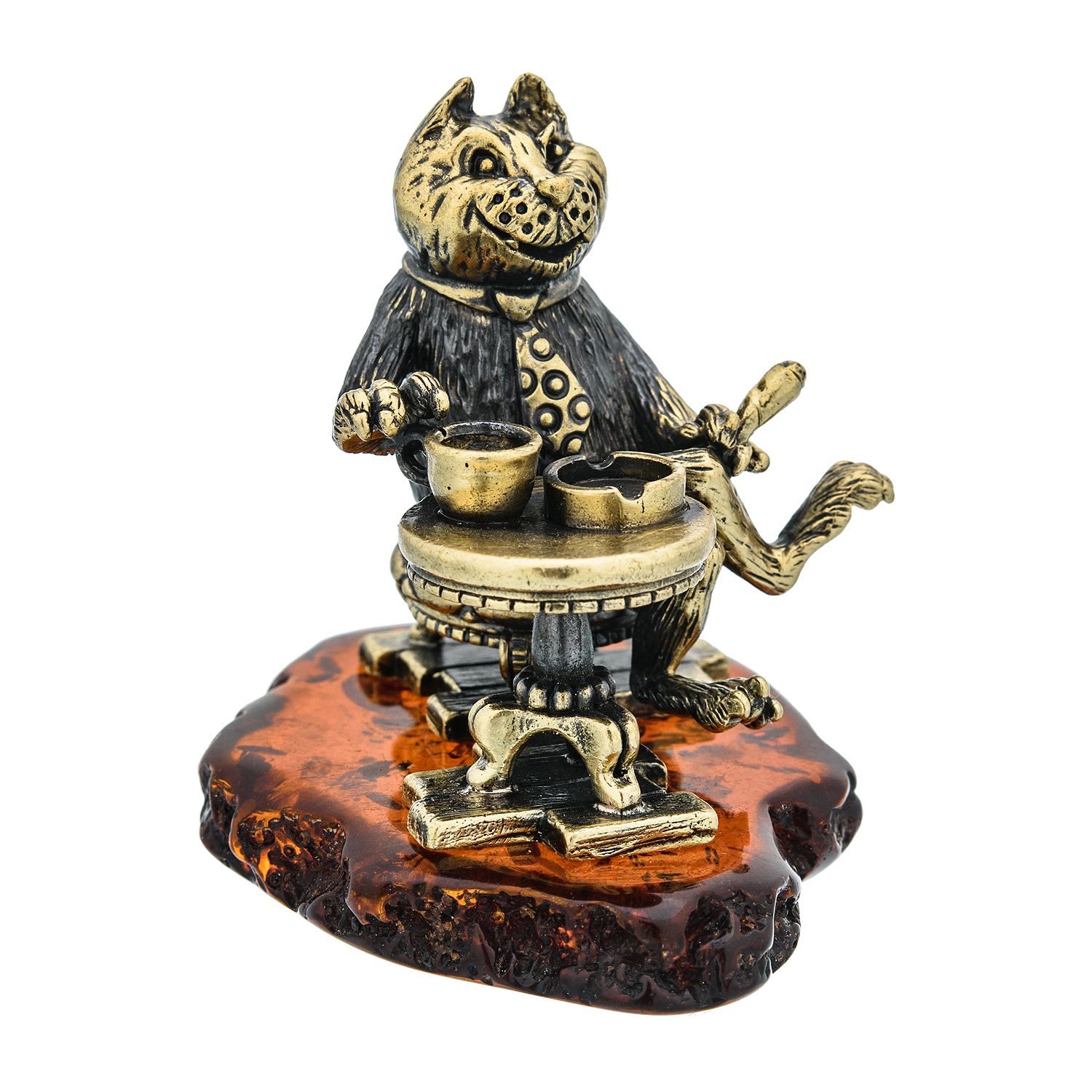 Статуэтка с янтарем "Кот с чашечкой кофе".