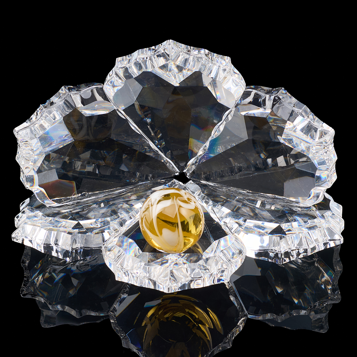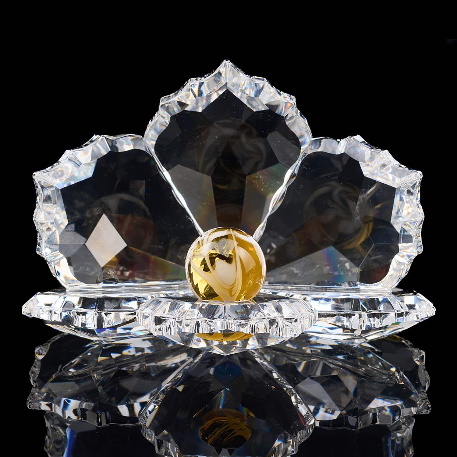 Застывшее мгновение морской тайны. Раскрытая ракушка, вырезанная из прозрачного хрусталя, хранит в своих объятиях редкое сокровище — сияющую жемчужину из солнечного желтого хрусталя. Этот союз двух оттенков кристалла рождает игру света и тени, напоминая о теплых морских волнах и скрытых сокровищах океана. Скульптура символизирует чистоту, богатство и раскрытие внутреннего потенциала, даря пространству ощущение умиротворения и загадочной роскоши.
