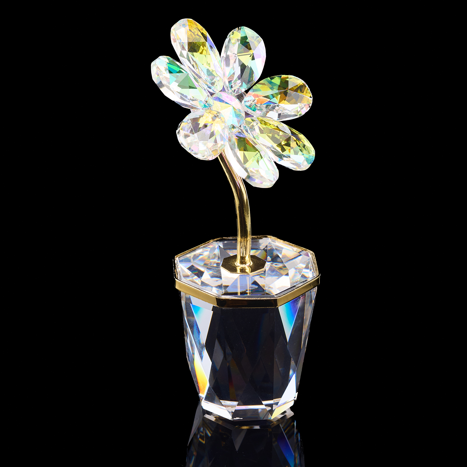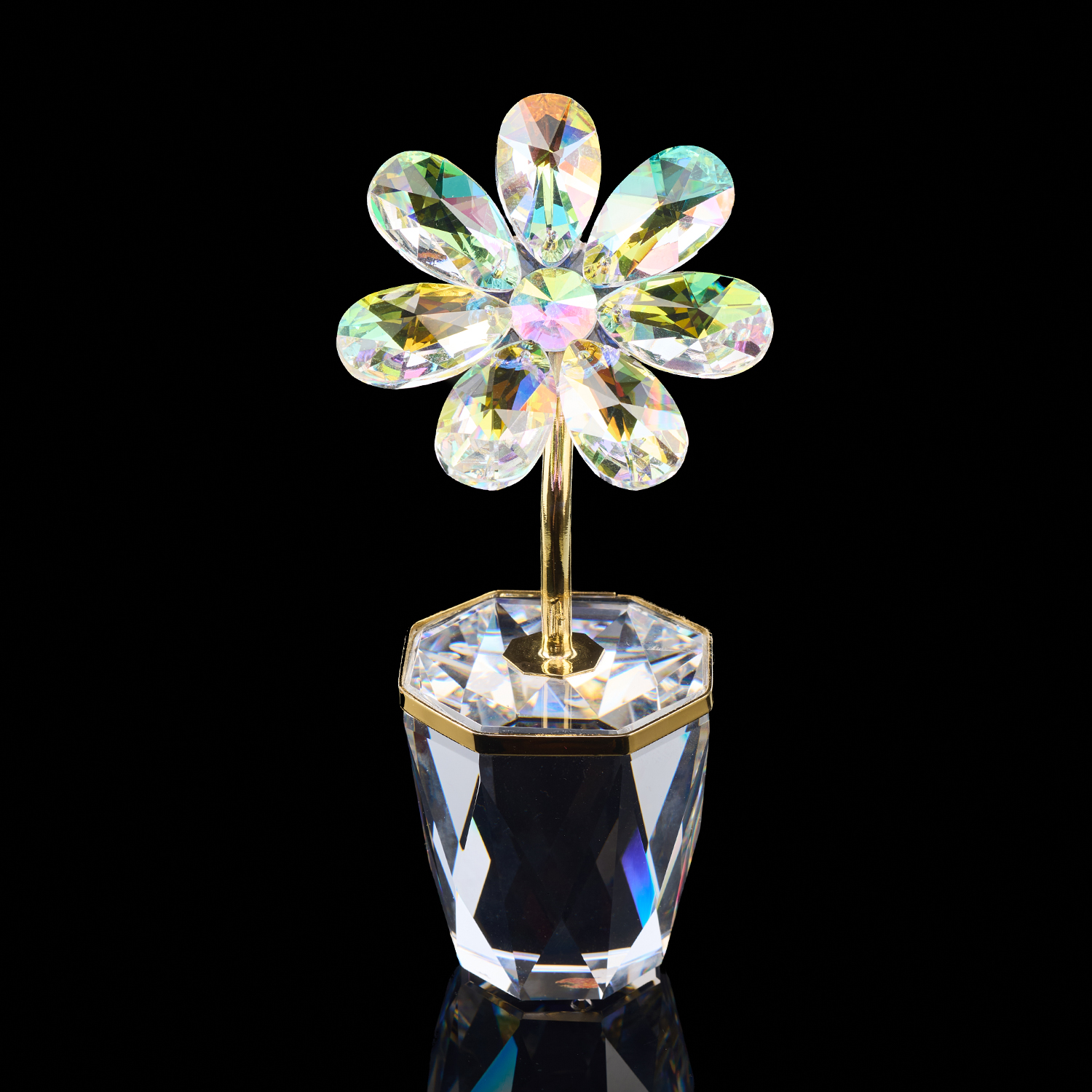 Искусство, преломляющее свет. Asfour Crystal создает гармонию, объединяя хрустальный цветок и горшок в единой цветовой гамме, но с уникальной игрой оттенков. Фирменное радужное покрытие нанесено с ювелирной точностью, создавая на поверхности сложные оптические эффекты. Каждый уголок обзора раскрывает новый оттенок, делая композицию динамичной и живой. Эта работа демонстрирует мастерство бренда в преобразовании классического материала с помощью инновационных технологий.