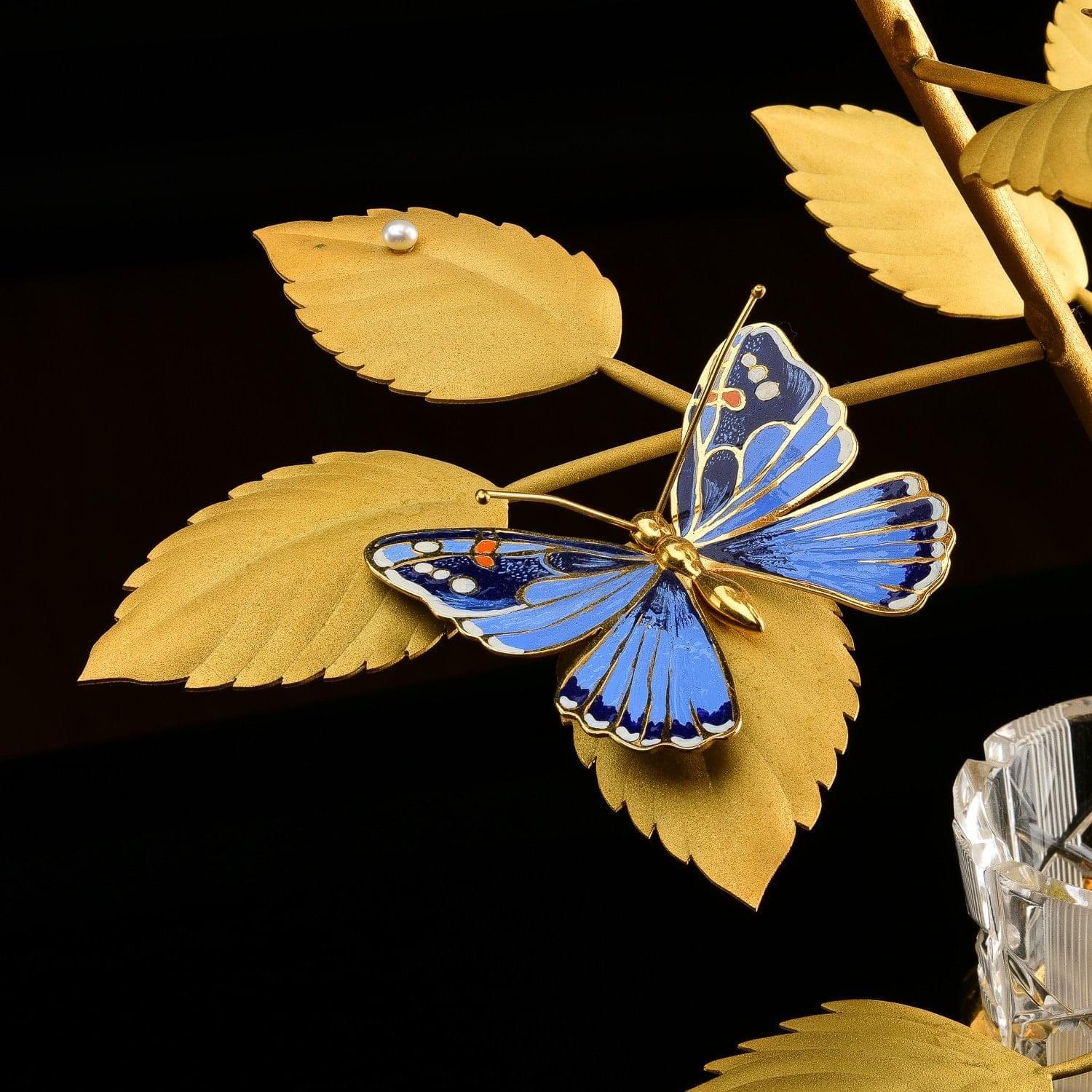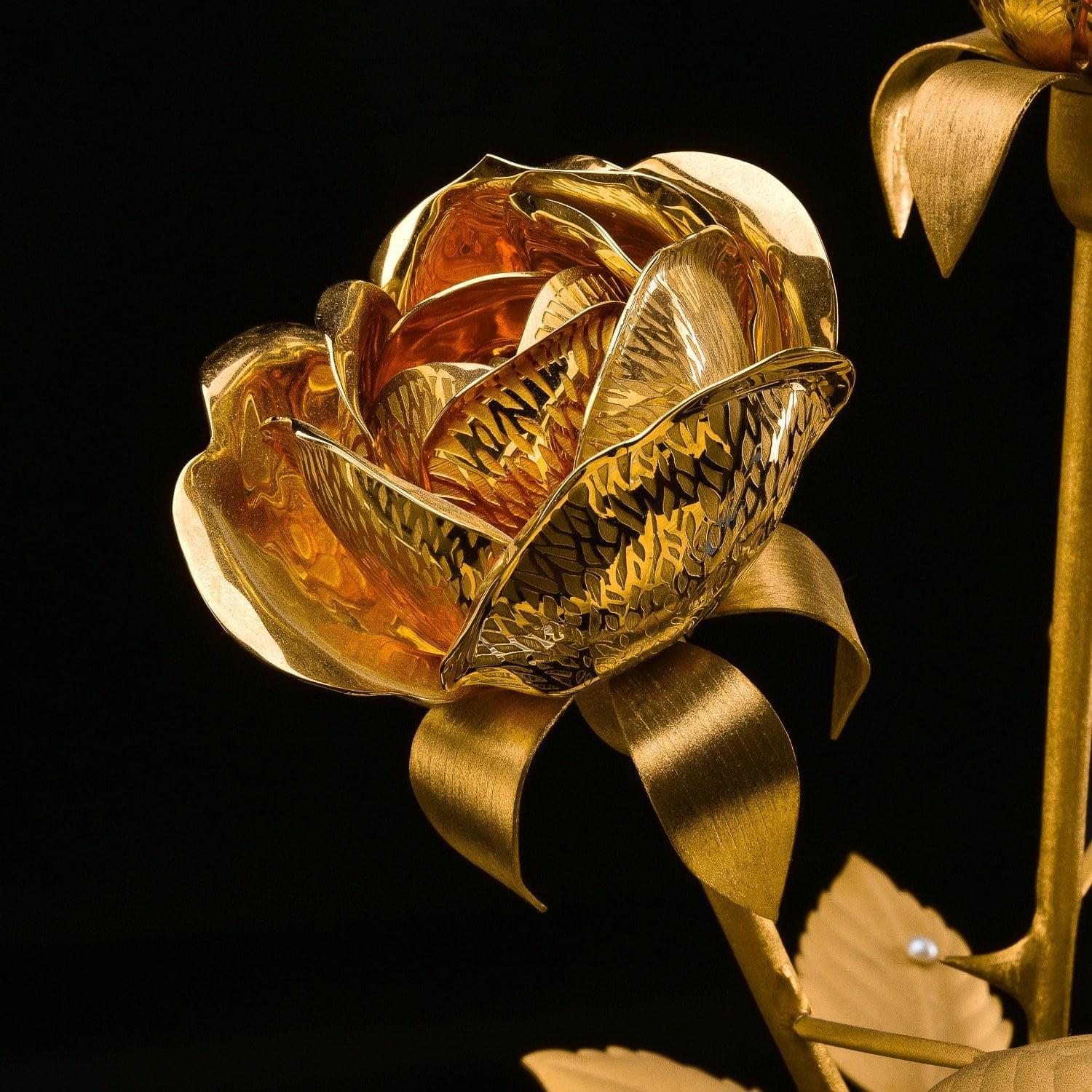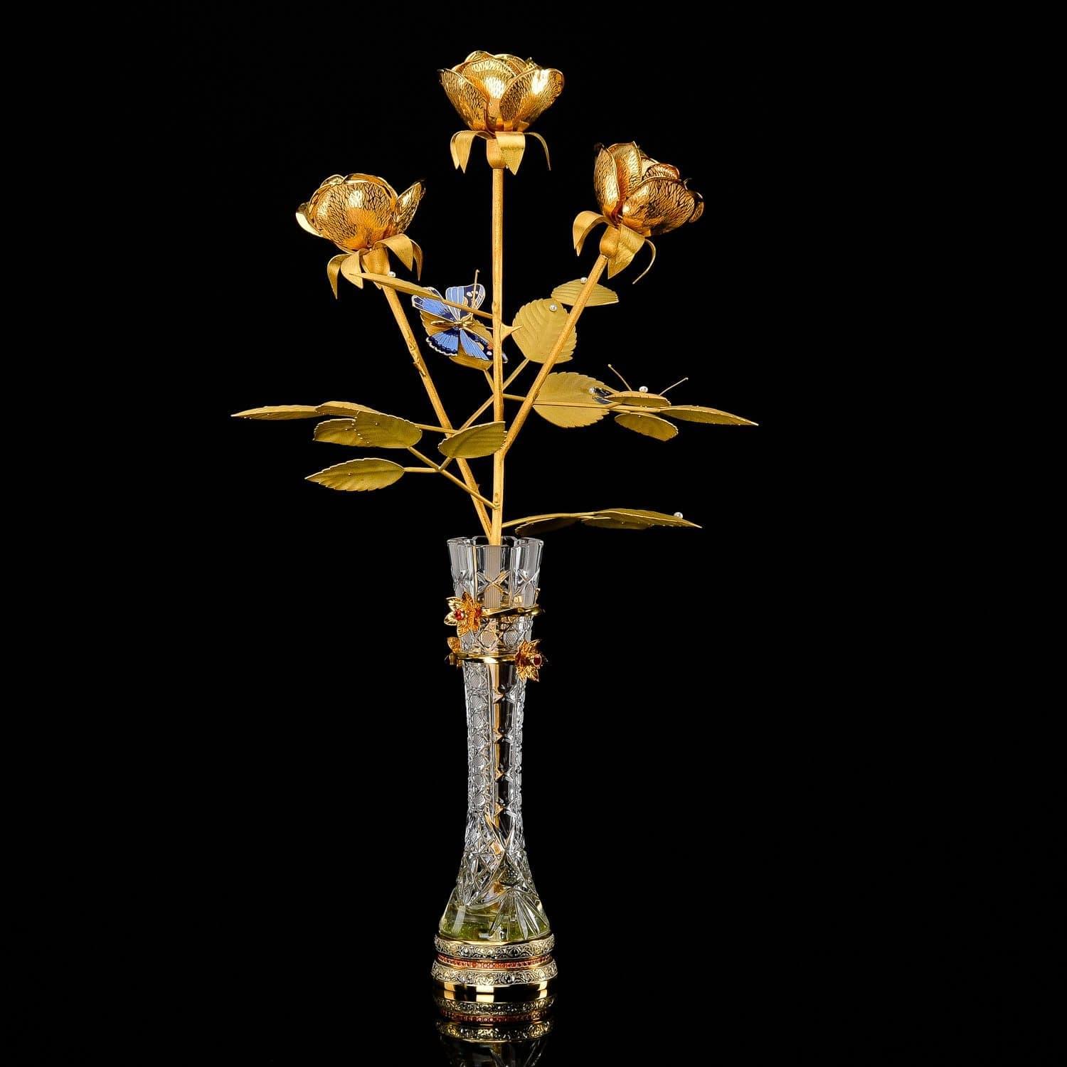 Розы в рамках композиции изготовлены токарем по металлу из металлического медного сплава, латуни. При оформлении их поверхностей применялись техники Златоустовской гравюры на металле. Такие, как рисовка кистью, гравировка иглой по лаку, травление, гравировка резцом, полировка и роспись эмалевыми красками (см. крылья бабочки). Поверхности тонированы золотом 999,9 и инкрустированы полудрагоценными камнями - сияющими, гранеными фианитами, украшены природным минералом, жемчугом.