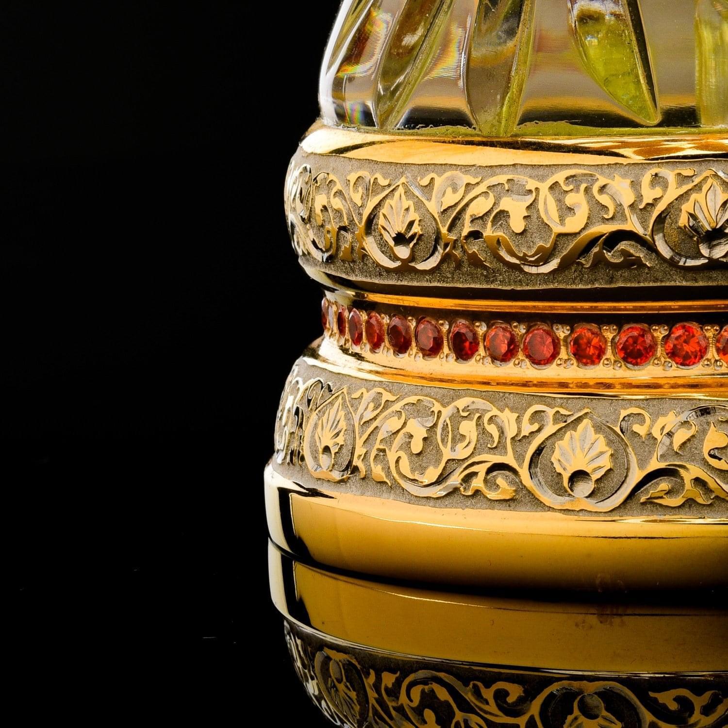 Букет золотых роз подан в ваз из хрусталя ручной работы. Хрусталь - лучшее стекло. 24% окиси свинца или бария в составе обеспечивают материалу новые свойства и преимущества по сравнению с простым стеклом. Это прочность, прозрачность, звонкость и прочие эстетические свойства. Хрустальное стекло как лед, но не тает. Сверкает, как горный хрусталь, но - по доступной цене.