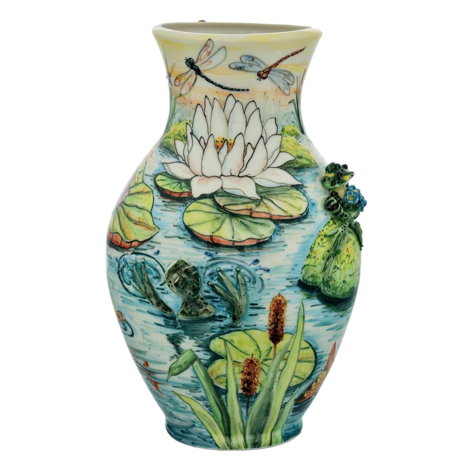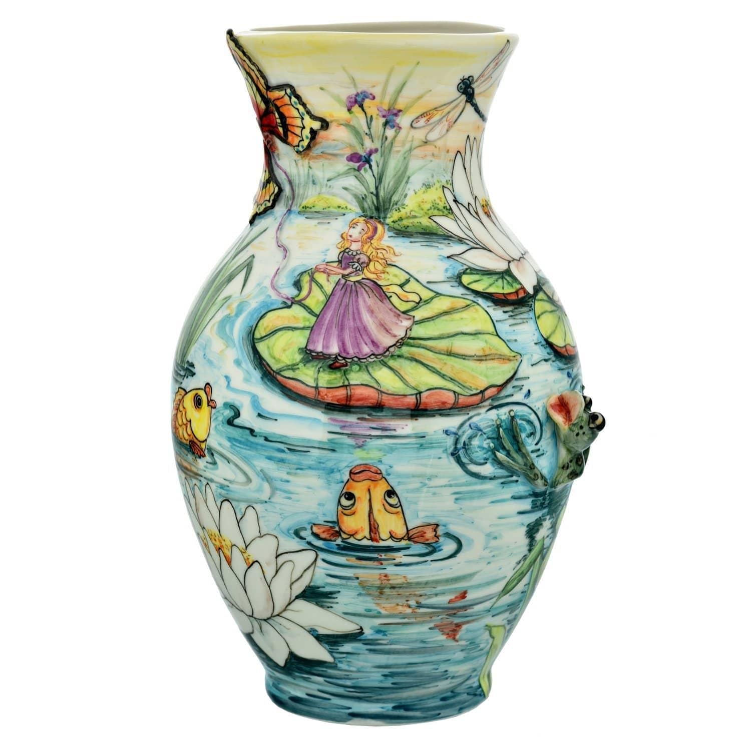 Ваза выполнена из русского "белого золота" - белого фарфора. Она украшена авторским рисунком в нежной цветовой палитре и лепными фигурками в виде задорных зеленых лягушек. В центре внимания - белокурая девочка-Дюймовочка в розовом платье, стоящая на листе кувшинки. Ей радуются рыбки, лягушки и бабочки со стрекозами. Рассматривать этот эксклюзивный интерьерный аксессуар можно длительное время и с большим интересом. Фарфоровая ваза ручной работы "Дюймовочка" будет прекрасным подарком для мамы по случаю Дня рождения ее ребенка или девушки, любящей все яркое и оригинальное. Ваза отлично смотрится с цветами и будет прекрасным дополнением к букету.