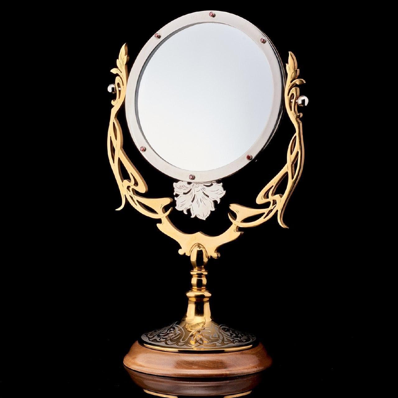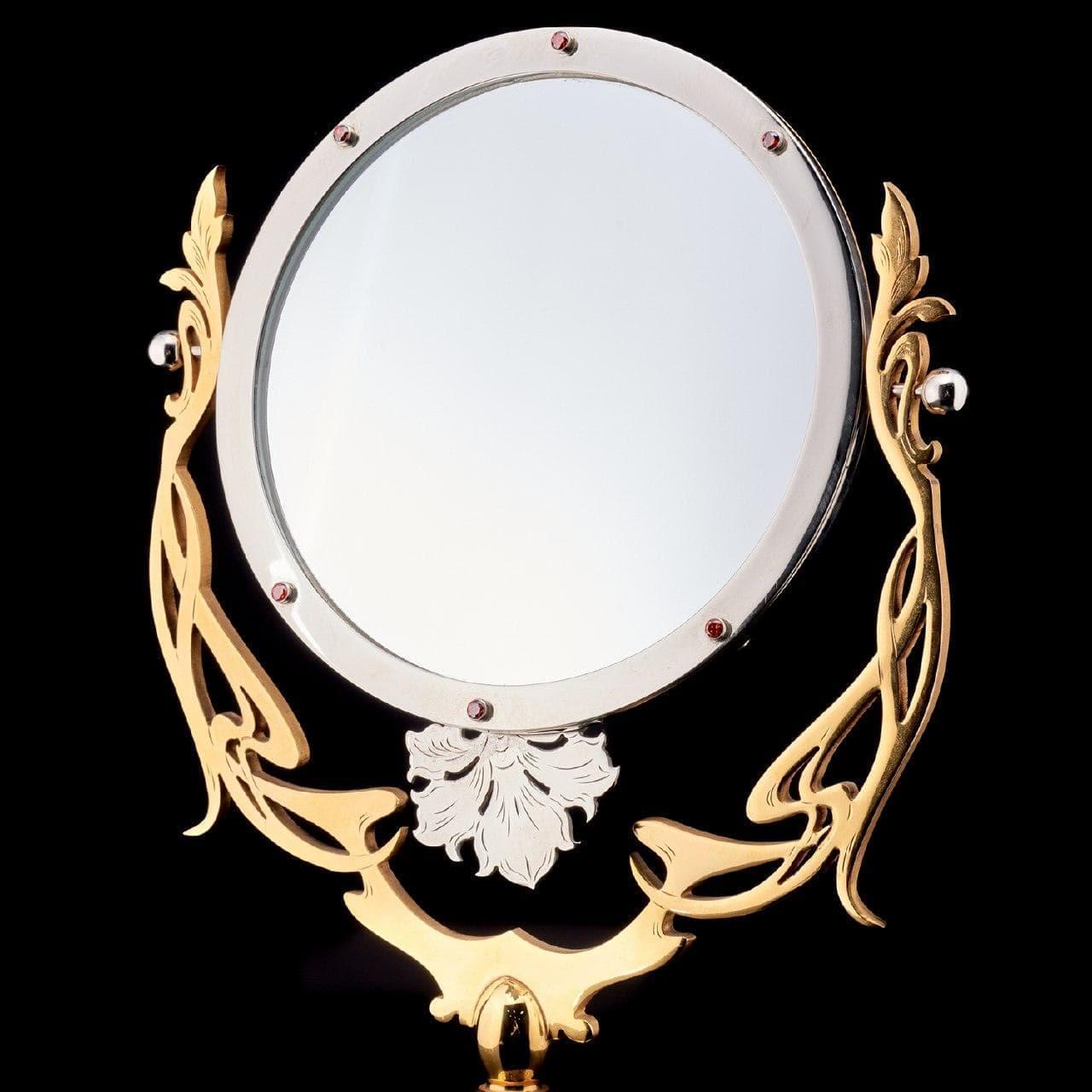 С зеркалами связаны интересные истории. Древнейшим зеркалам 7000 лет. Археологи считают первыми образцами найденные в Турции куски полированного обсидиана (стекло вулканического происхождения), но сквозь них не различались оттенки цвета. Изготавливали зеркала из олова, бронзы, горного хрусталя, меди, серебра, золота и камней. Они считались магическими предметами, порталами в иной мир. Все зеркала впитывают «энергетику» от прежних владельцев. Доказано, что дети узнают себя в отражении с 2 лет. Зеркала, отражающие звуковые волны, известны как акустические. С их помощью в Великобритании во время Второй Мировой войны обнаруживали звуковые волны, поступающие от вражеской авиации, до появления радара. Зеркало в полный рост перед входом в дом защитит его от негативной энергии. Оригинальная работа мастеров Златоуста. Этапы работы: ковка, токарные работы, рисовка кистью, гравировка иглой по лаку, травление, гравировка резцом, полировка, никелирование, золочение. В изделии использовались традиционные методы обработки и украшения Златоустовской гравюры на металле.