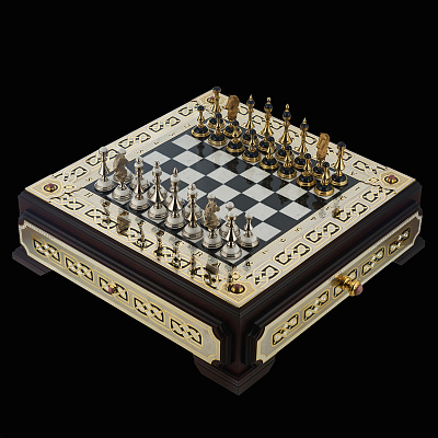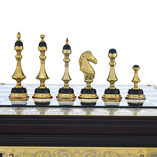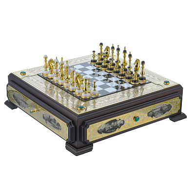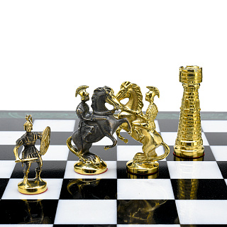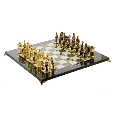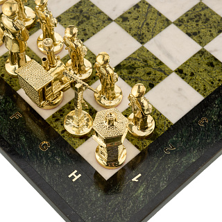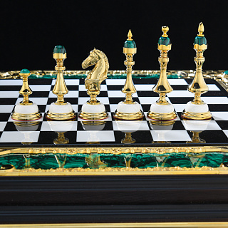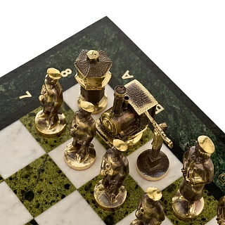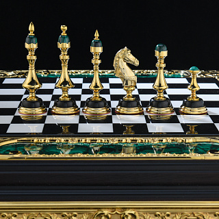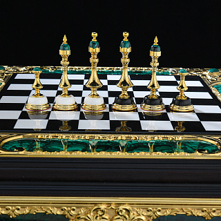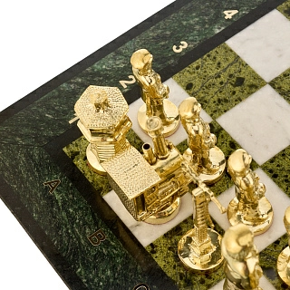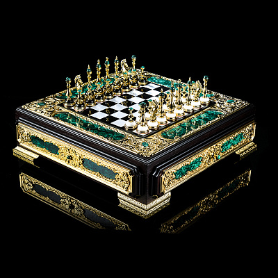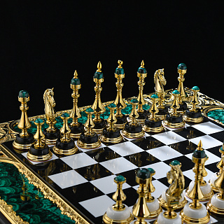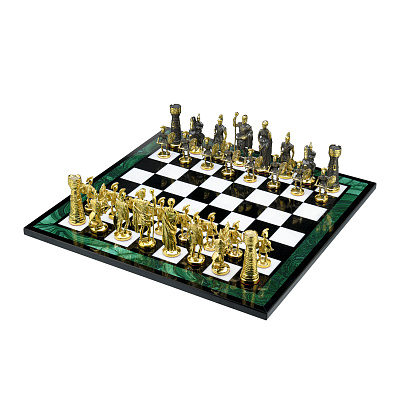 Шахматы «Баталия» в ларце из малахита 54х54 см. Златоуст