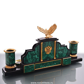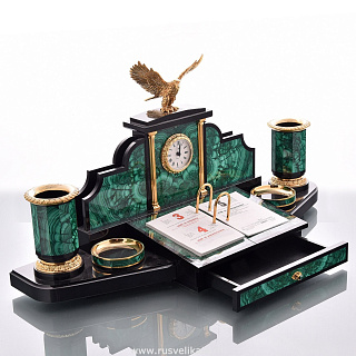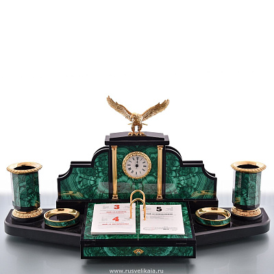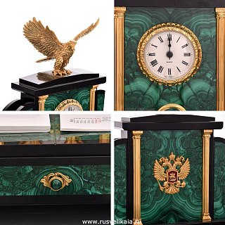 Часы настольные из малахита и латуни с позолотой «Г. Победоносец». Златоуст