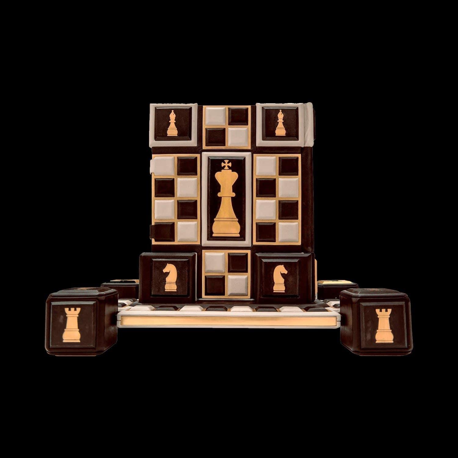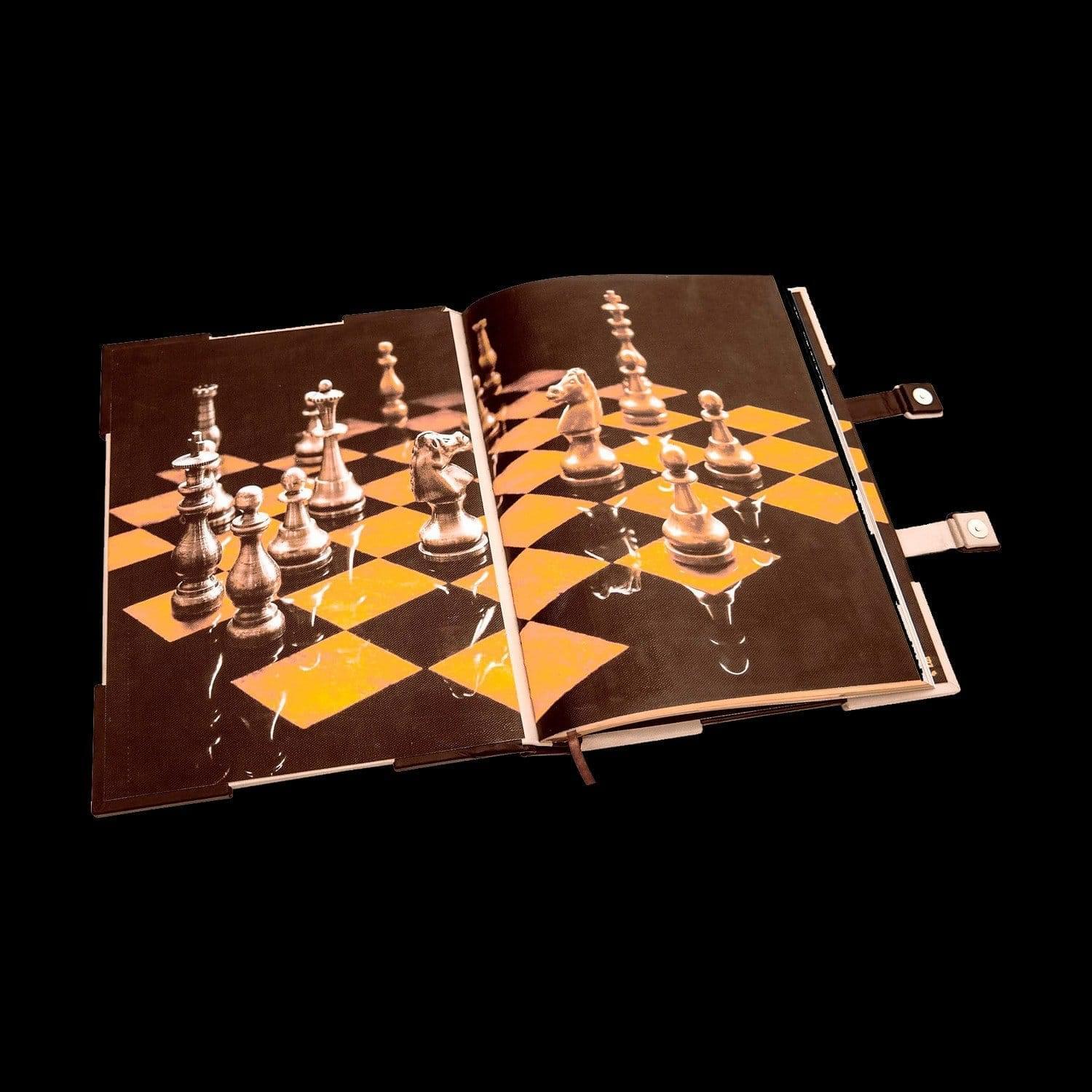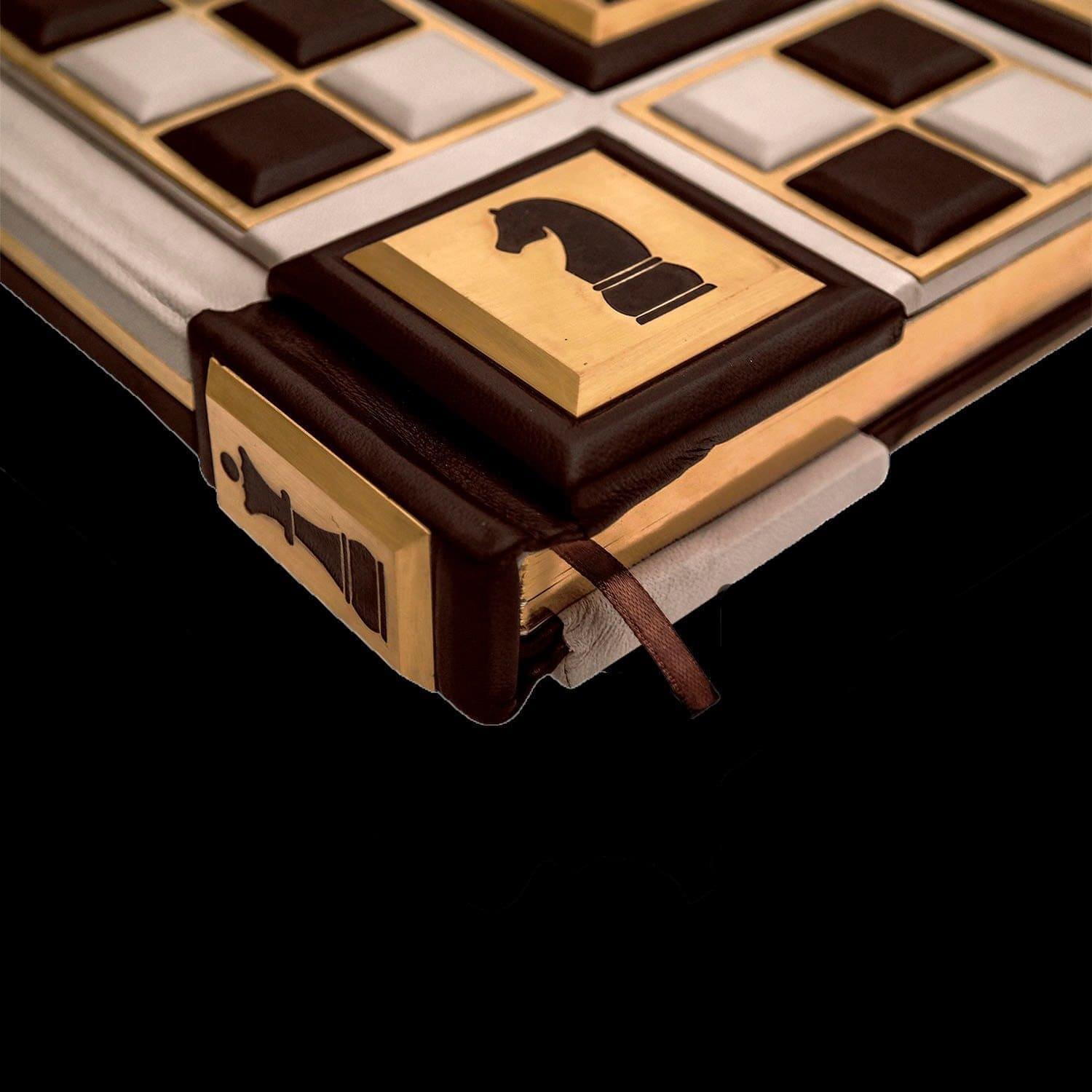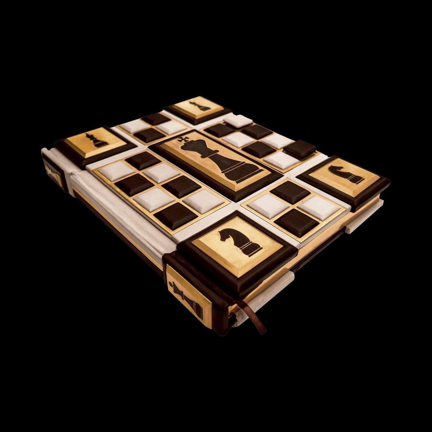 Книга предлагает обобщение современных исследований происхождения и распространения королевской игры, представляет основные вехи ее развития. В ней рассказано об индийской и арабской игре, о первых профессиональных шахматистах, о сути игры и роли каждой фигуры в ней, о национальных школах, о легендарных мастерах и их партиях. Оформление: Составной переплет «Брадель», ручной работы, выполнен из комбинации натуральных кож (кожа теленка «Robbat Parle», кожа «Marrone») производства итальянской кожевенной фабрики «Carisma». Двухуровневая обложка книги и подставка оформлена композицией художественного травления латуни. Составной форзац с фотопечатью, на кожаной слизуре. Кожаный каптал и шелковая лента-ляссе. Обрез книги вручную полирован и позолочен. Характеристики: Сертификат. Бархатный чехол. Количество страниц – 208 стр. (мелованная бумага, цветная печать, иллюстрации). Формат книги – 255х315х50 мм. Вес книги – 4,2 кг. Формат комплекта - 450х380х285 мм. Вес комплекта – 9,2 кг.