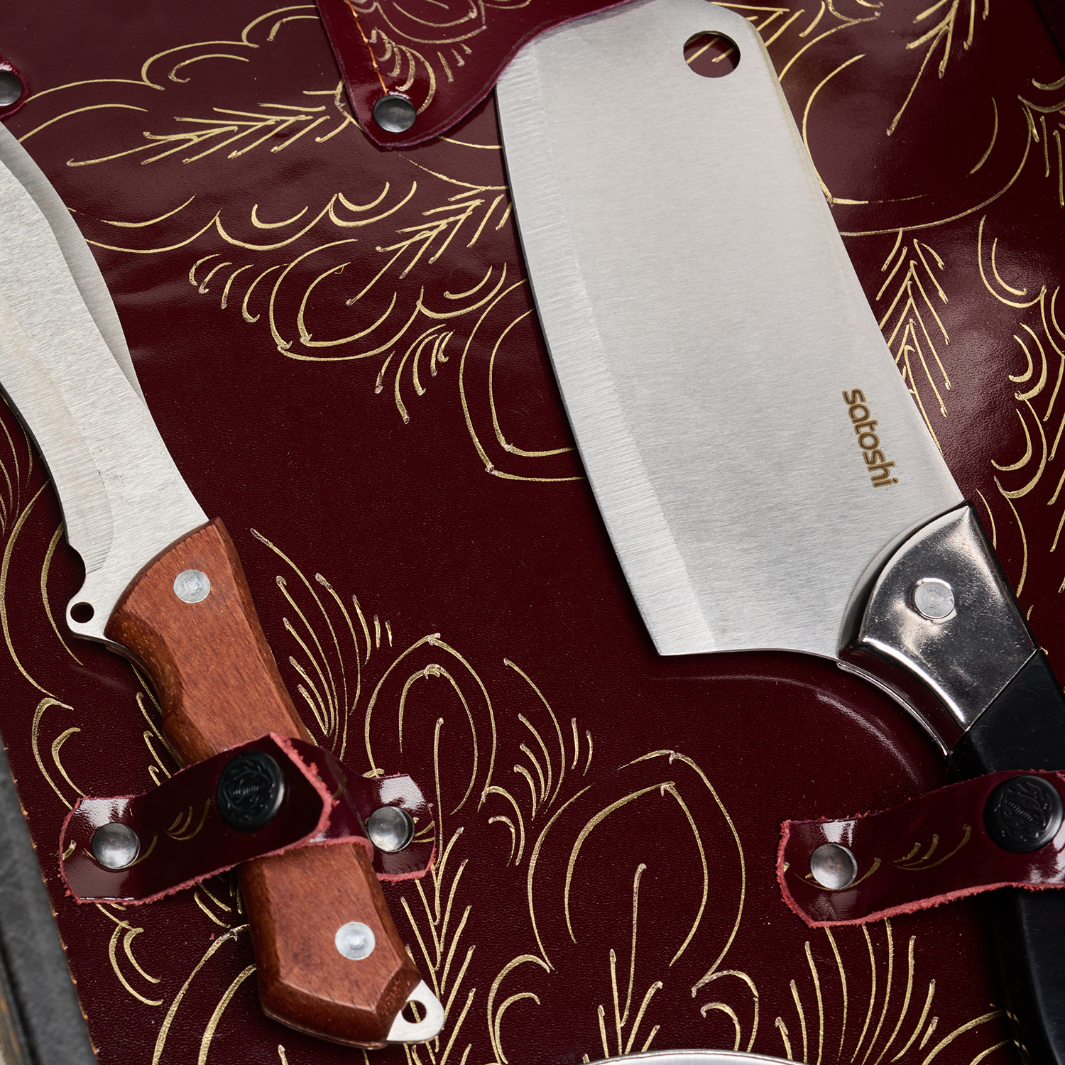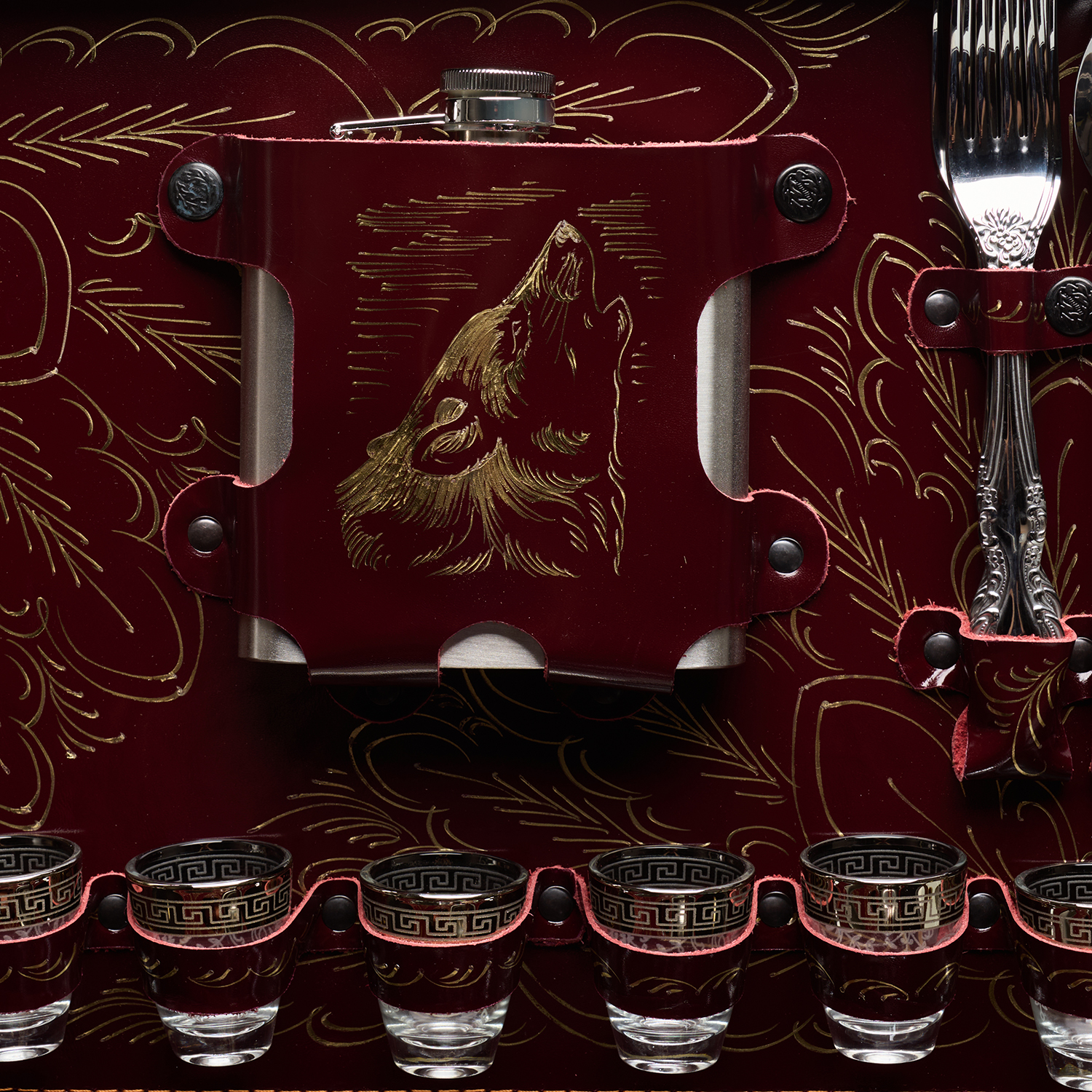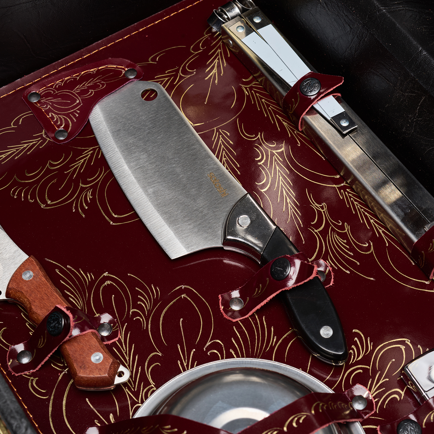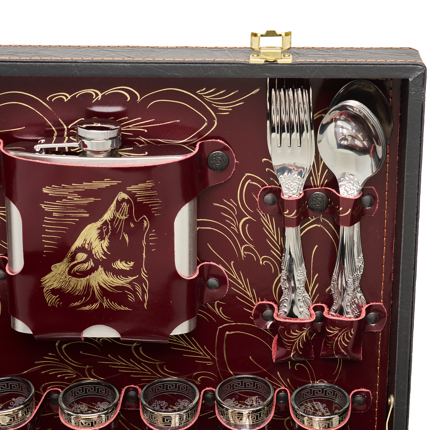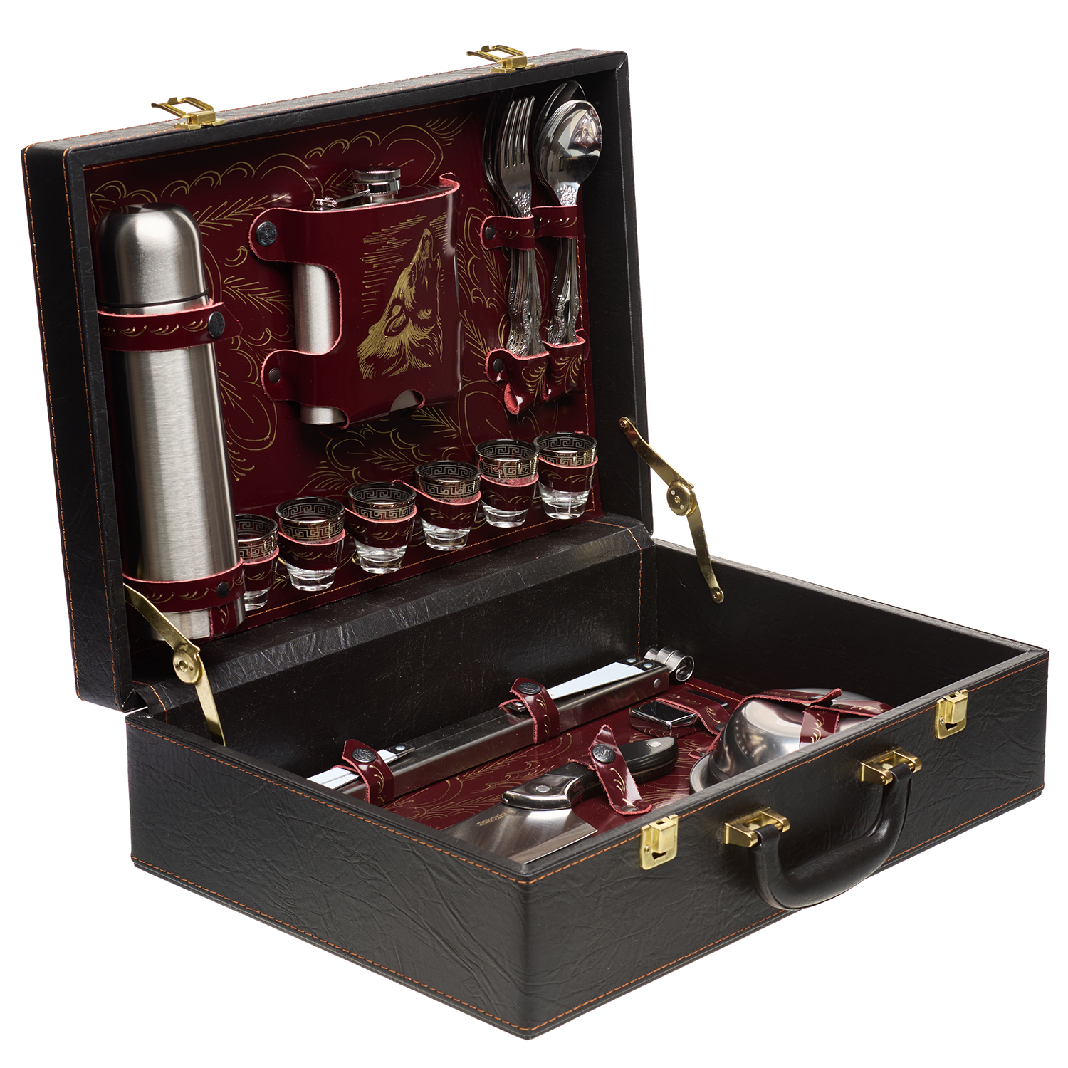Комплектация: термос 1 шт., фляга 1 шт., вилка 6 шт., ложка 6 шт., стопка 6 шт., мангал 1 шт., шампур 6 шт., тесак 1 шт., нож 1 шт., миска 6 шт., зажигалка 1 шт.